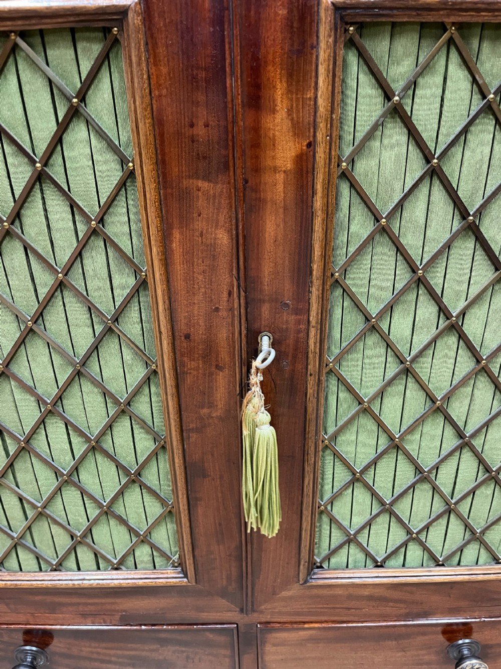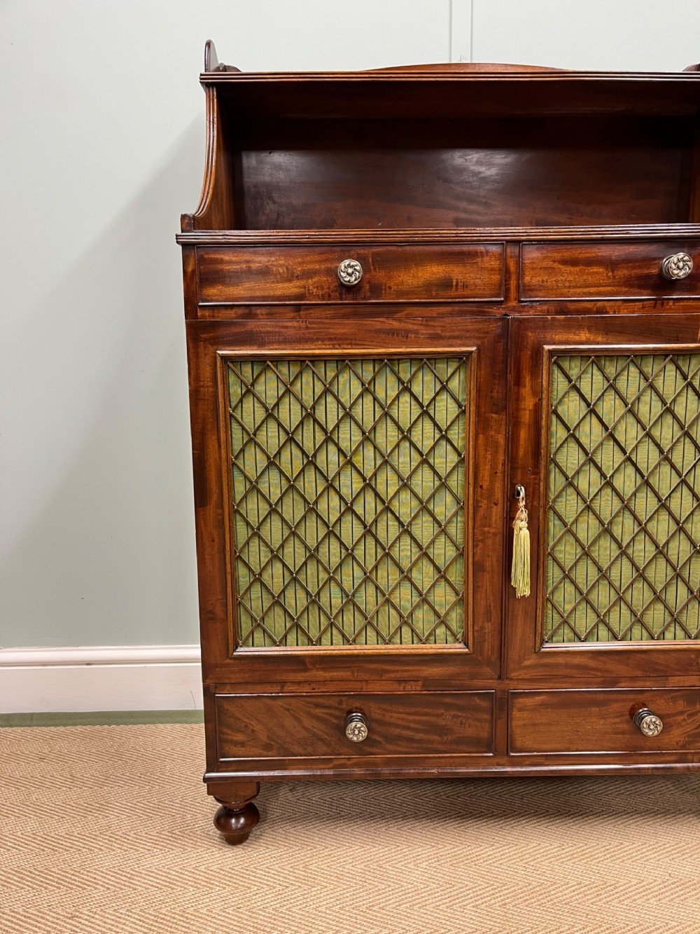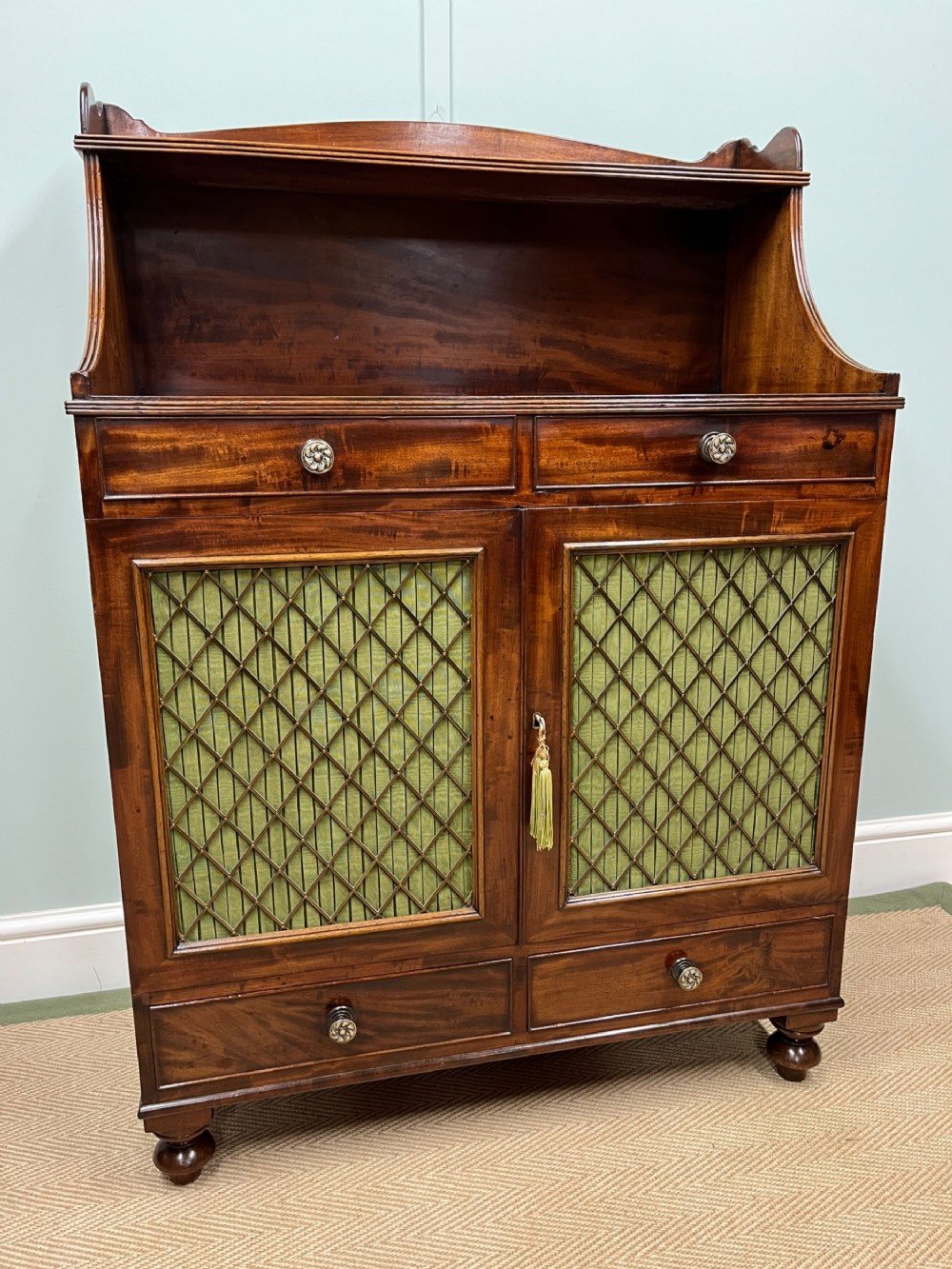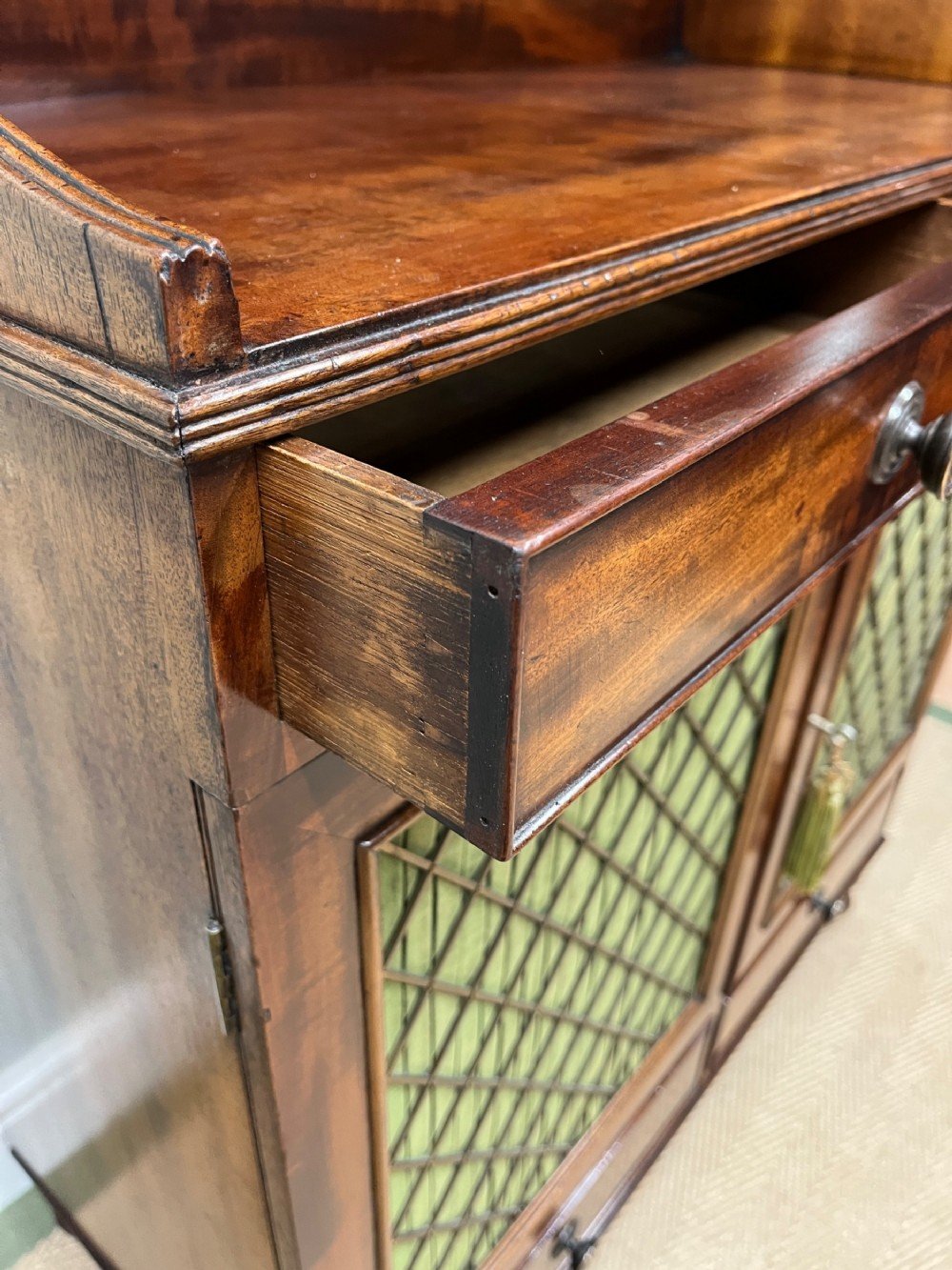A really lovely quality small scale early 19th century mahogany chiffonier. With bronzed grill and pleated silk doors.
