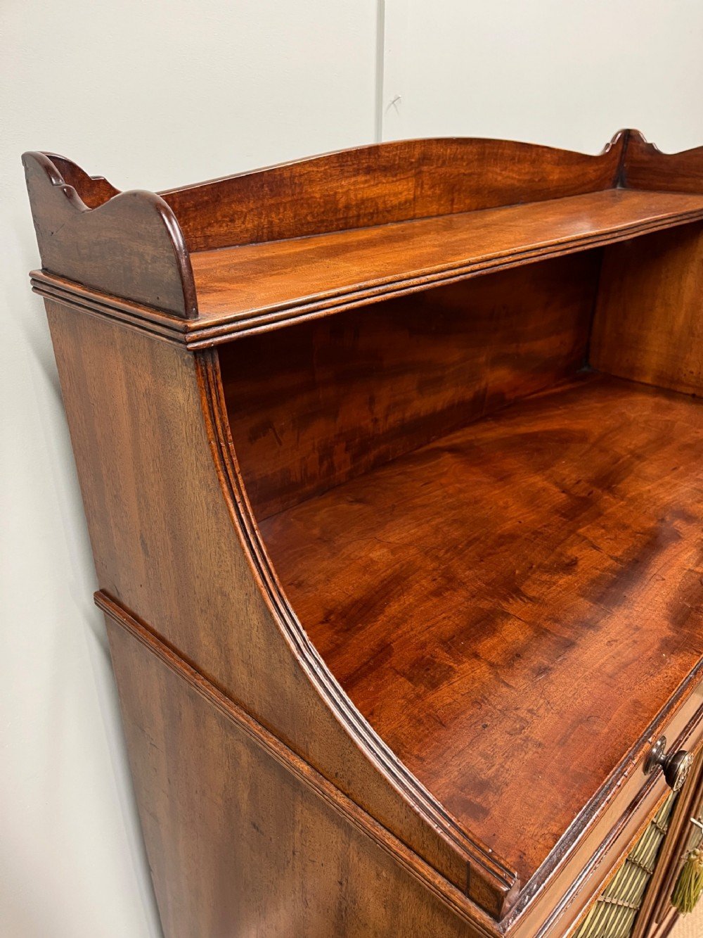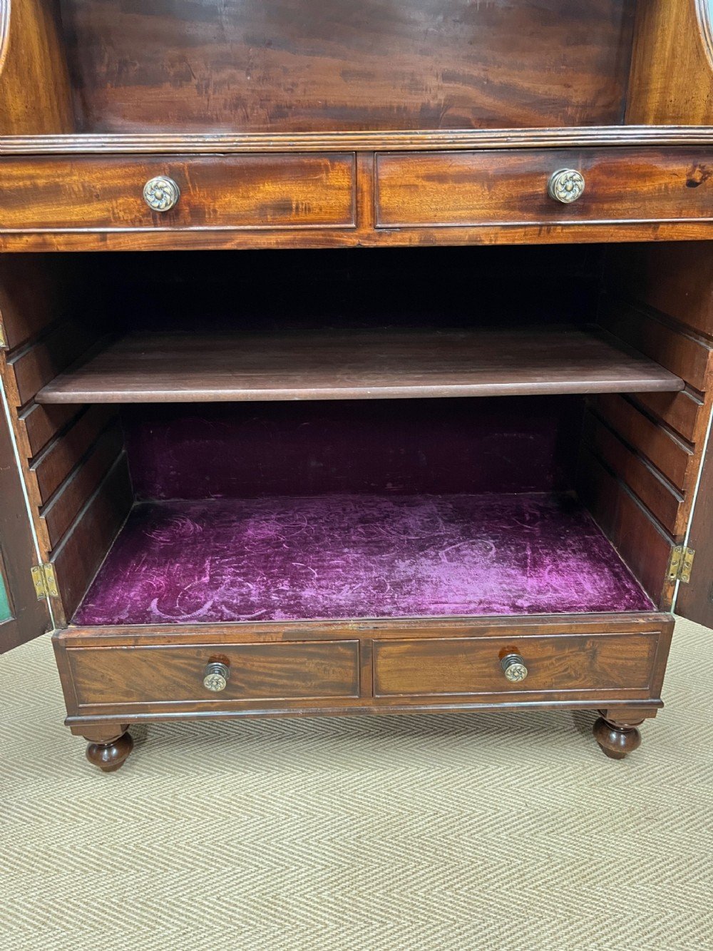 With an unusual configuration of 4 drawers as well as an ample cupboard. Lined with original silk velvet. Beautiful colour to the mahogany.