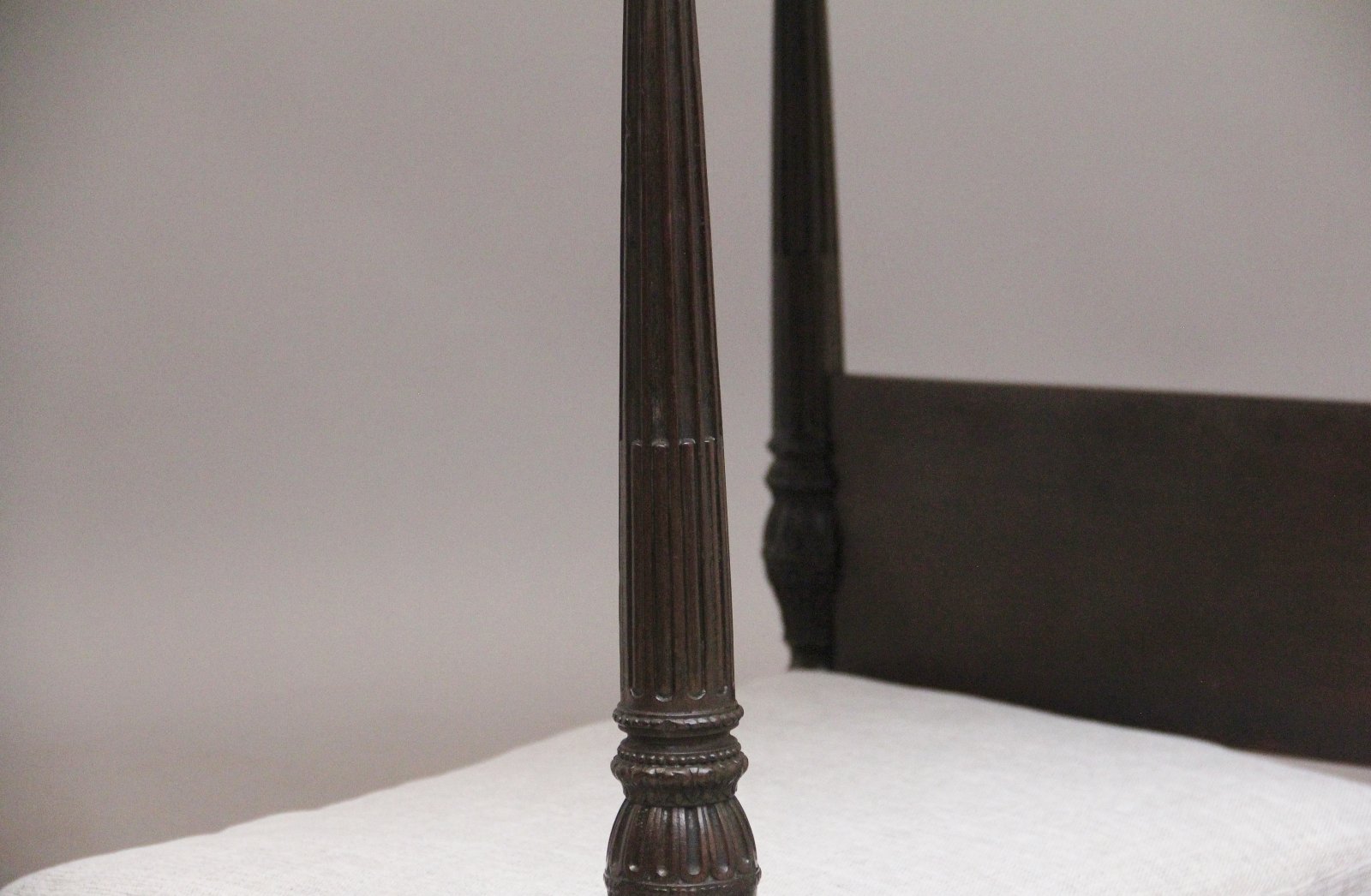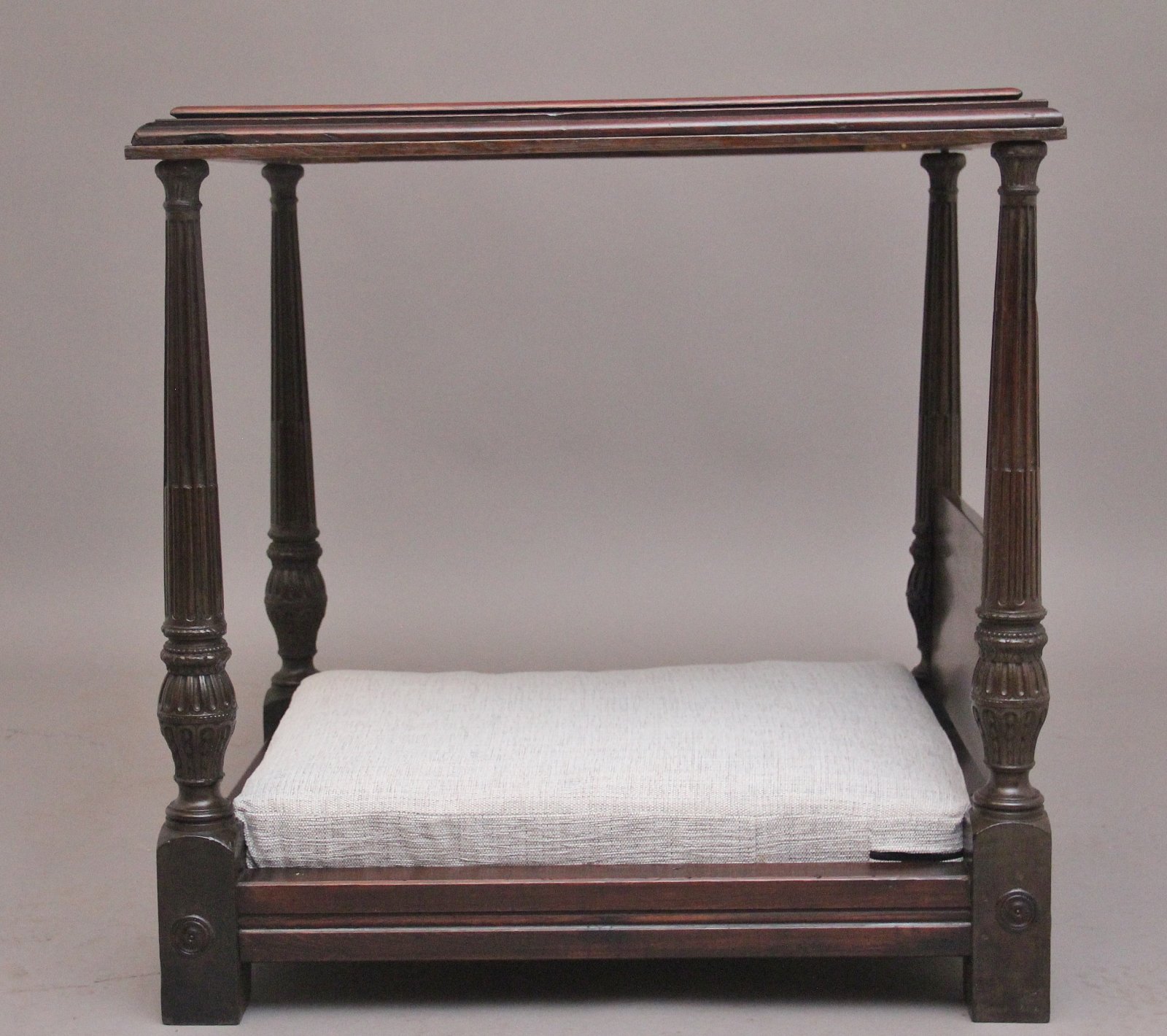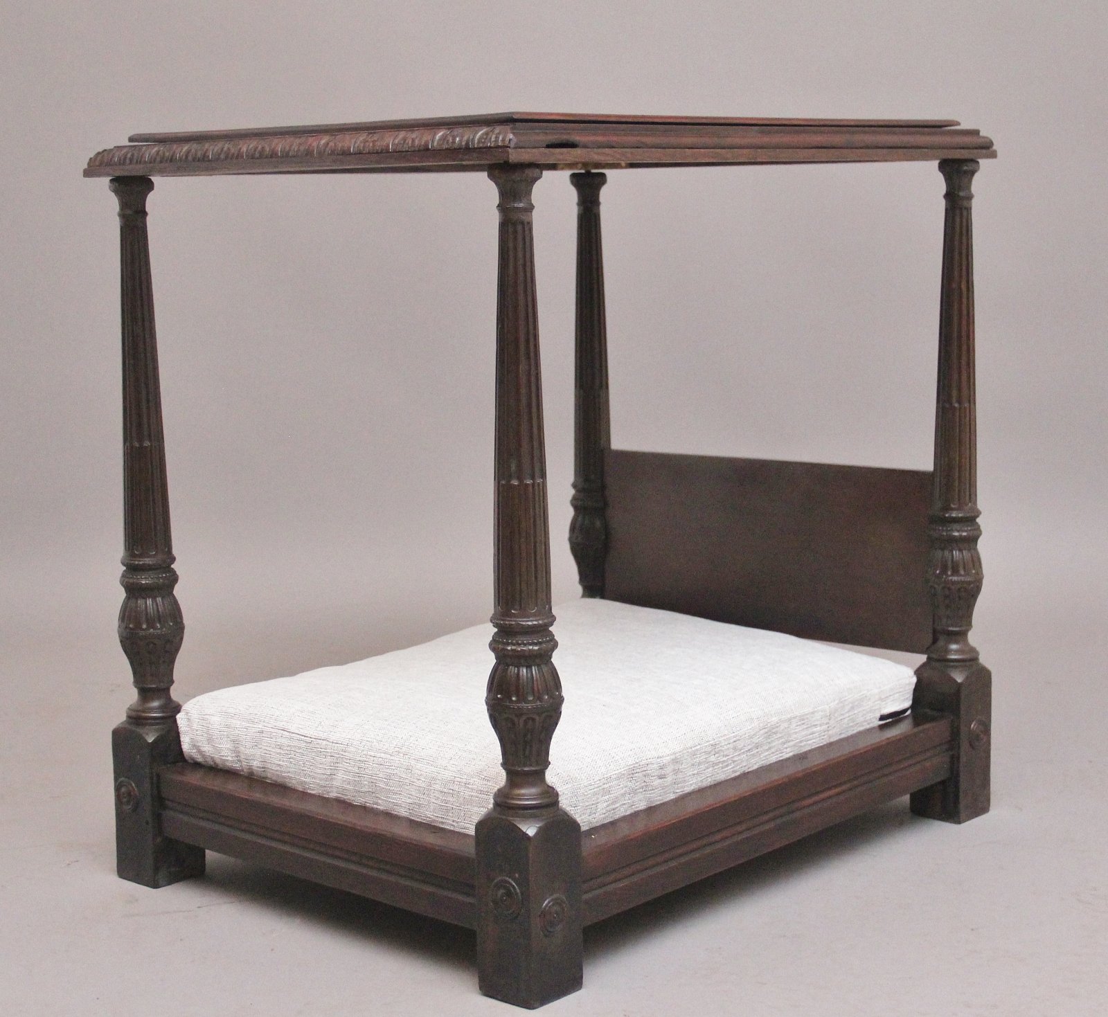 19th Century carved mahogany four poster bed for a dog or doll, the canopy having a gadrooned moulded edge supported on four turned and fluted tapering columns, having a headboard and recently upholstered drop in mattress. Circa 1890.