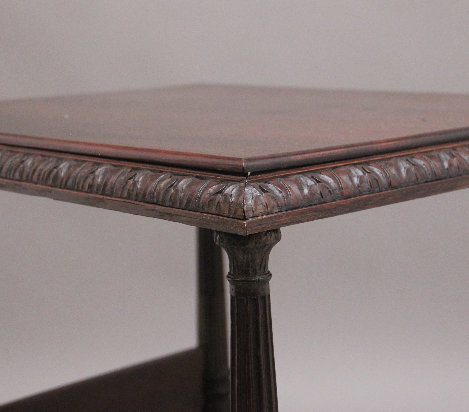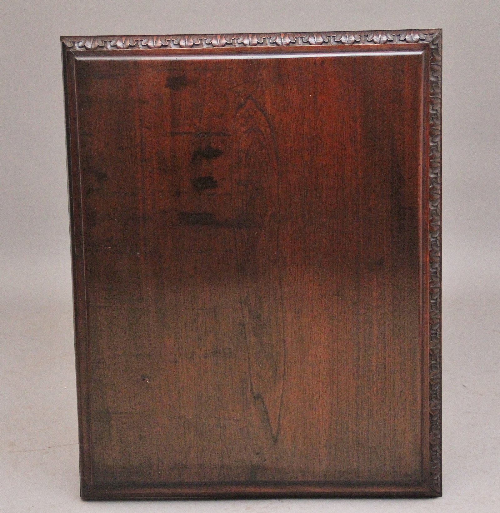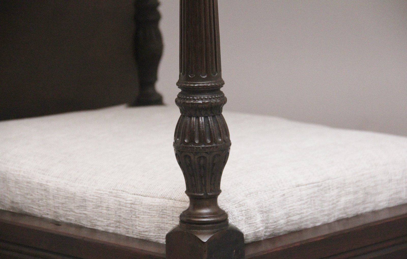 19th Century carved mahogany four poster bed for a dog or doll, the canopy having a gadrooned moulded edge supported on four turned and fluted tapering columns, having a headboard and recently upholstered drop in mattress. Circa 1890.