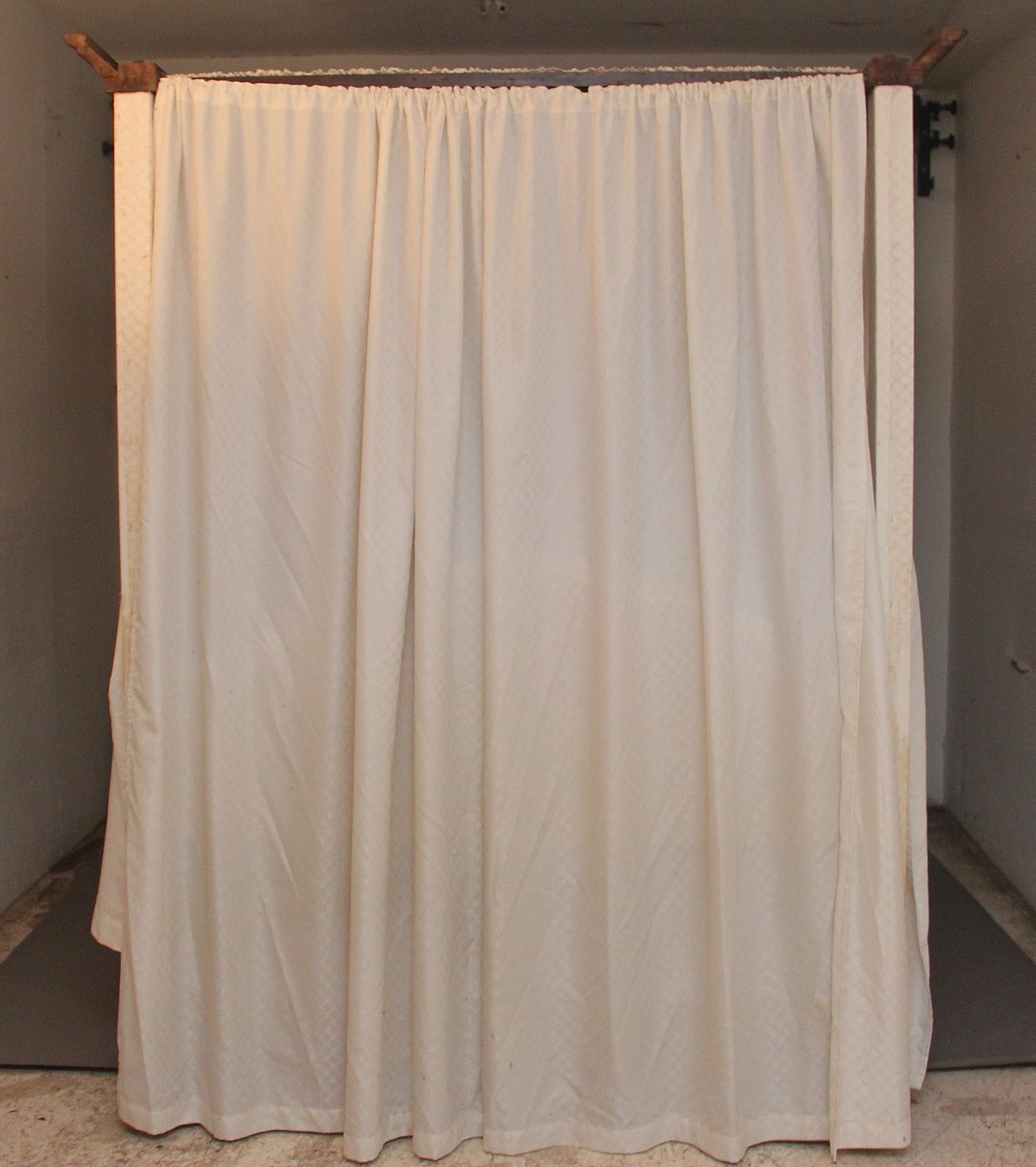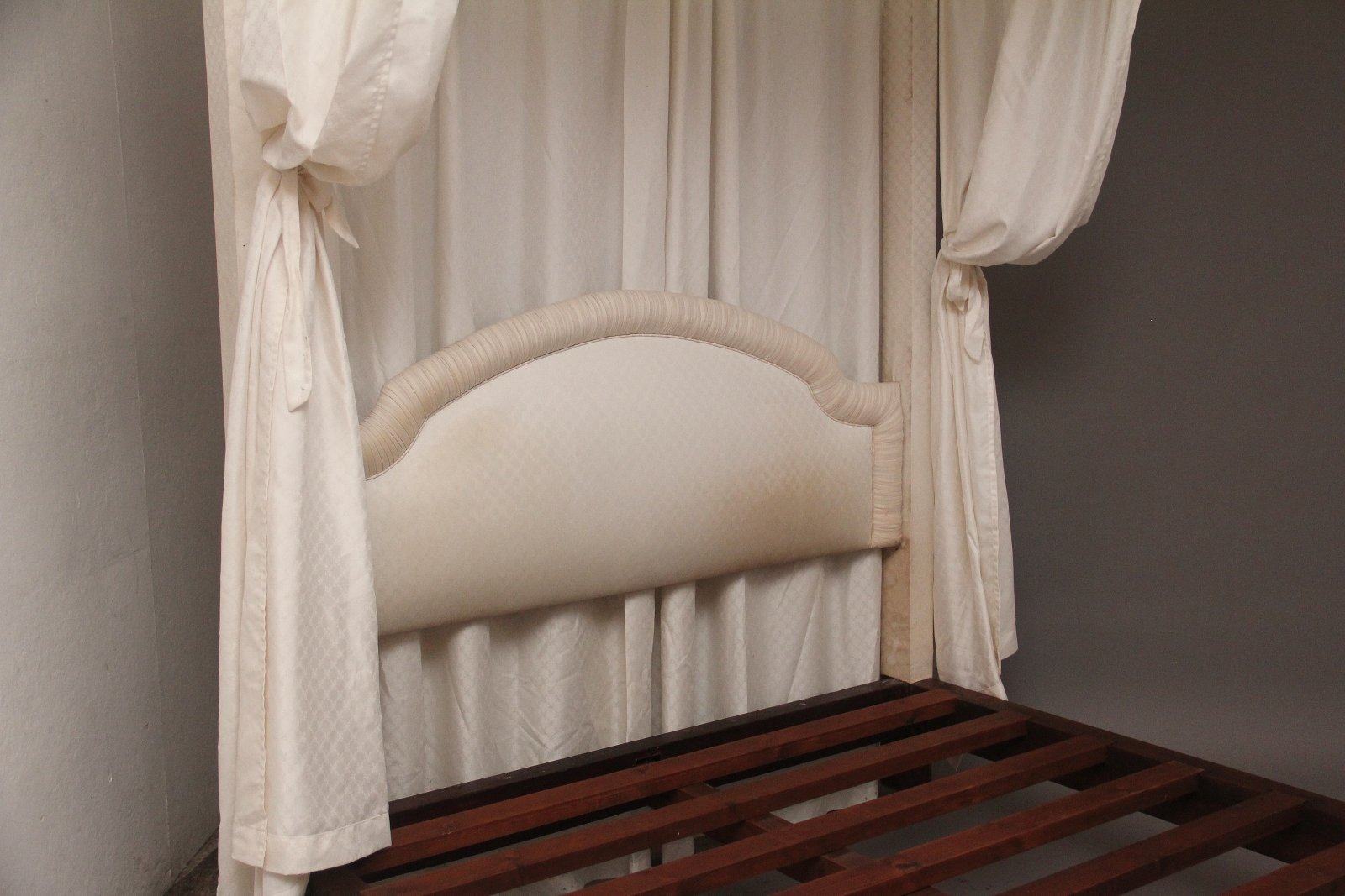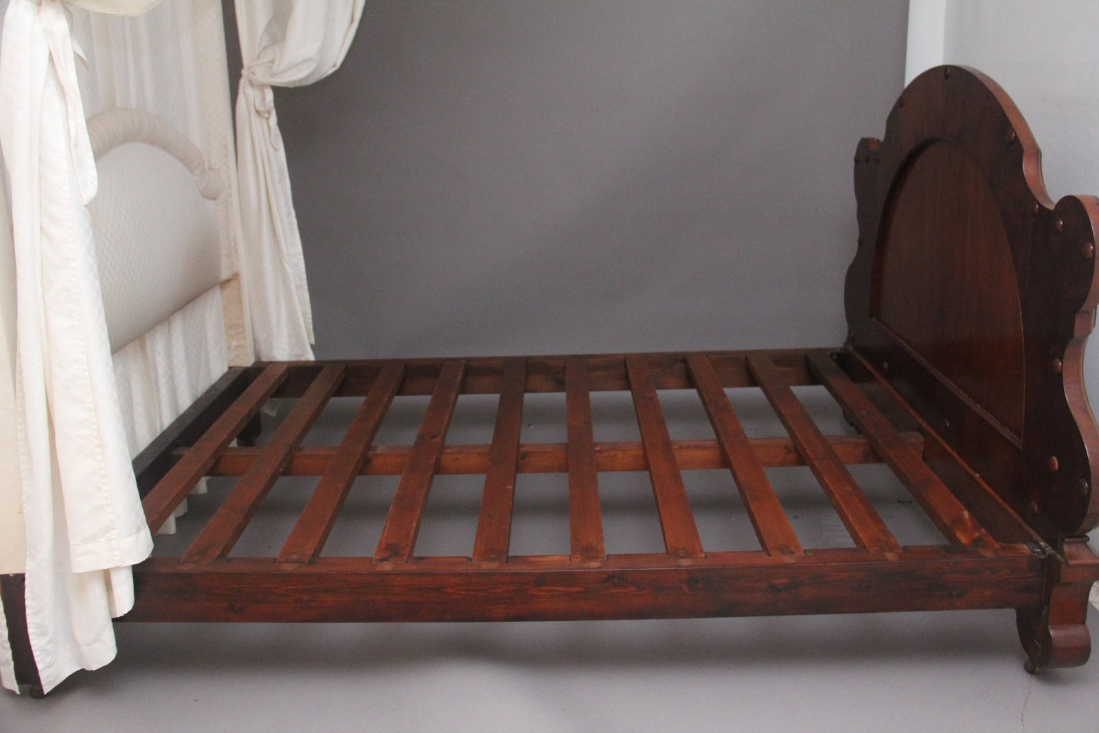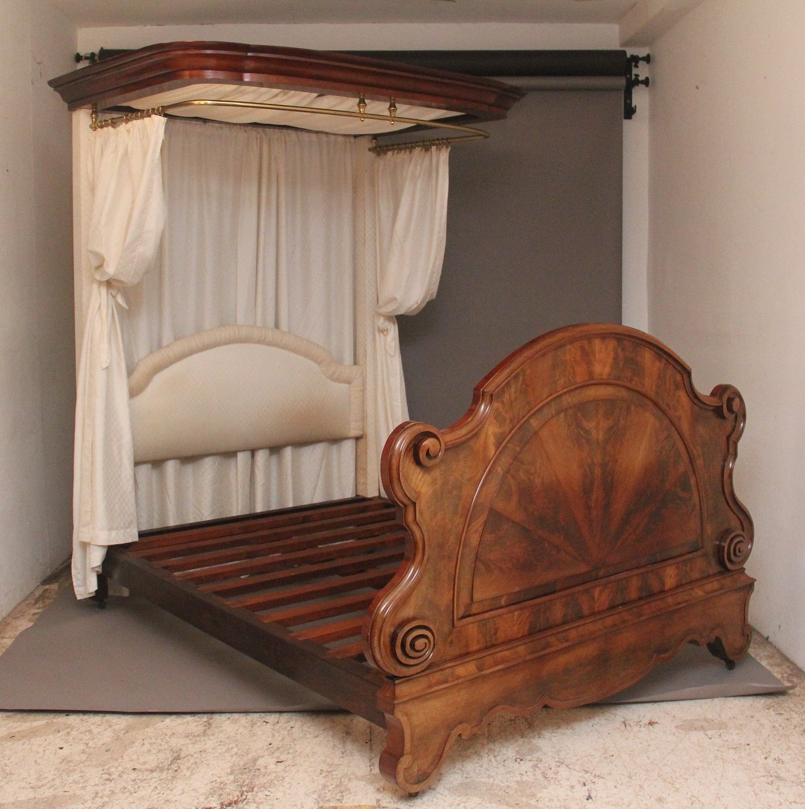 A lovely quality 19th Century mahogany half taster bed, the King size half tester bed having a decorative moulded and shaped canopy top fitted with a cream fabric, having a brass rail with hanging draped and tie backs, a decorative cushioned headboard with further hanging draped behind, having a wonderfully shaped and moulded footboard with carved scroll decoration and central semi circular panel, wonderful curl veneer throughout, shaped front feet and terminating on castors. Circa 1860.