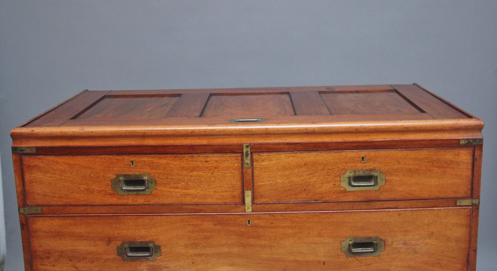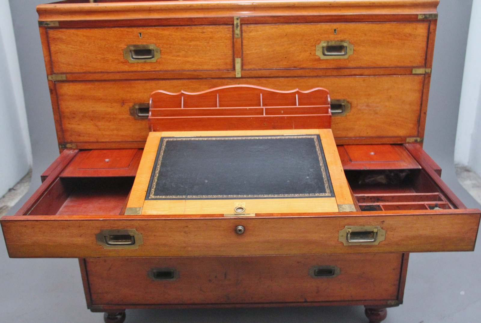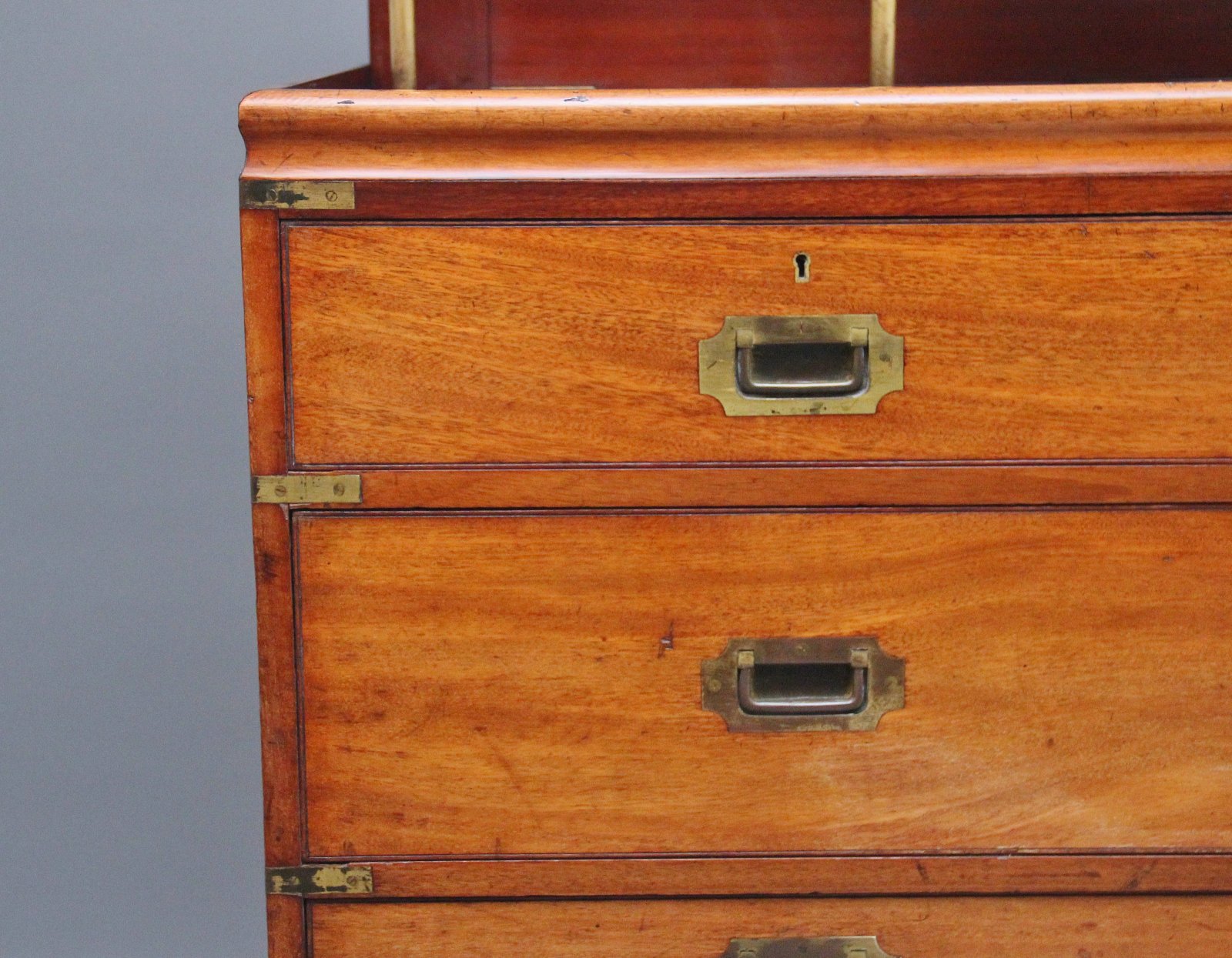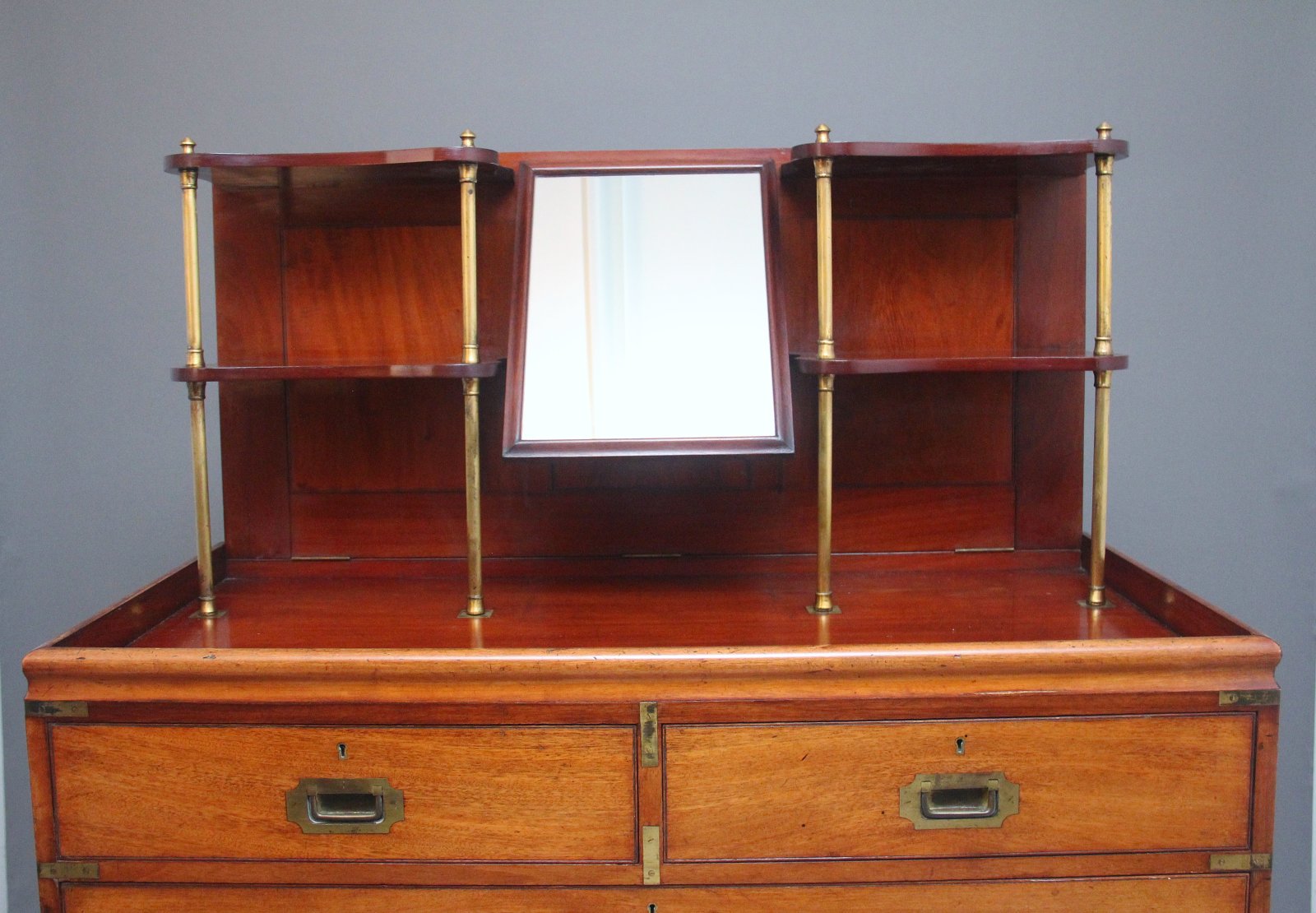 A unique and impressive 19th Century British mahogany military chest, the top lifts up to reveal a dressing station supported on brass rods, consisting of a mirror at the centre with shelves either side, the chest having a combination of two short over four long drawers with the original brass recessed handles, the central drawer pulls out to reveal a lift up writing slope with various compartments, slides either side of the writing slope that open to reveal further compartment space and a pen tray, supported on elegant turned feet. Circa 1840.