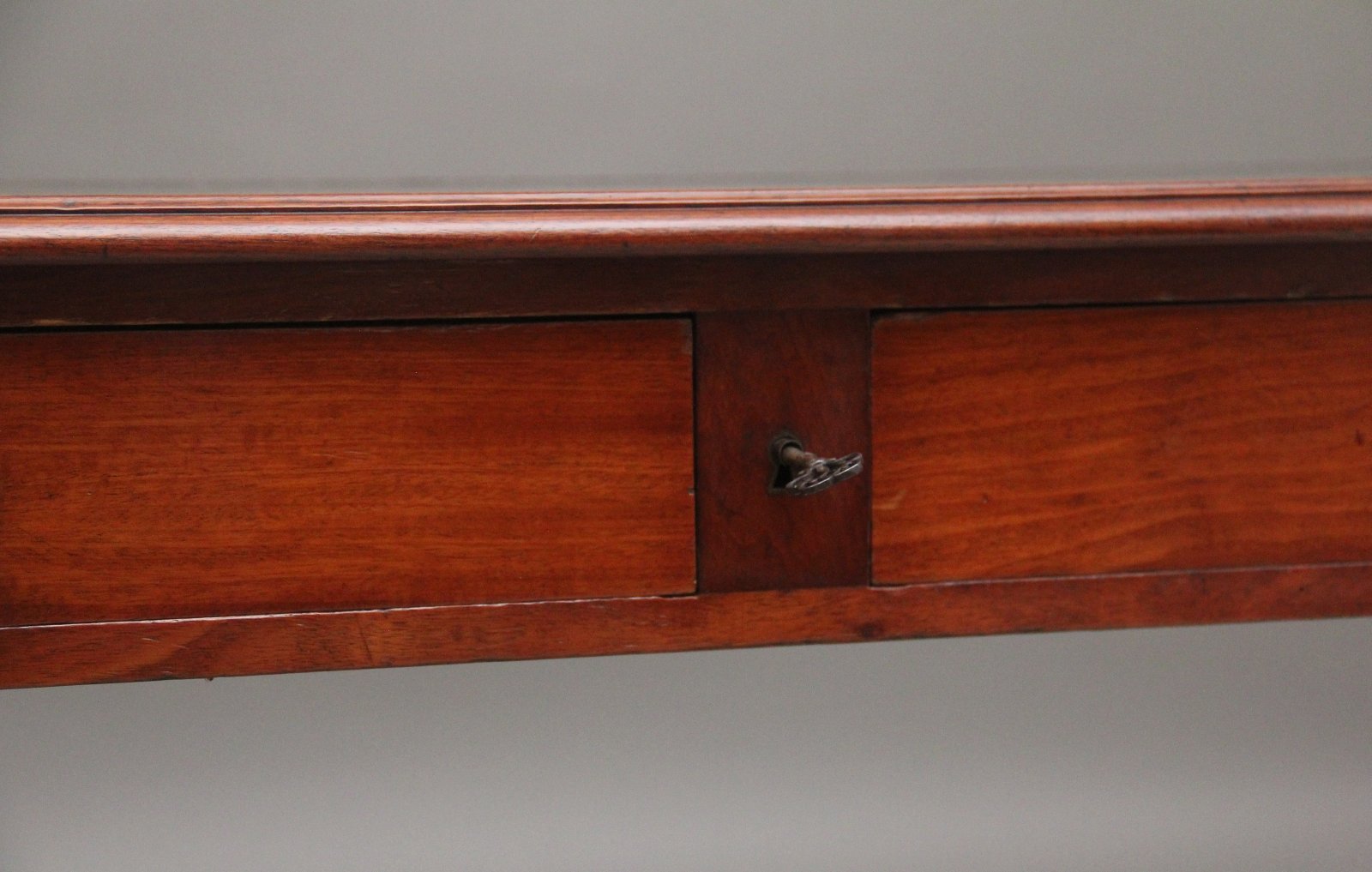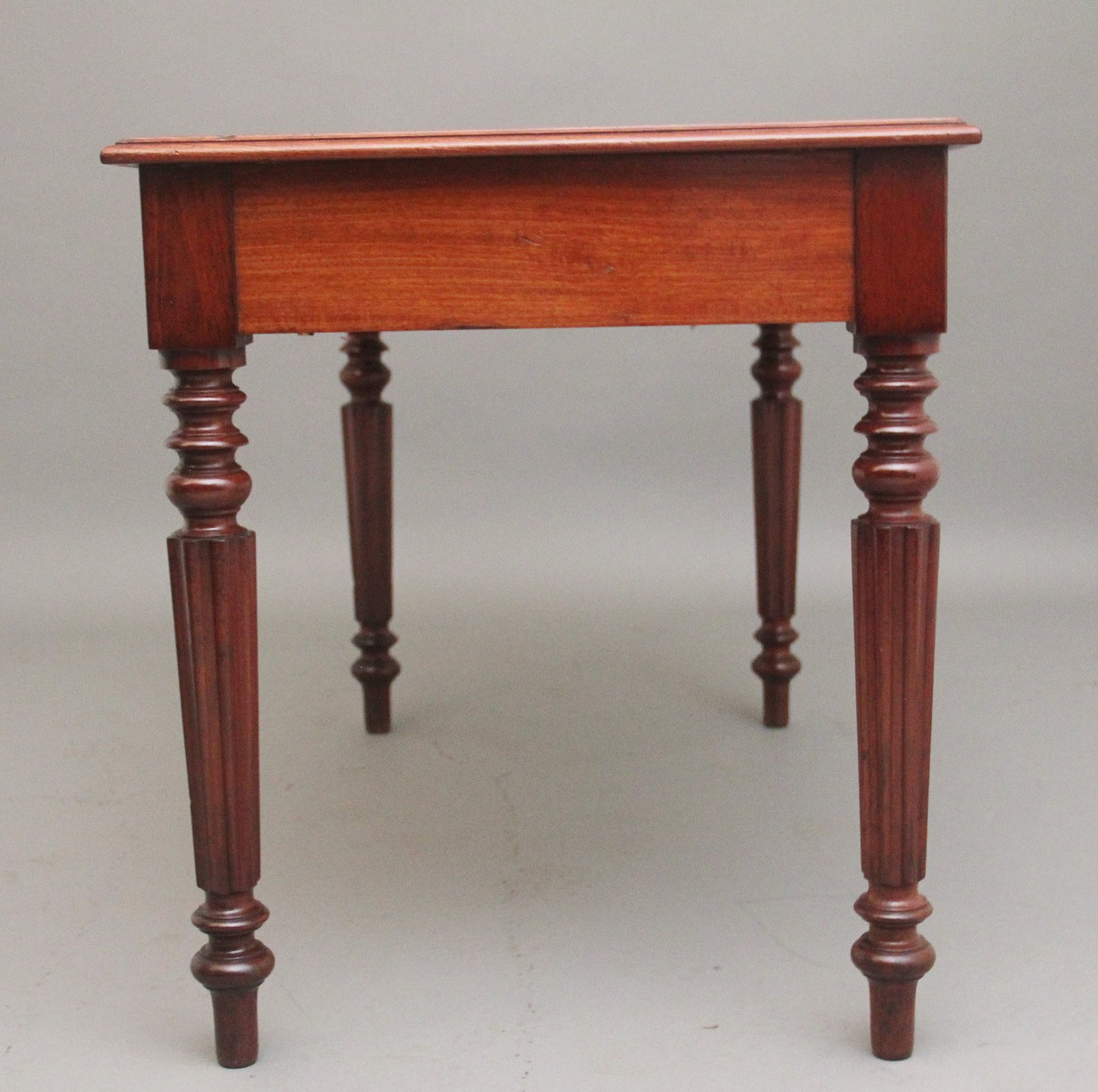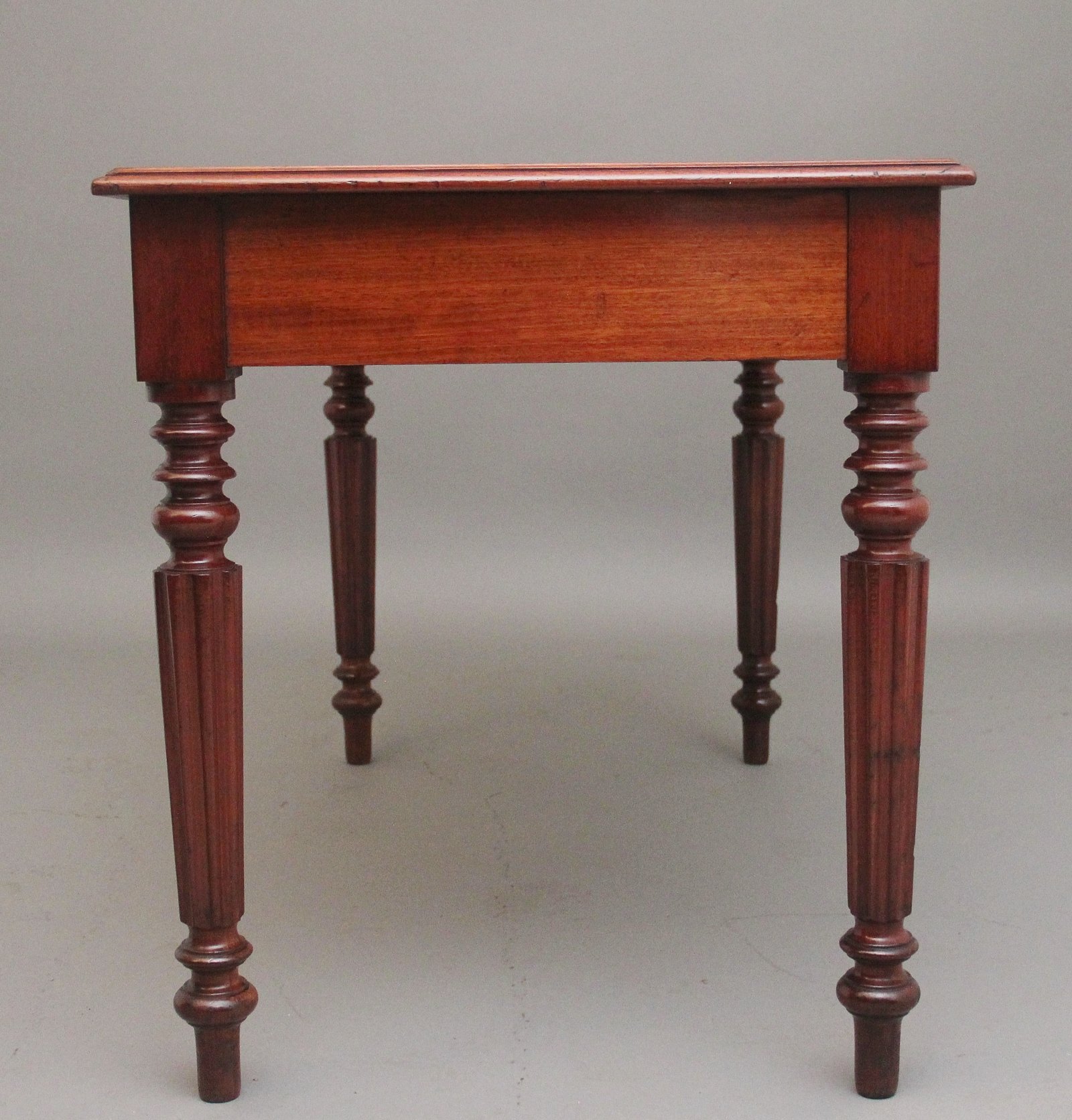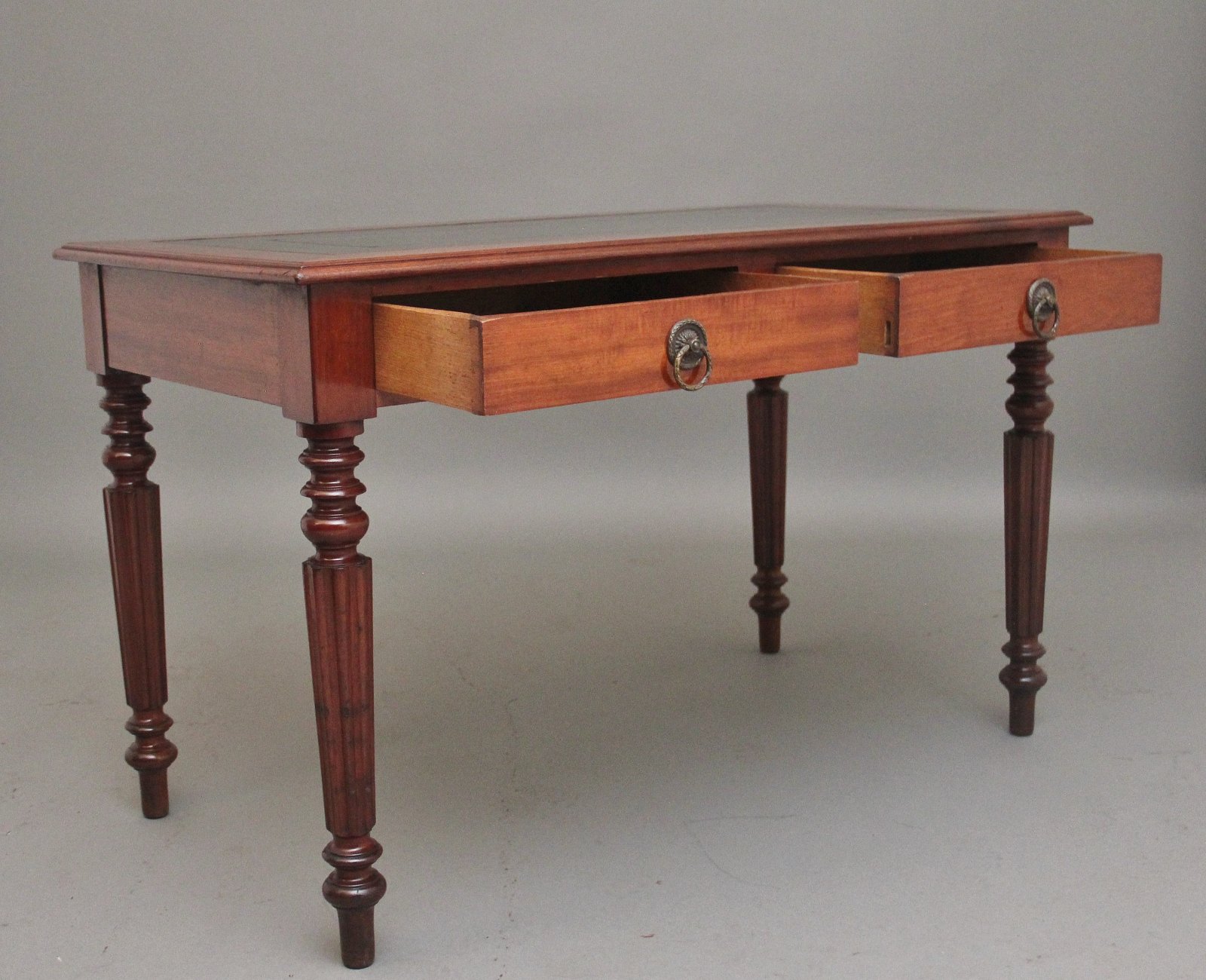 19th Century mahogany two drawer writing table, the moulded edge top having a black leather writing surface with gold and blind tooling, two oak lined drawers below with engraved brass ring handles, supported on turned and fluted legs. Circa 1840