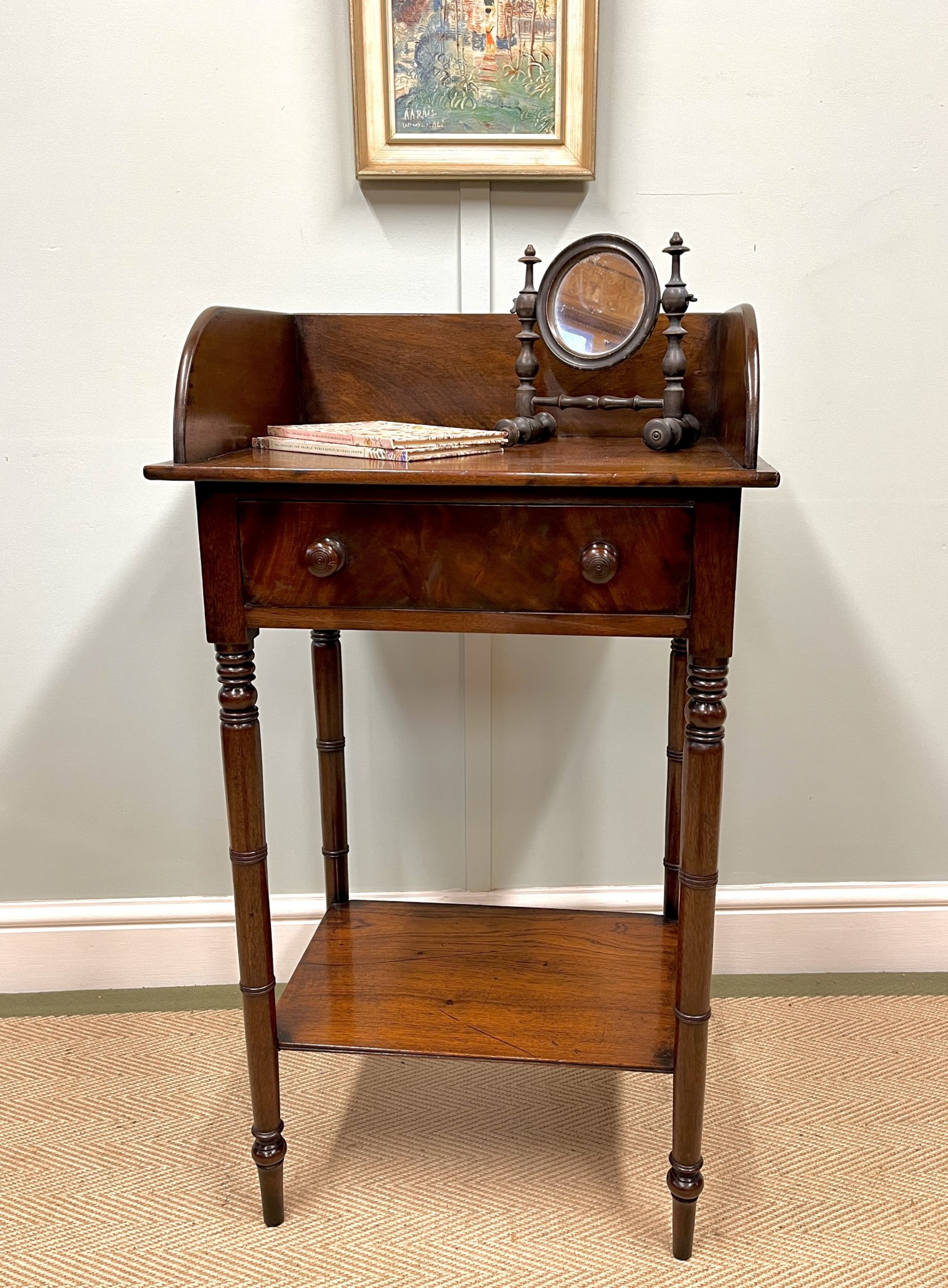Lovely colour and great condition. With slim turned legs a single drawer and useful lower shelf. Perfect for a small space.