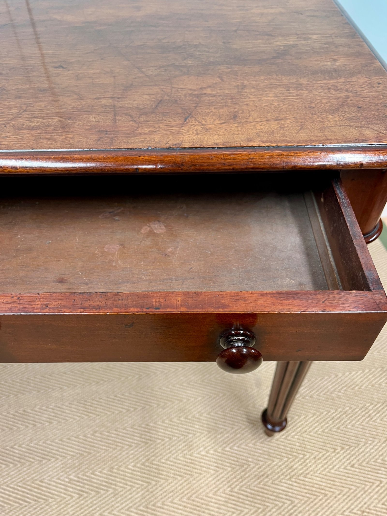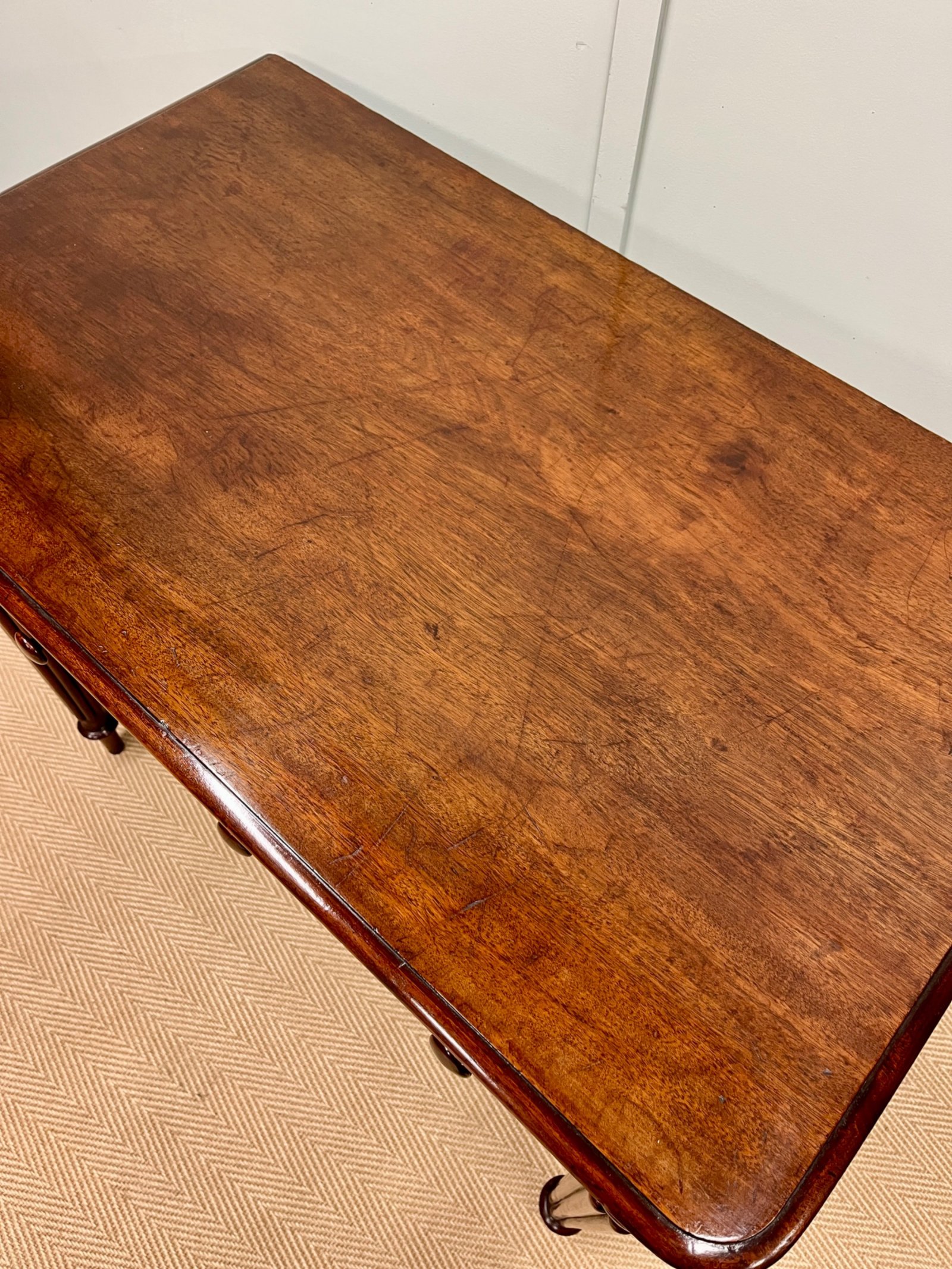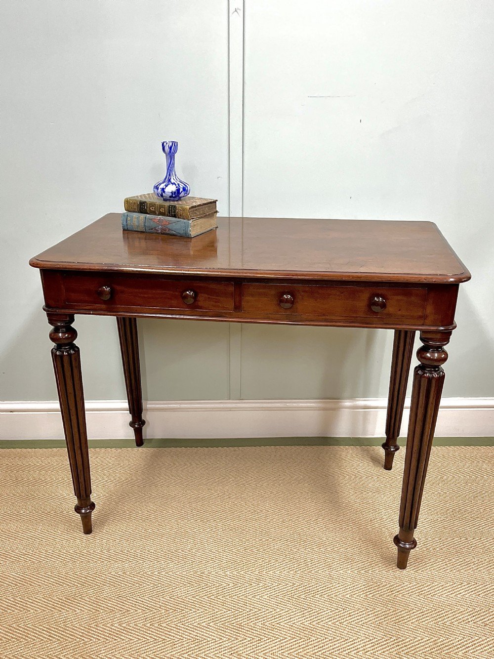 A lovely quality small 19th century mahogany writing or side table. With two drawers and reeded legs.