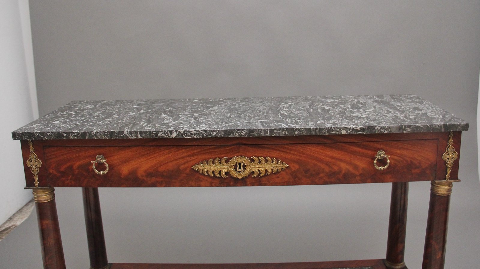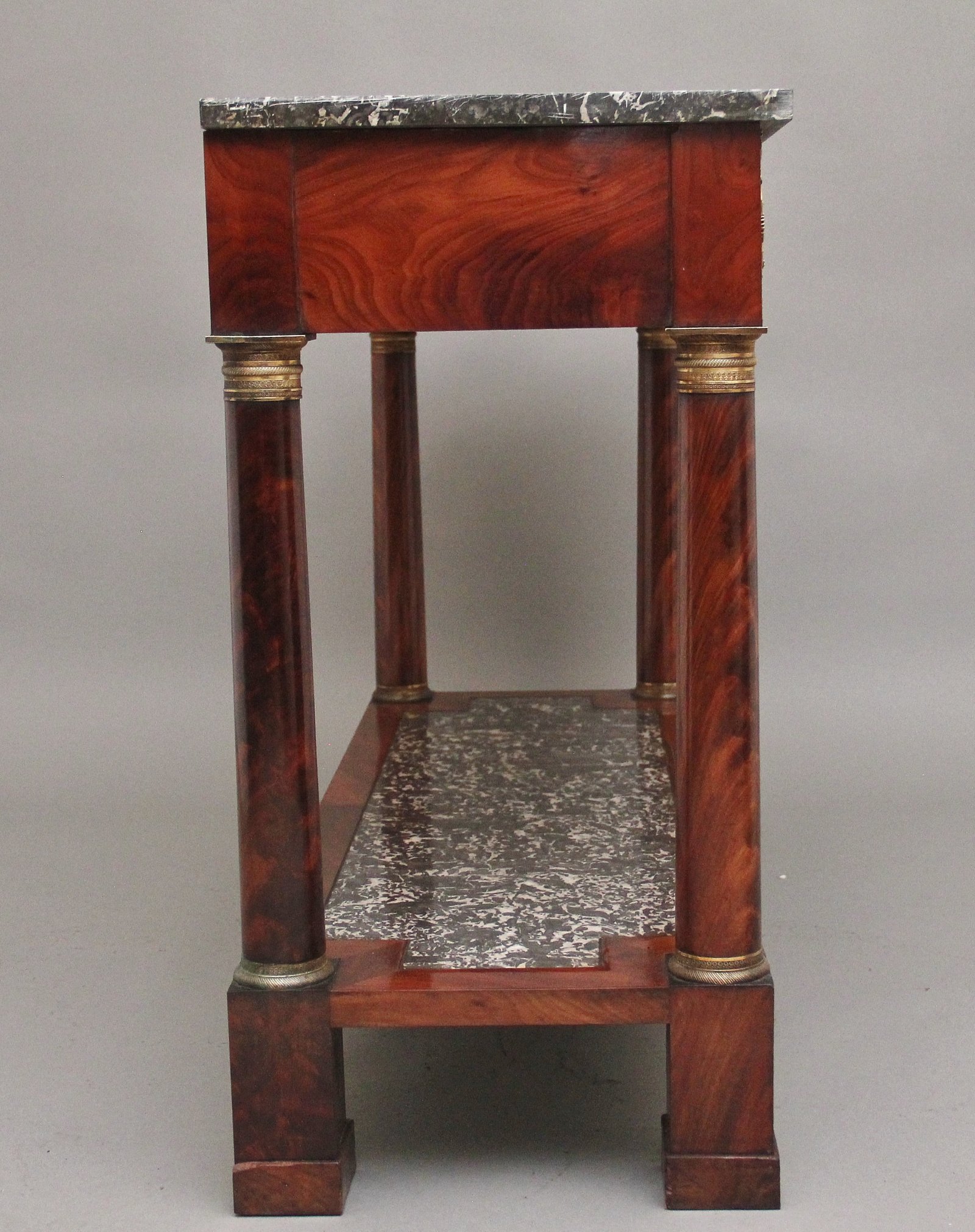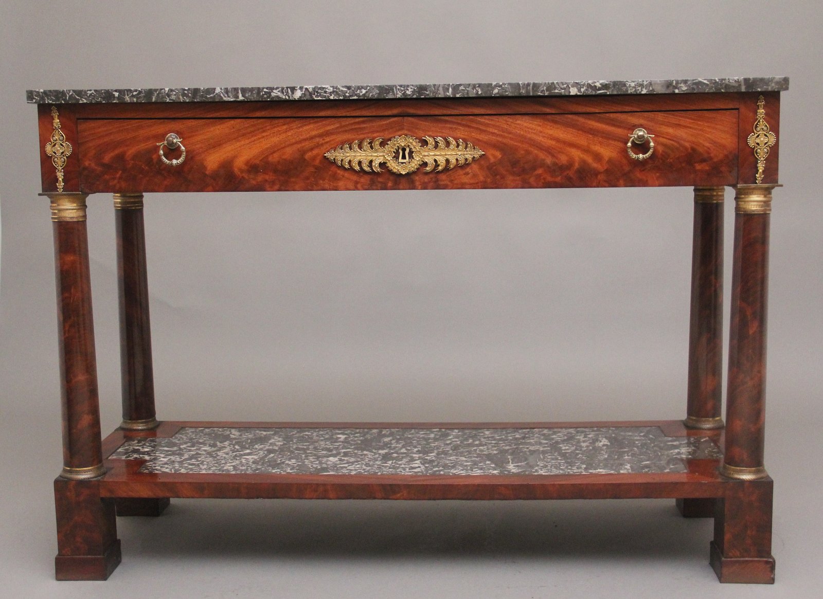 A fabulous quality 19th Century French marble top mahogany console table, have the original veined grey marble top above a single oak lined frieze drawer, lovely figured drawer front and having the original brass handles and intricate brass mounts, supported on four wonderfully figured turned columns decorated with brass capitals and terminating on block feet, united with a potboard shelf with the original matching grey veined marble insert. In excellent condition and having a nice warm rich mahogany colour. Circa 1880.