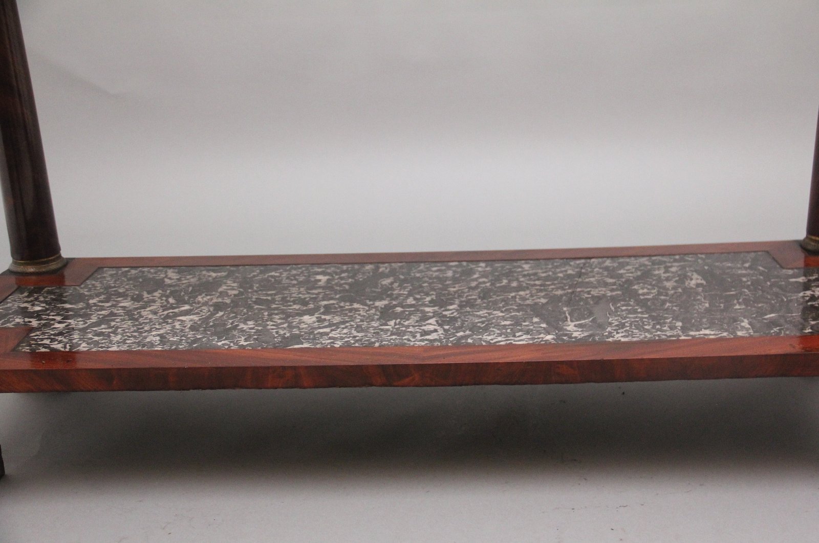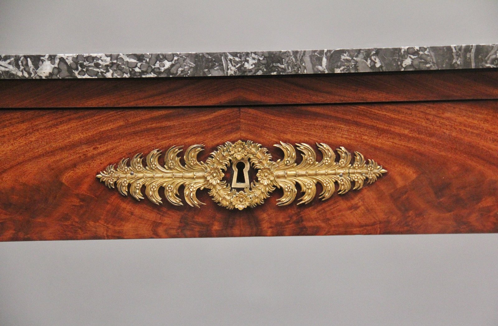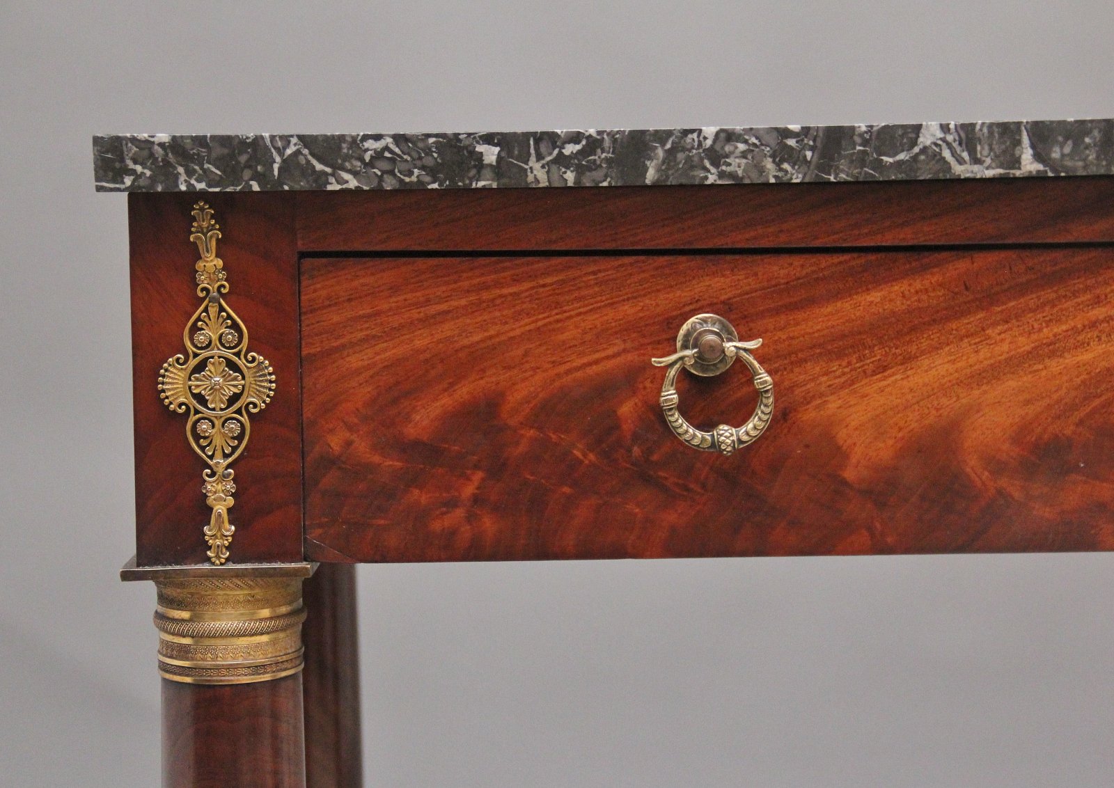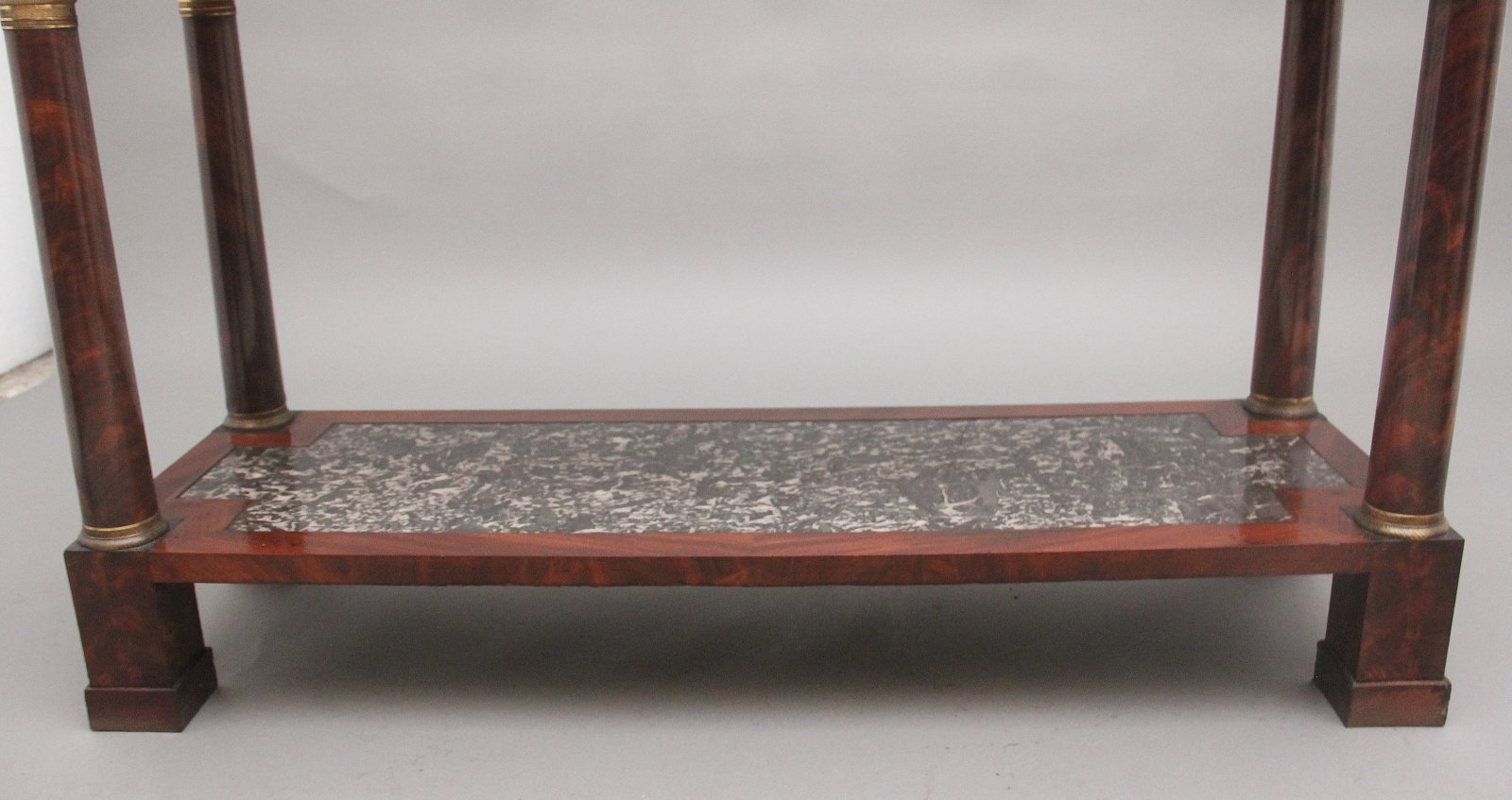 A fabulous quality 19th Century French marble top mahogany console table, have the original veined grey marble top above a single oak lined frieze drawer, lovely figured drawer front and having the original brass handles and intricate brass mounts, supported on four wonderfully figured turned columns decorated with brass capitals and terminating on block feet, united with a potboard shelf with the original matching grey veined marble insert. In excellent condition and having a nice warm rich mahogany colour. Circa 1880.