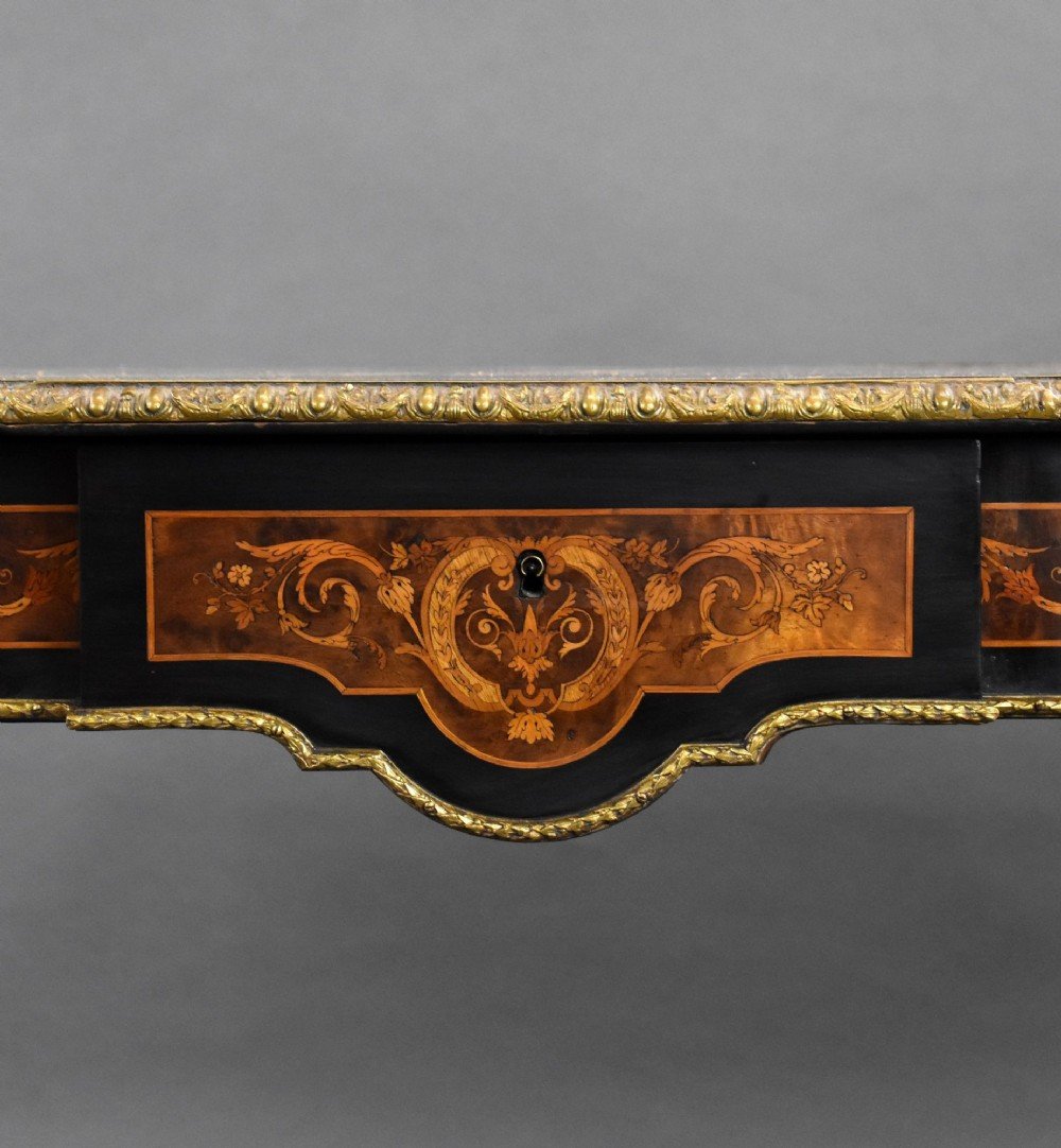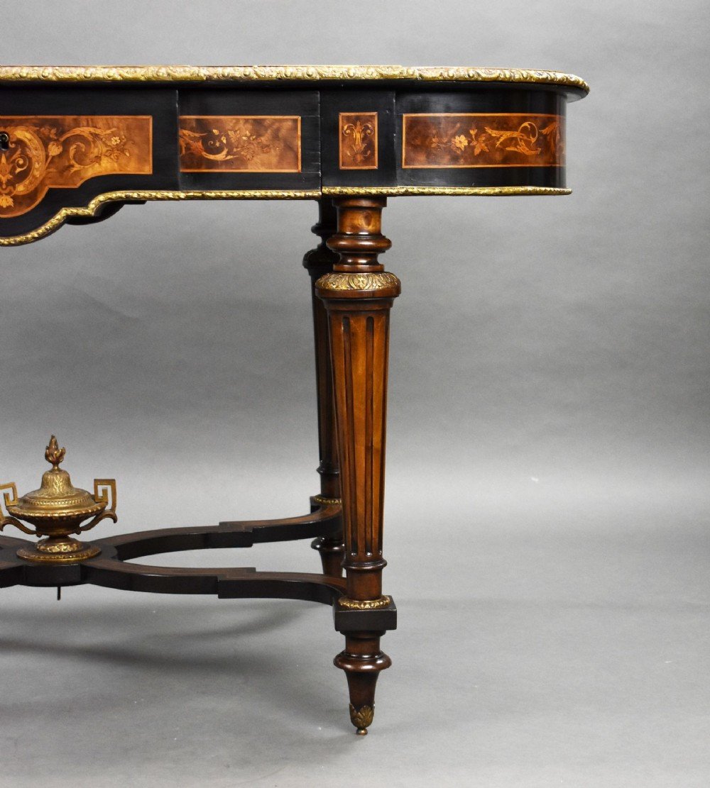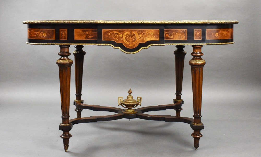 For sale is a good quality 19th century marquetry centre table, having ormolu mounts throughout, the shaped top with concentric radiating inlaid top with moulded edge and a frieze drawer on fluted and tapered legs united by a shaped stretcher centred by a gilt urn, raised on toupee feet. This piece remains in excellent condition for its age.