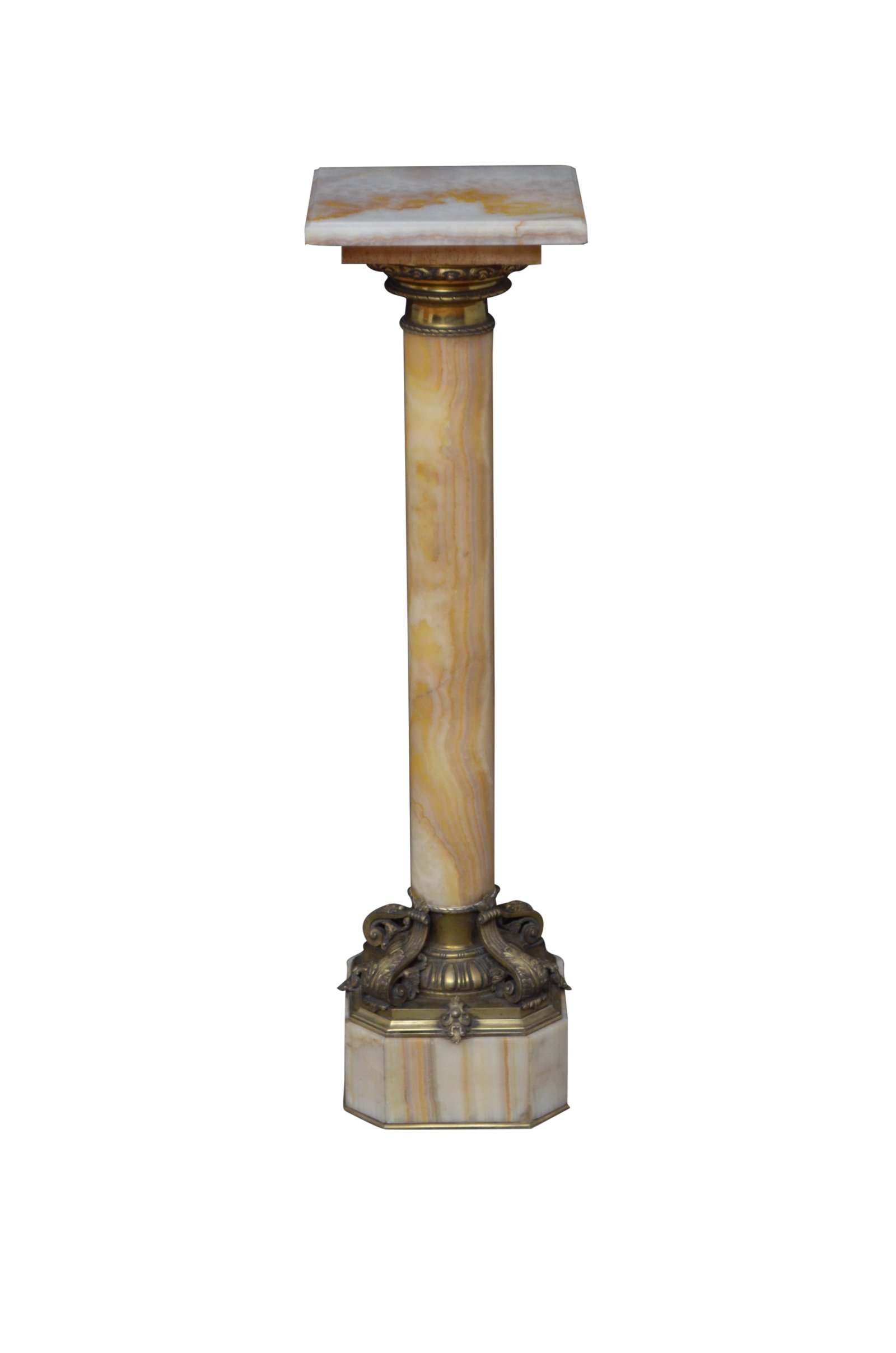K0527 Outstanding XIXth century onyx pedestal with revolving top with ormolu collar below, substantial column with variety of colours terminating in most beautiful base with egg and dart decoration and four scrolled leaves, standing on canted base and brass moulding. This antique column is in home ready condition. c1870