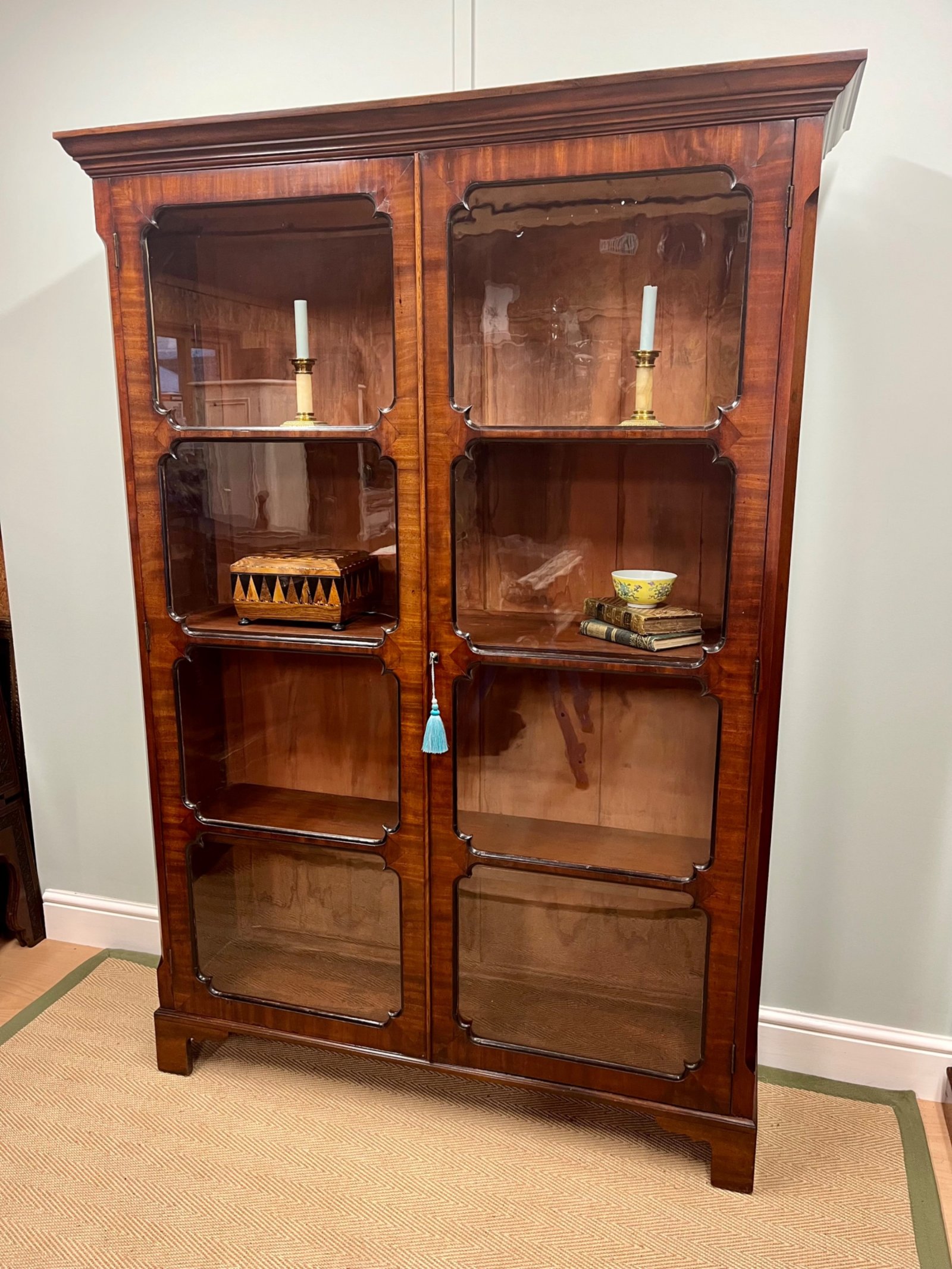 This is a great slim early 19th century glazed mahogany bookcase with unusual ebonised gothic detailing around the glazing bars.