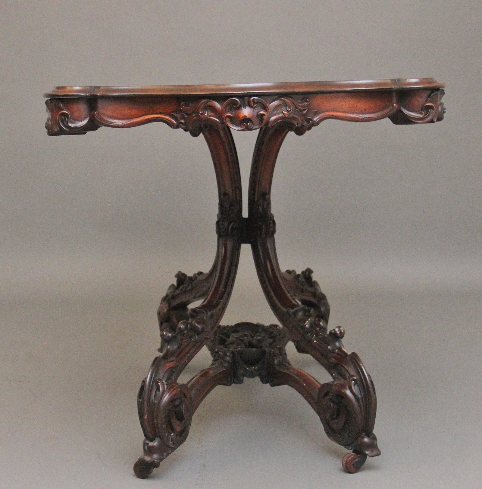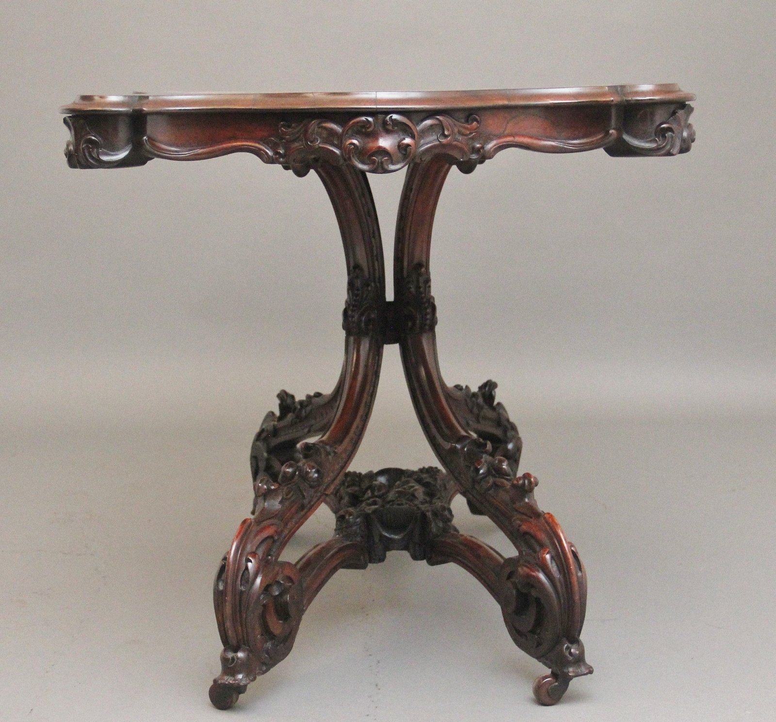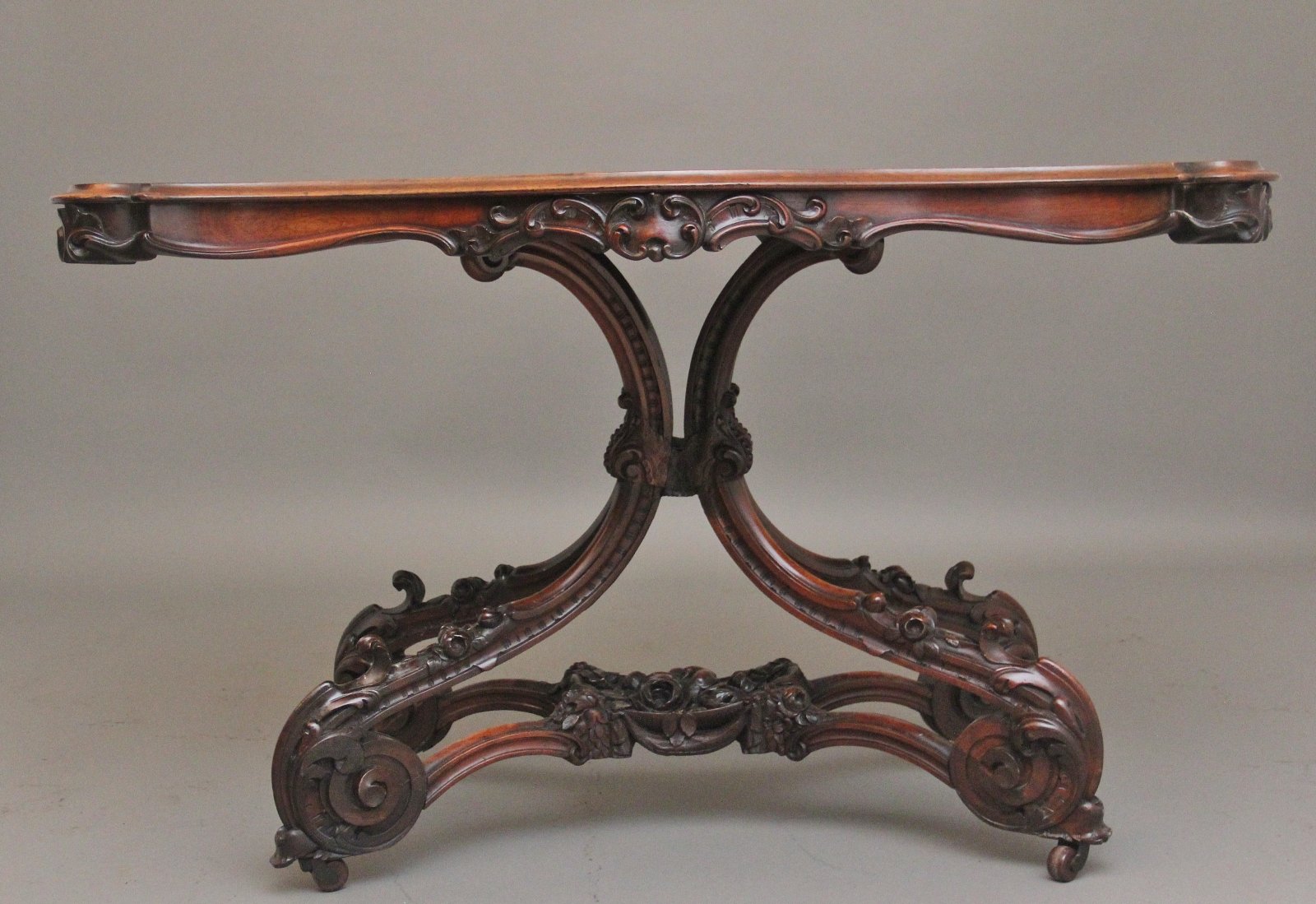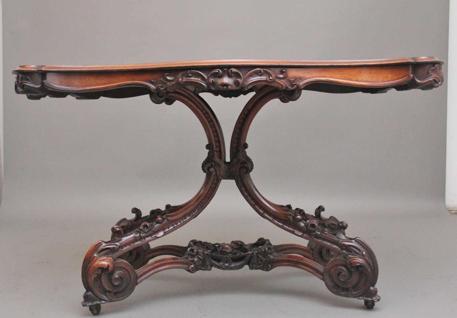 A superb quality 19th Century rosewood cente table, the wonderfully figured, shaped and moulded edge top above a carved frieze incorporating carved floral and shell decoration, supported on an ornate and profusely carved quad base terminating onto scroll feet, united by a carved central stretcher, wonderful carving on the whole base with various carved foliage. Circa 1860.