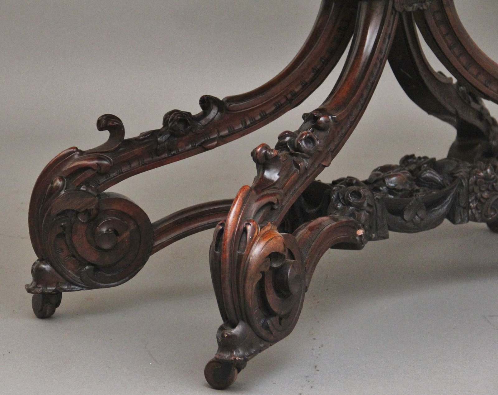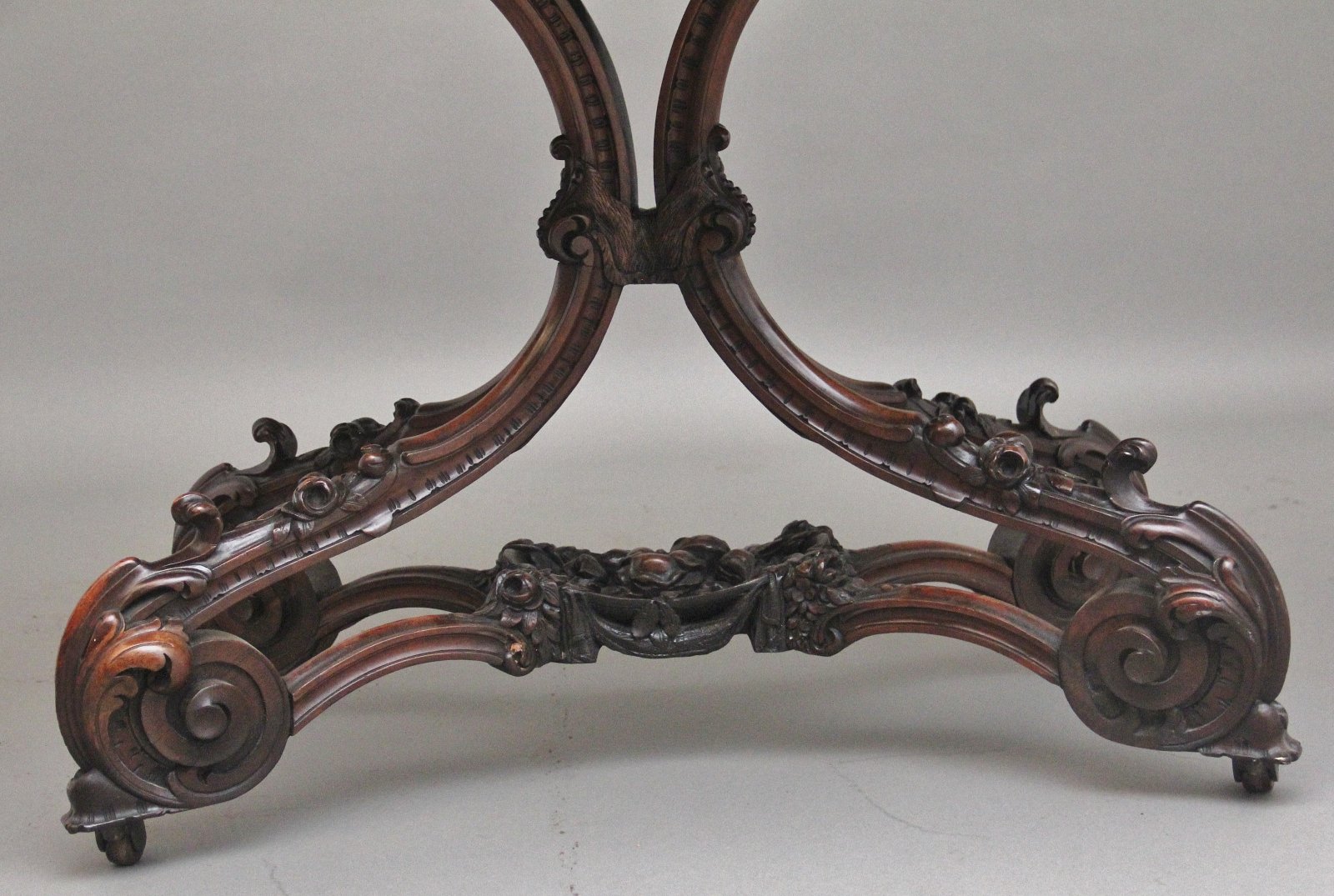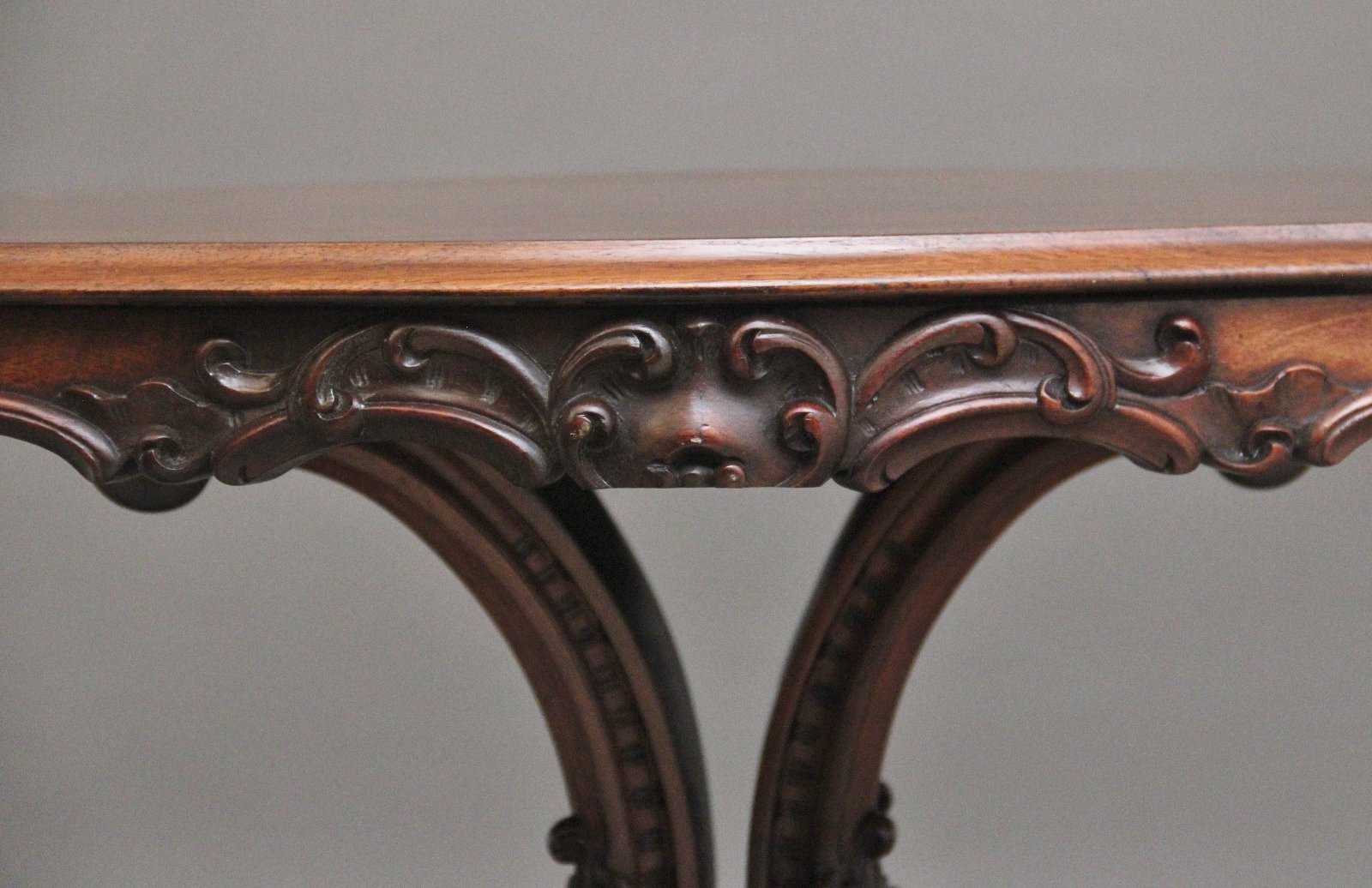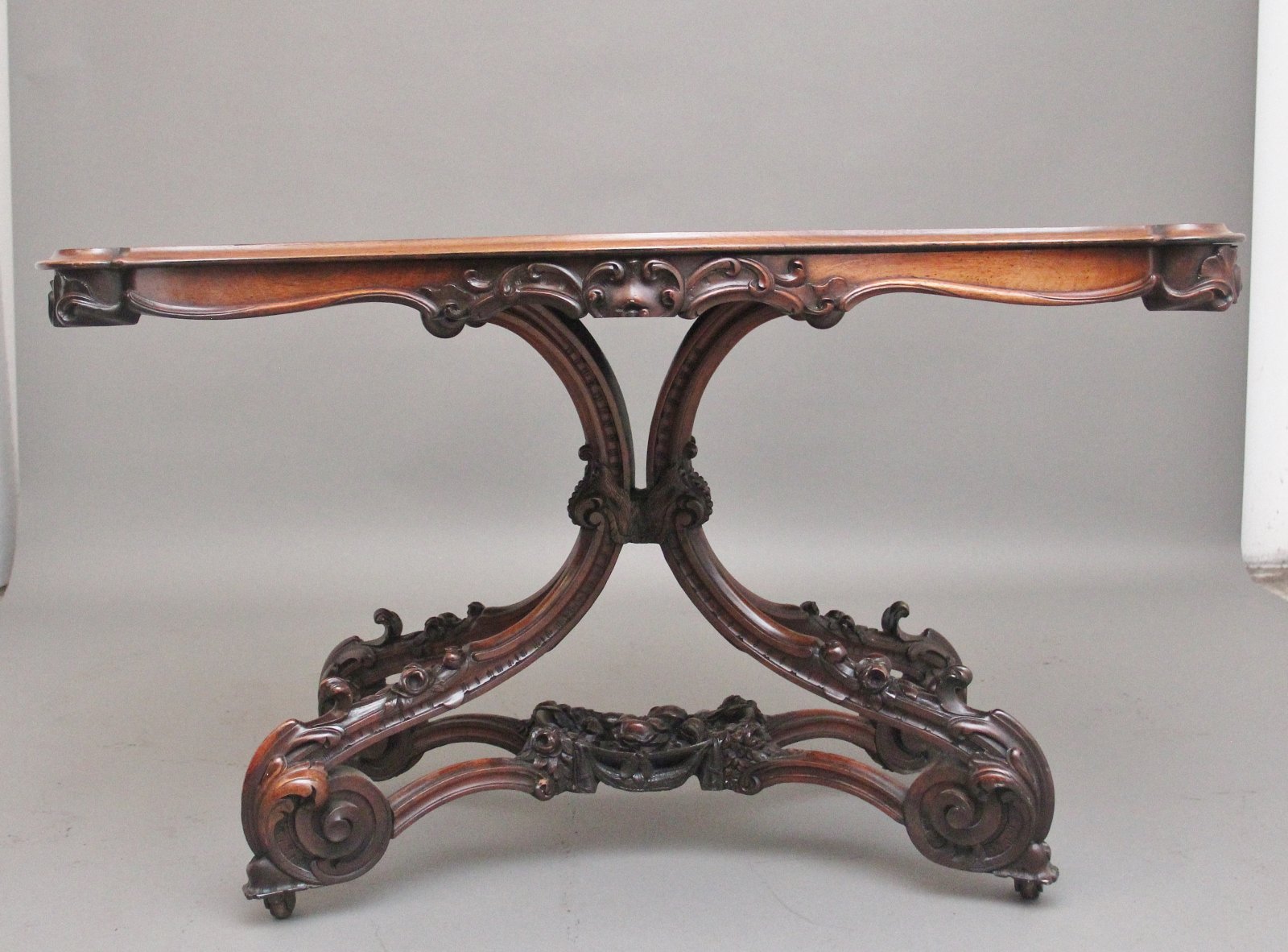 A superb quality 19th Century rosewood cente table, the wonderfully figured, shaped and moulded edge top above a carved frieze incorporating carved floral and shell decoration, supported on an ornate and profusely carved quad base terminating onto scroll feet, united by a carved central stretcher, wonderful carving on the whole base with various carved foliage. Circa 1860.