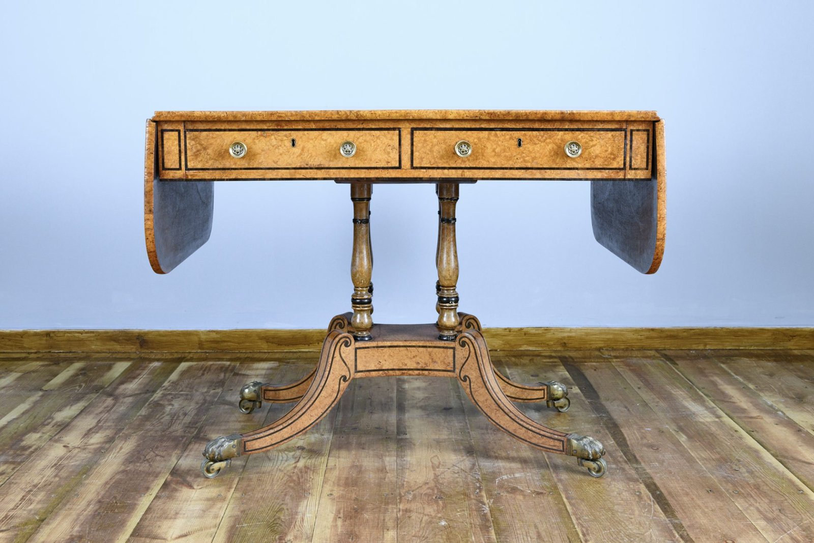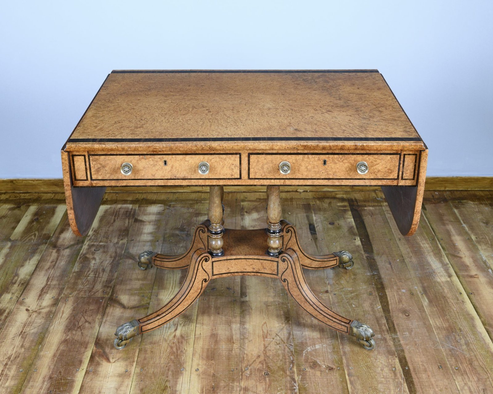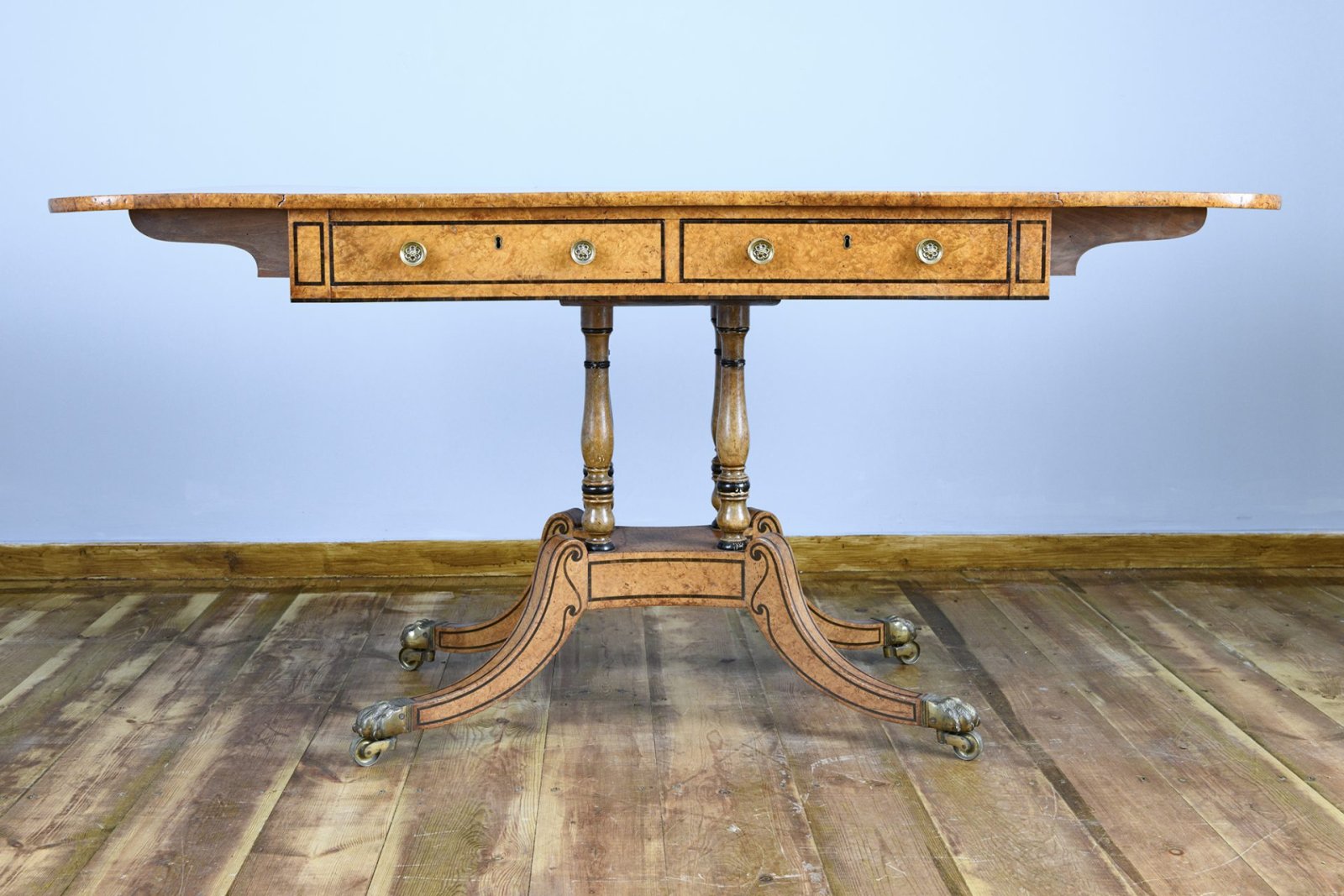 19th century Regency amboyna and macassar ebony crossbanded sofa table is attributed to the Royal Cabinet Maker George Oakley.