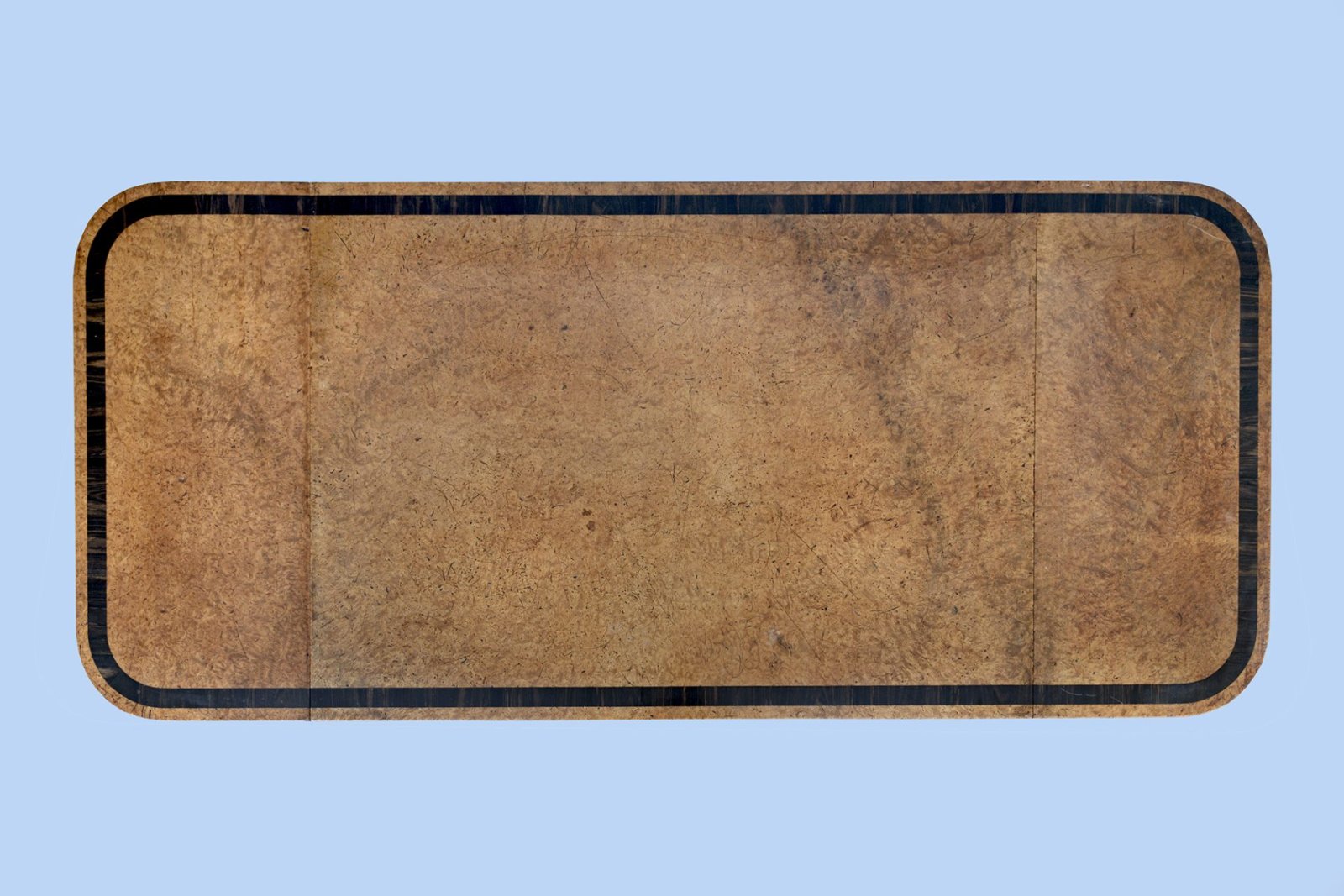 The highly figured rectangular top is crossbanded with macassar ebony throughout the sofa table.