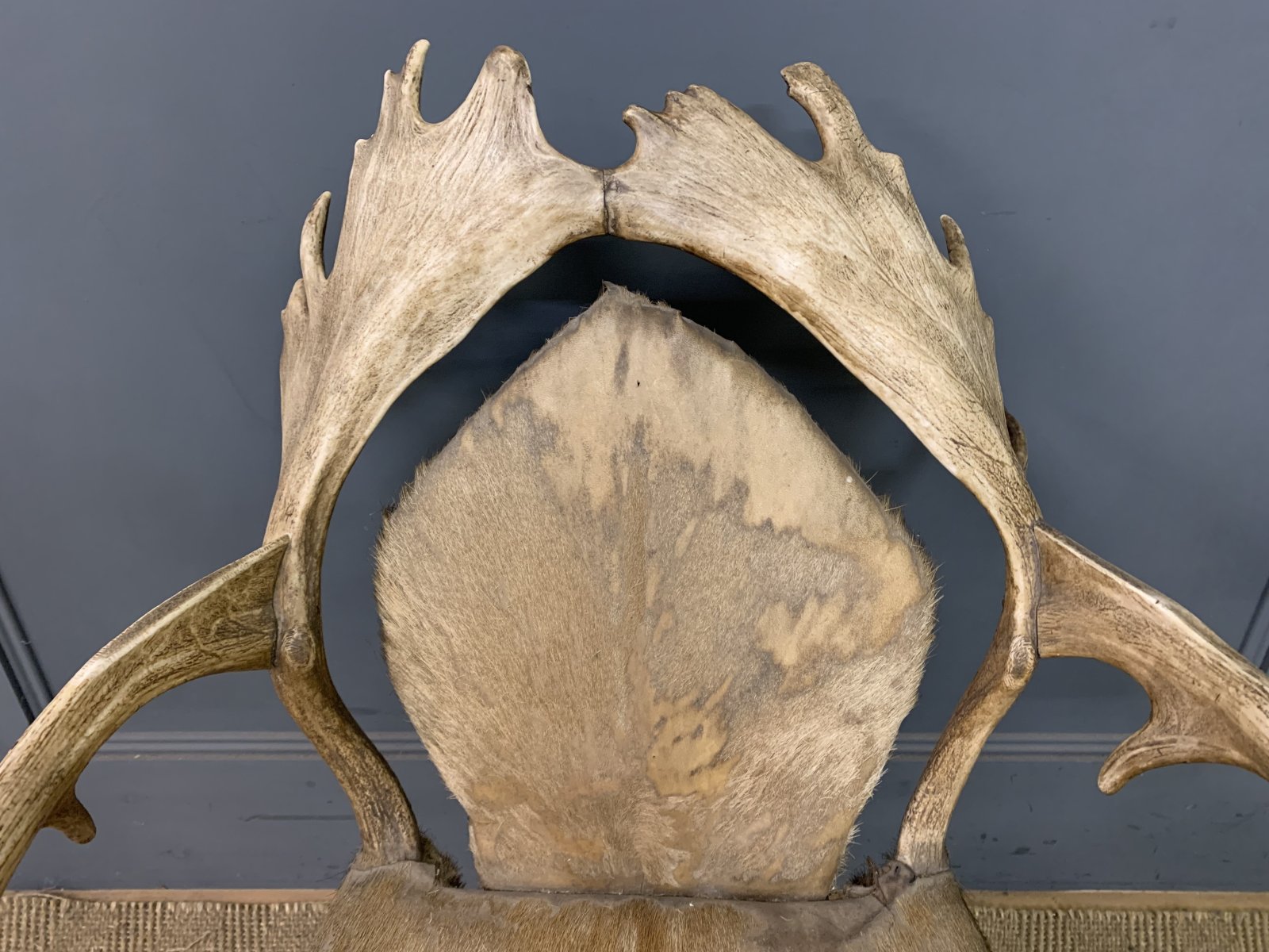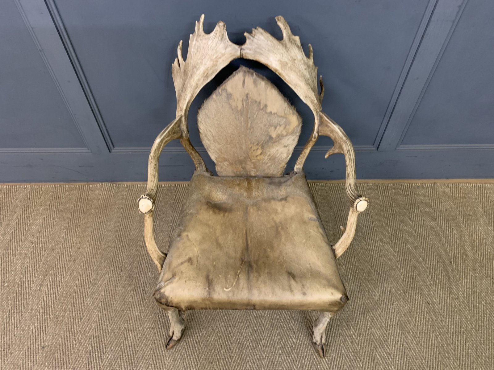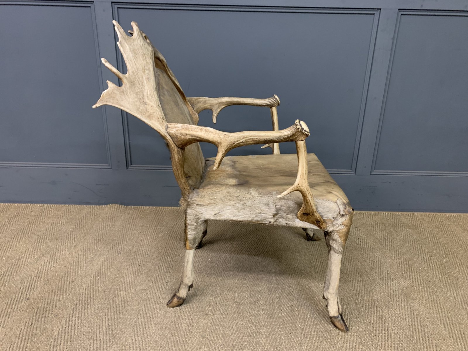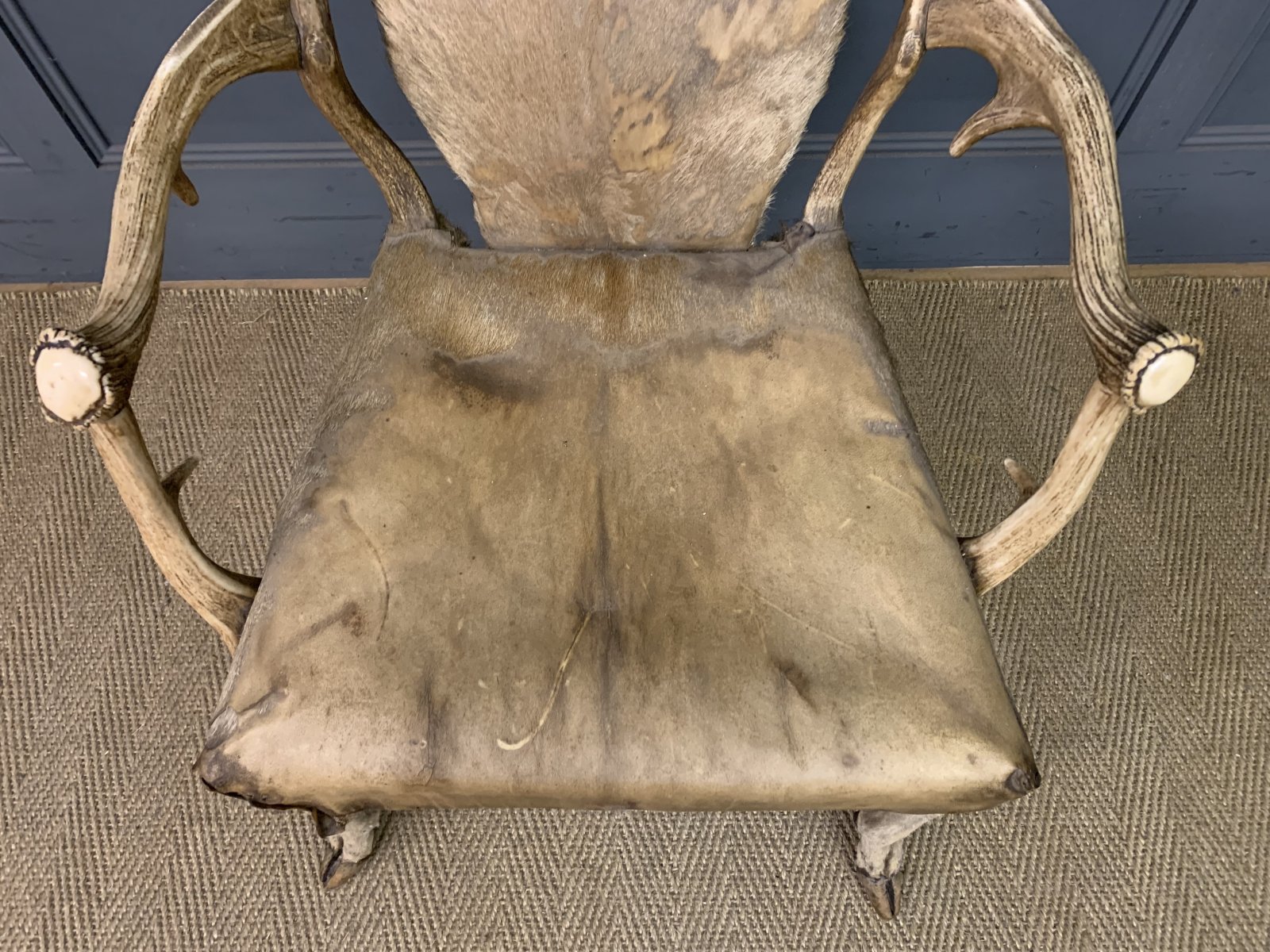 A rare and unusual stags antler armchair from the mid-Victorian period. Constructed from a pair of dear stags antlers and feet. Upholstered in dear skin. Completely untouched and offered for sale in un-restored condition.