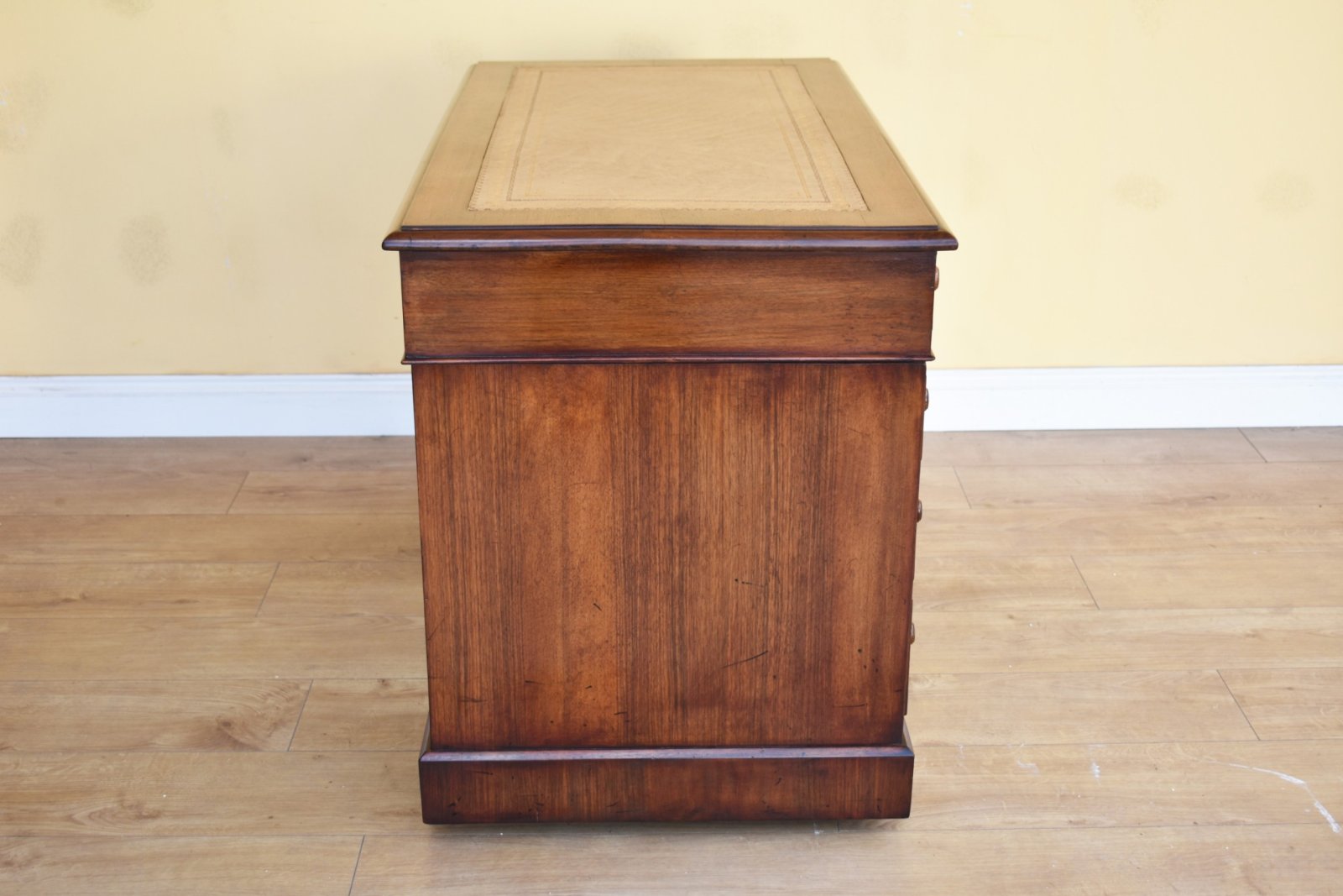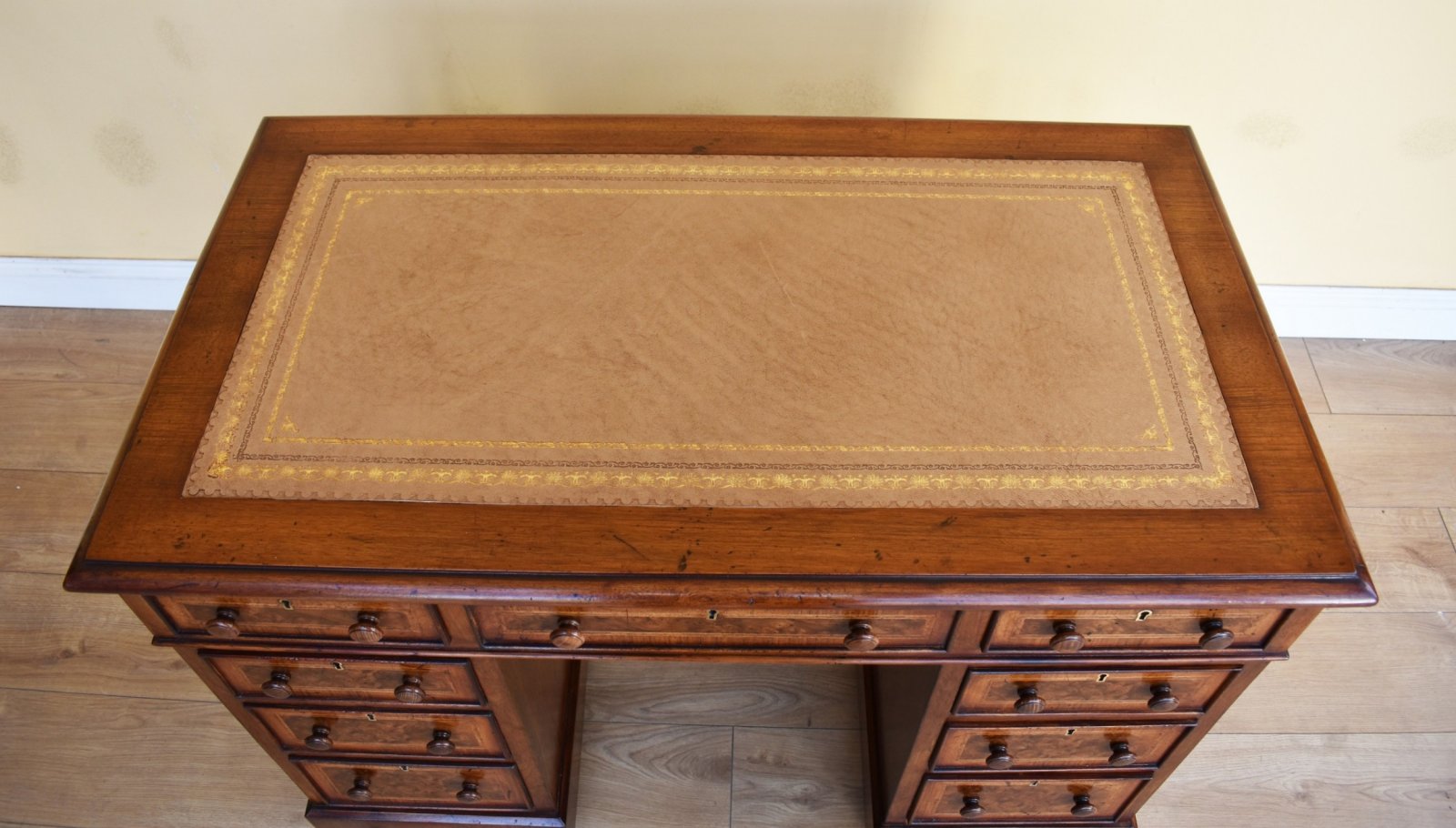 For sale is a good quality 19th century Victorian burr walnut pedestal desk. The desk top is inset with a leather skiver, decorated with gold tooling. Below this three drawers, each with walnut banding and turned handles. The top fits onto two pedestals, each having a further three drawers, above a plinth base. The desk is polished on all sides, meaning it can be placed anywhere in a room. The desk is in excellent condition.