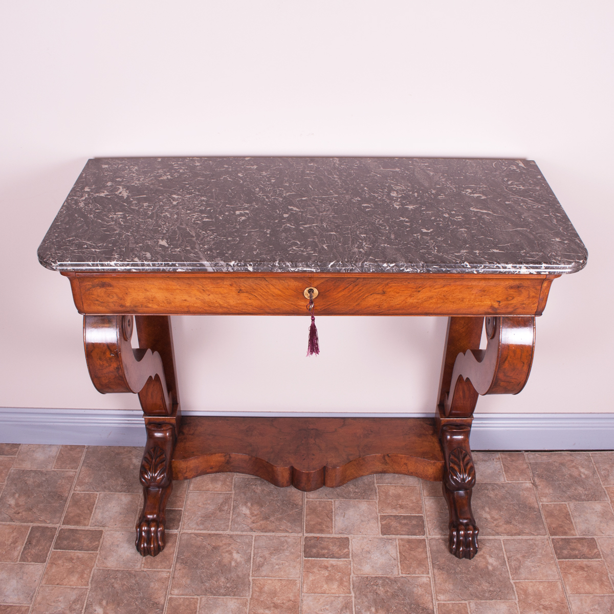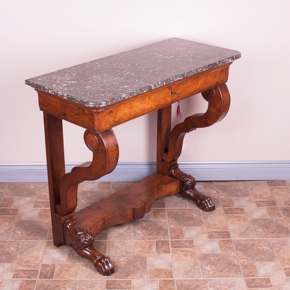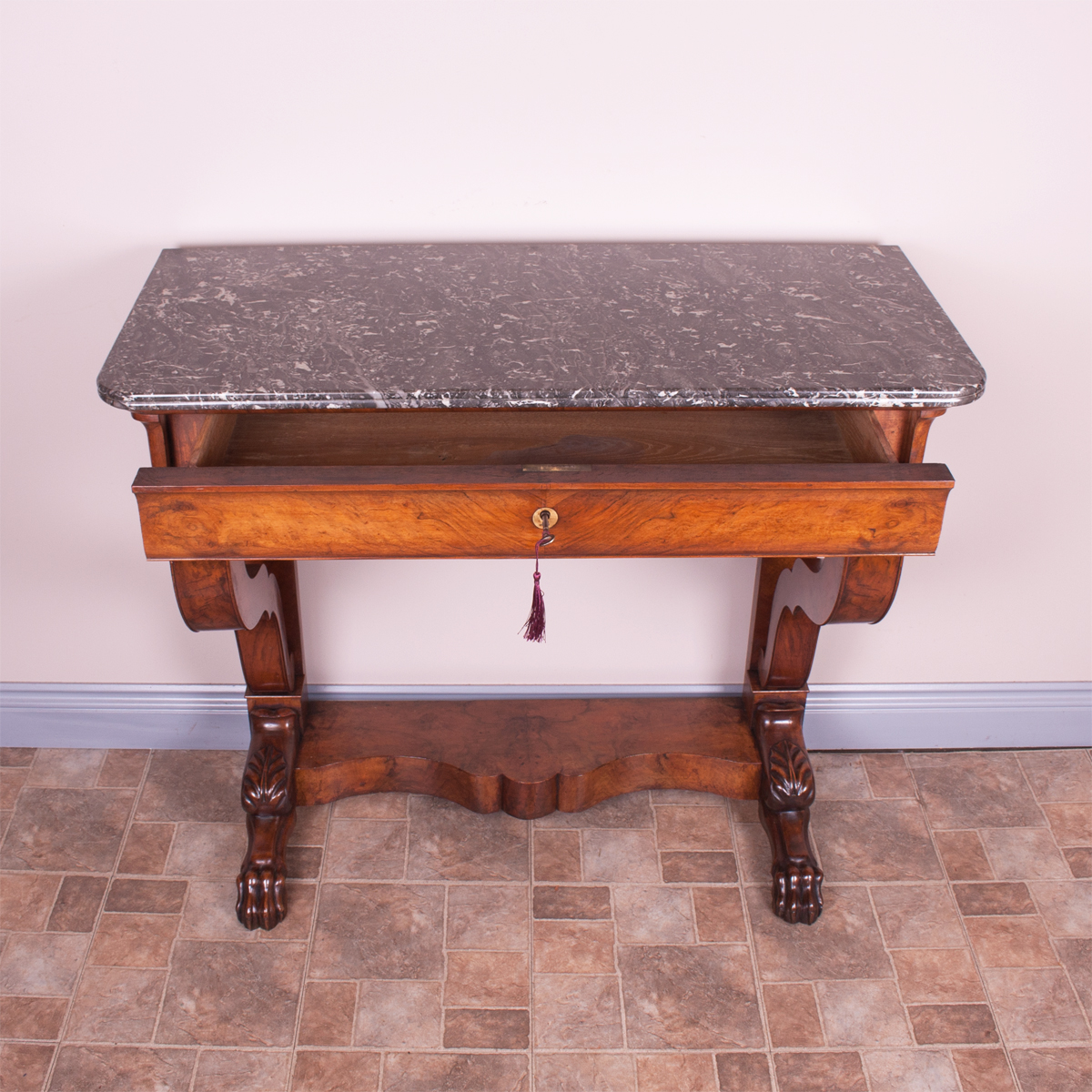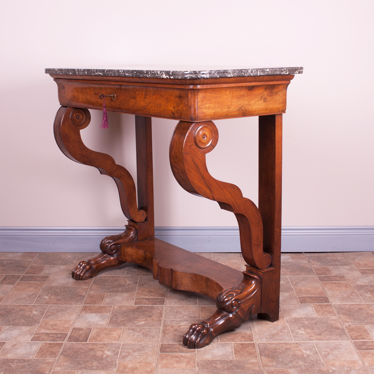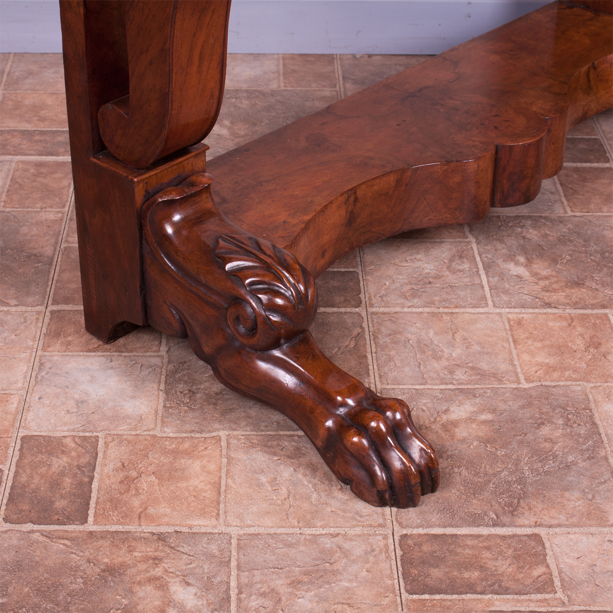 This 19thC French Walnut Console Table has a refined overall design to it. Standing on generous paw feet, with decorative leaf carving to the knees. The chunky front supports, adorned with finely turned roundels, lead up to the shaped apron containing a good-sized drawer.
