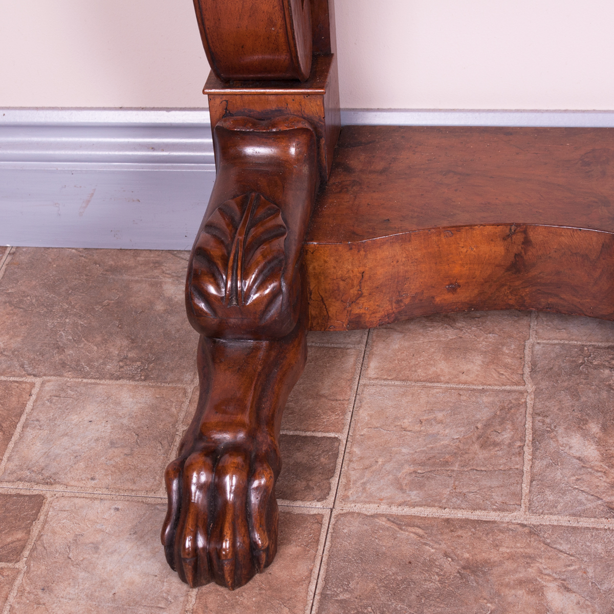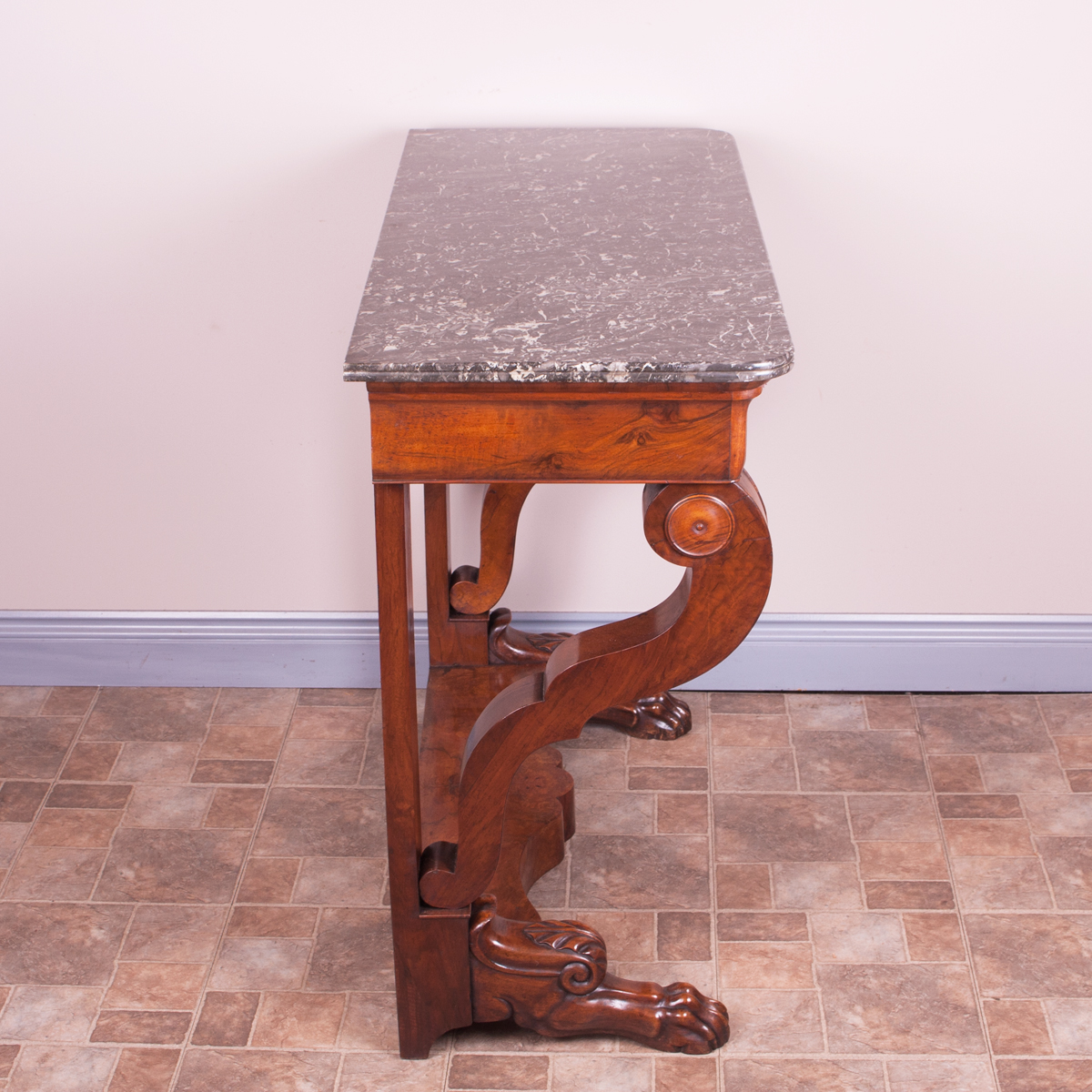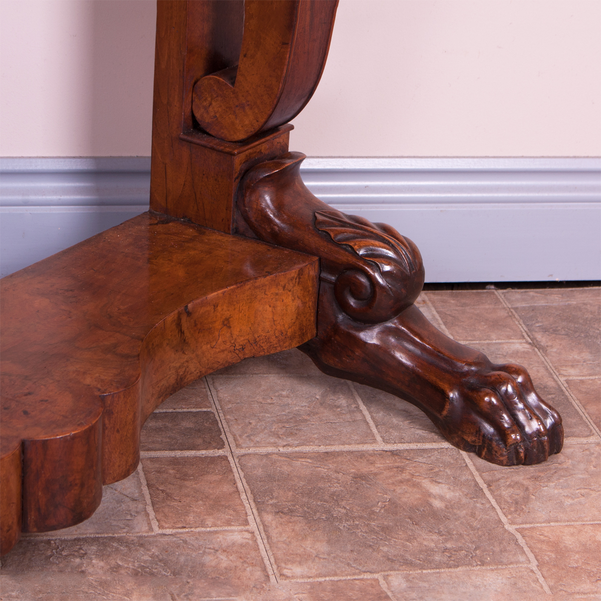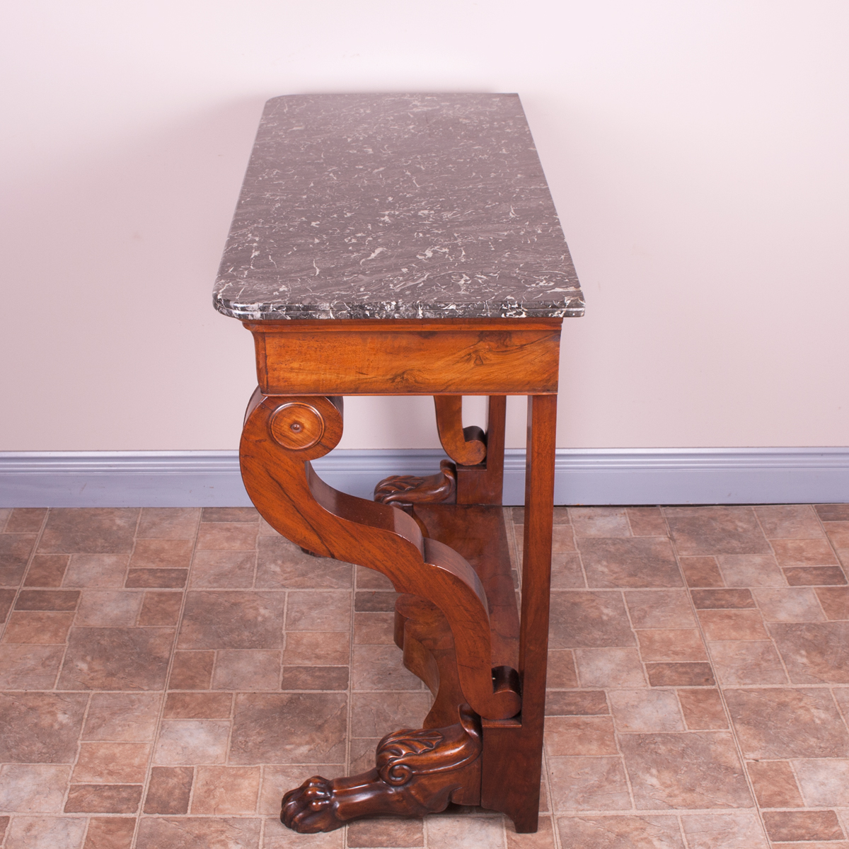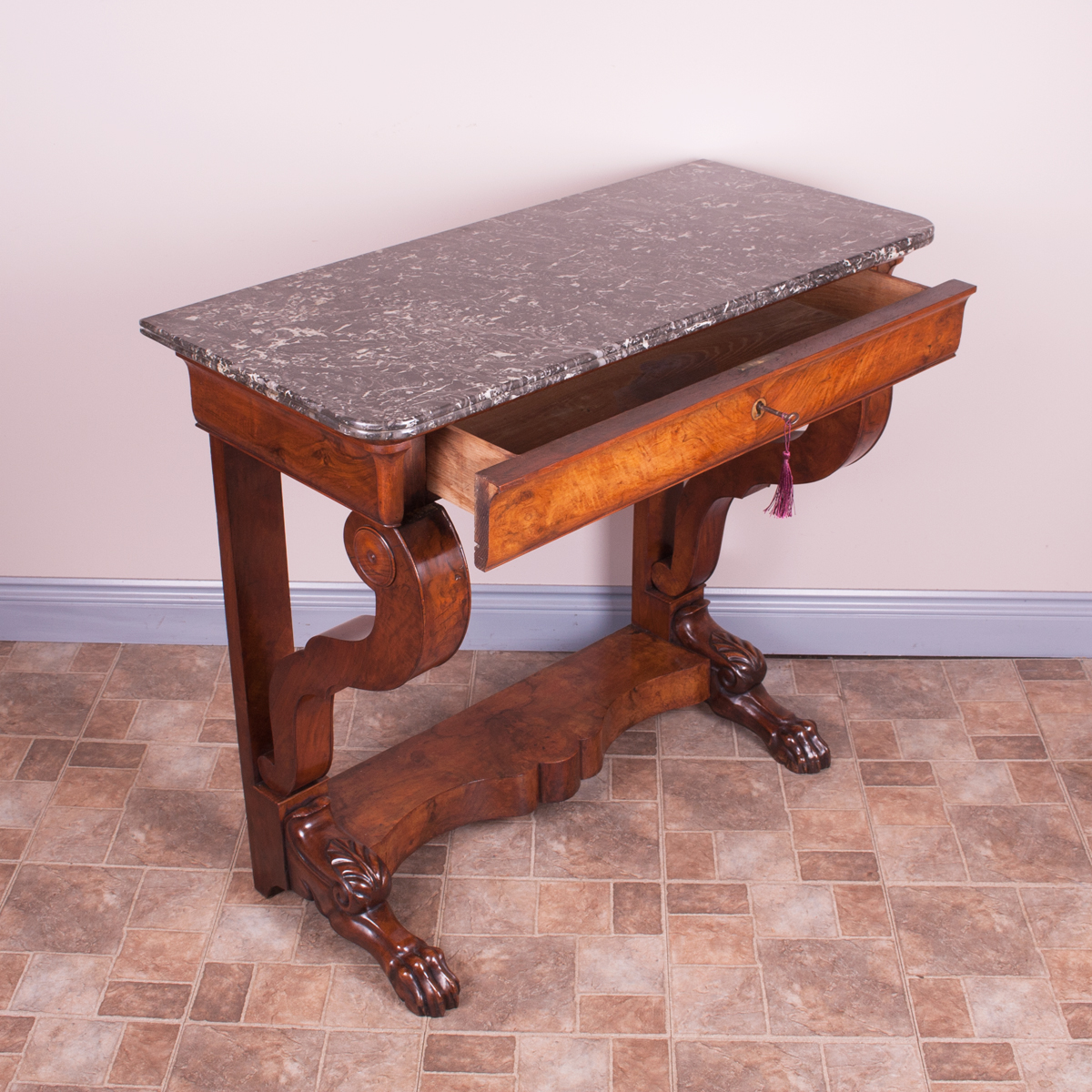 This 19thC French Walnut Console Table has a refined overall design to it. Standing on generous paw feet, with decorative leaf carving to the knees. The chunky front supports, adorned with finely turned roundels, lead up to the shaped apron containing a good-sized drawer.