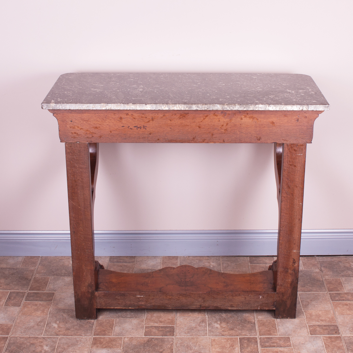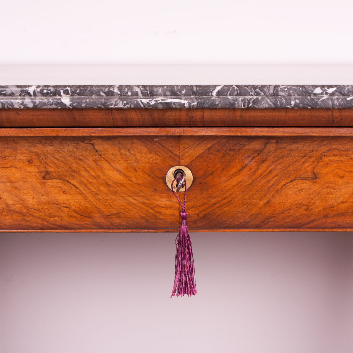 The oak lined free running drawer offers plenty of storage. The variegated dark grey marble top has a lovely double reed moulding to its edge.