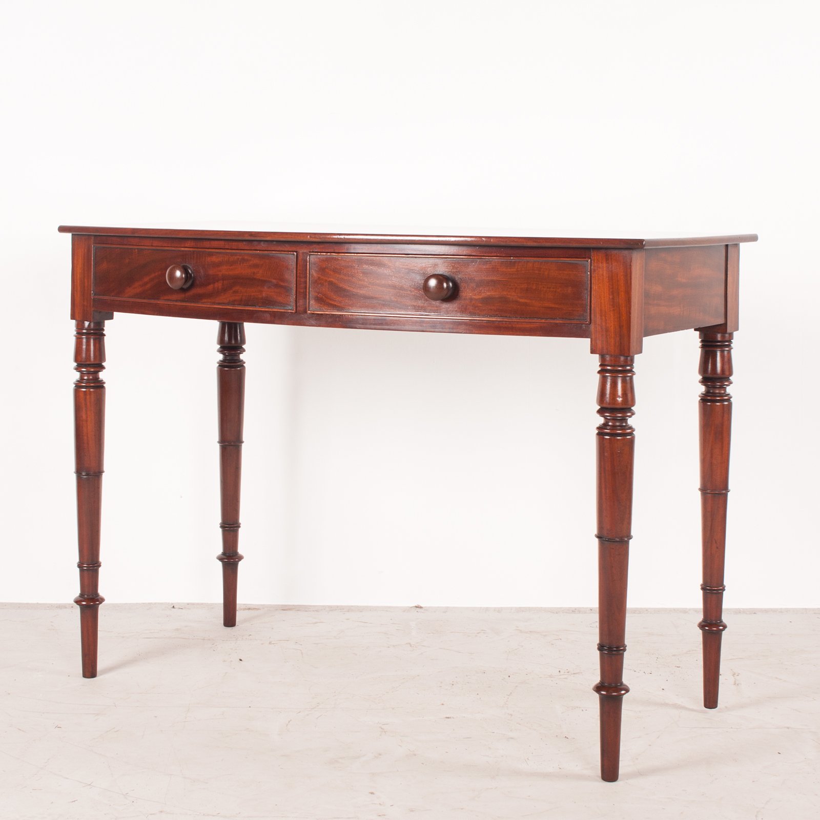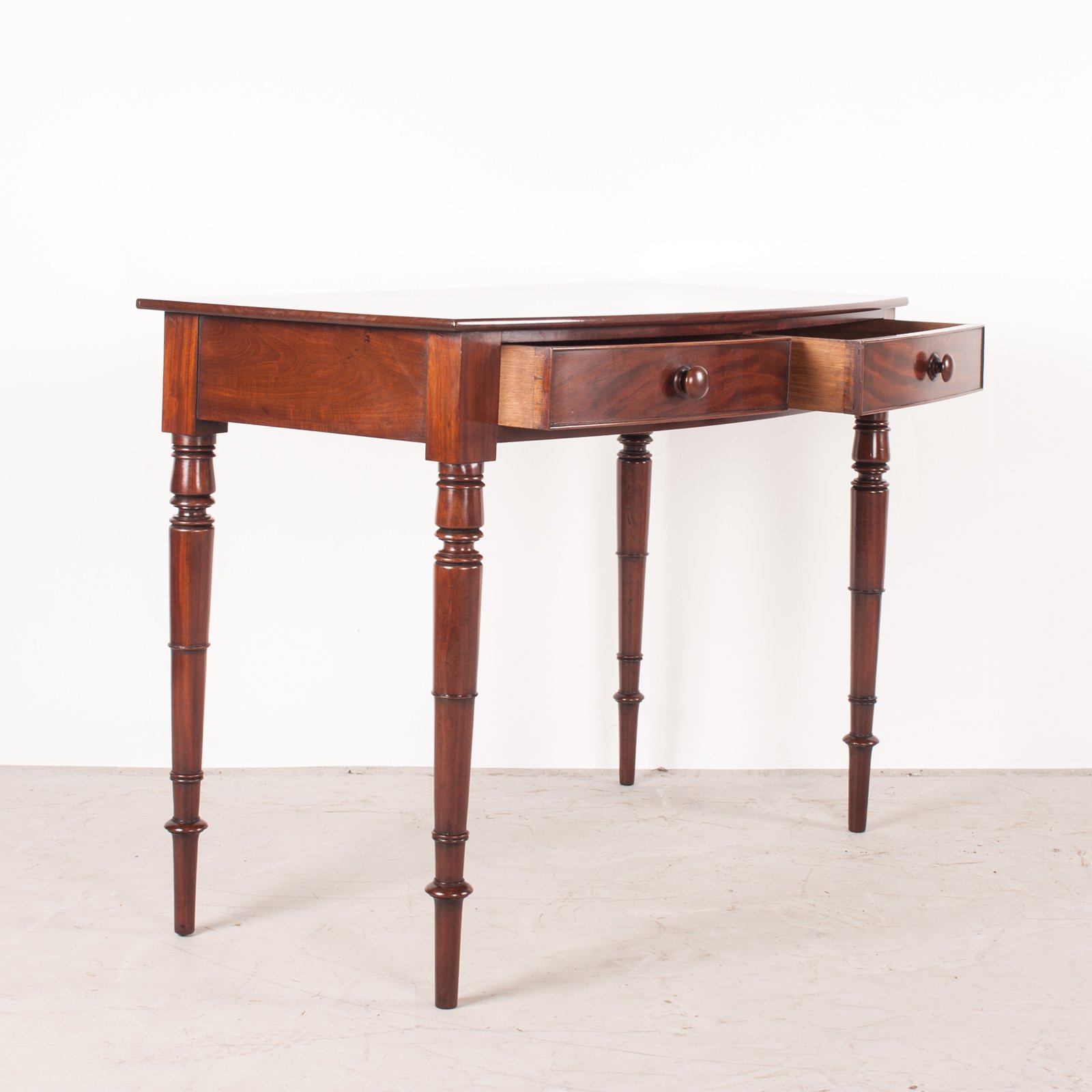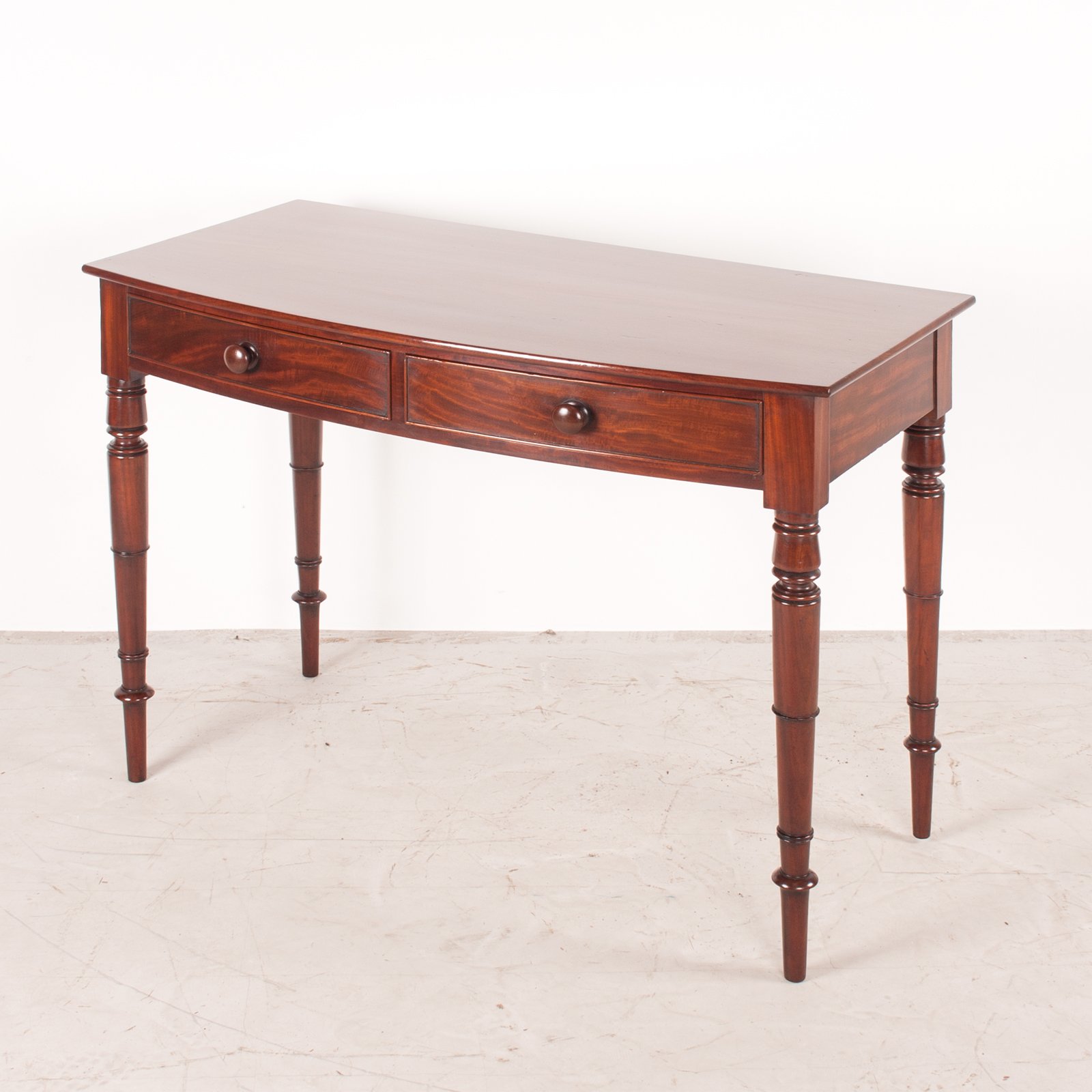 This 19thC Two Drawer Mahogany Bow Front Side Table is very well drawn and refined. Standing on crisply turned legs, with a generous bow to the front, this table combines both elegance and style. The finely grained Mahogany used throughout, has a lovely rich hue to it, and the table is of a good weight.