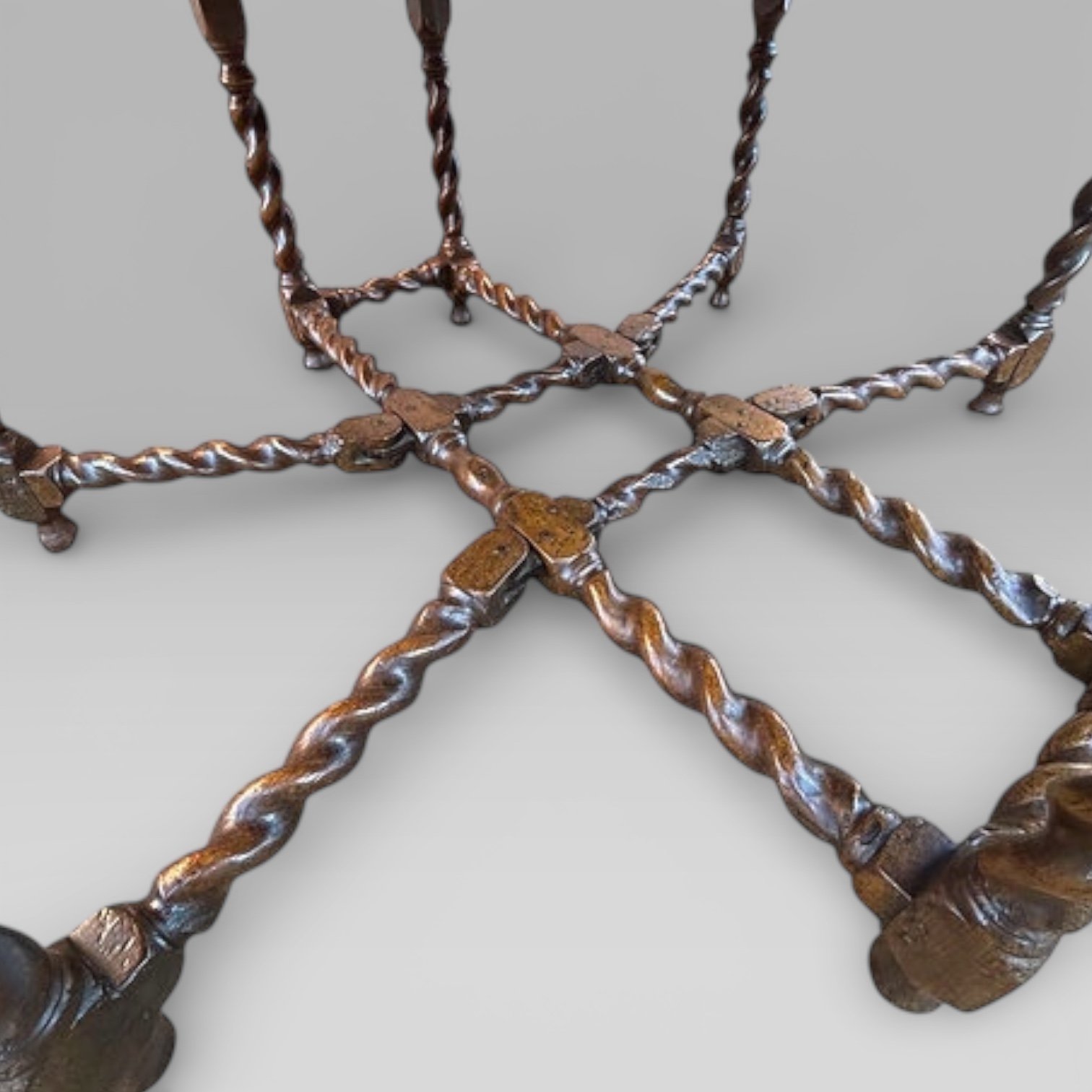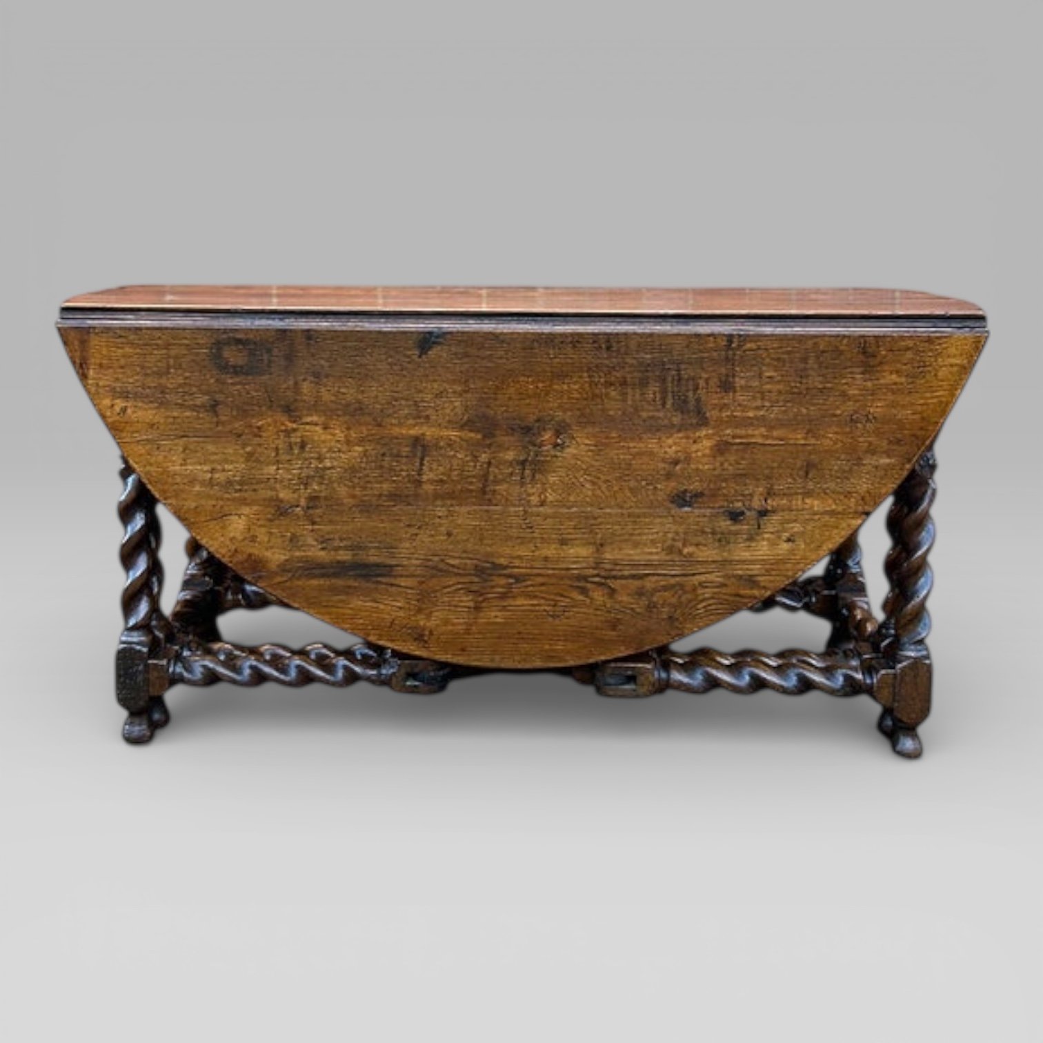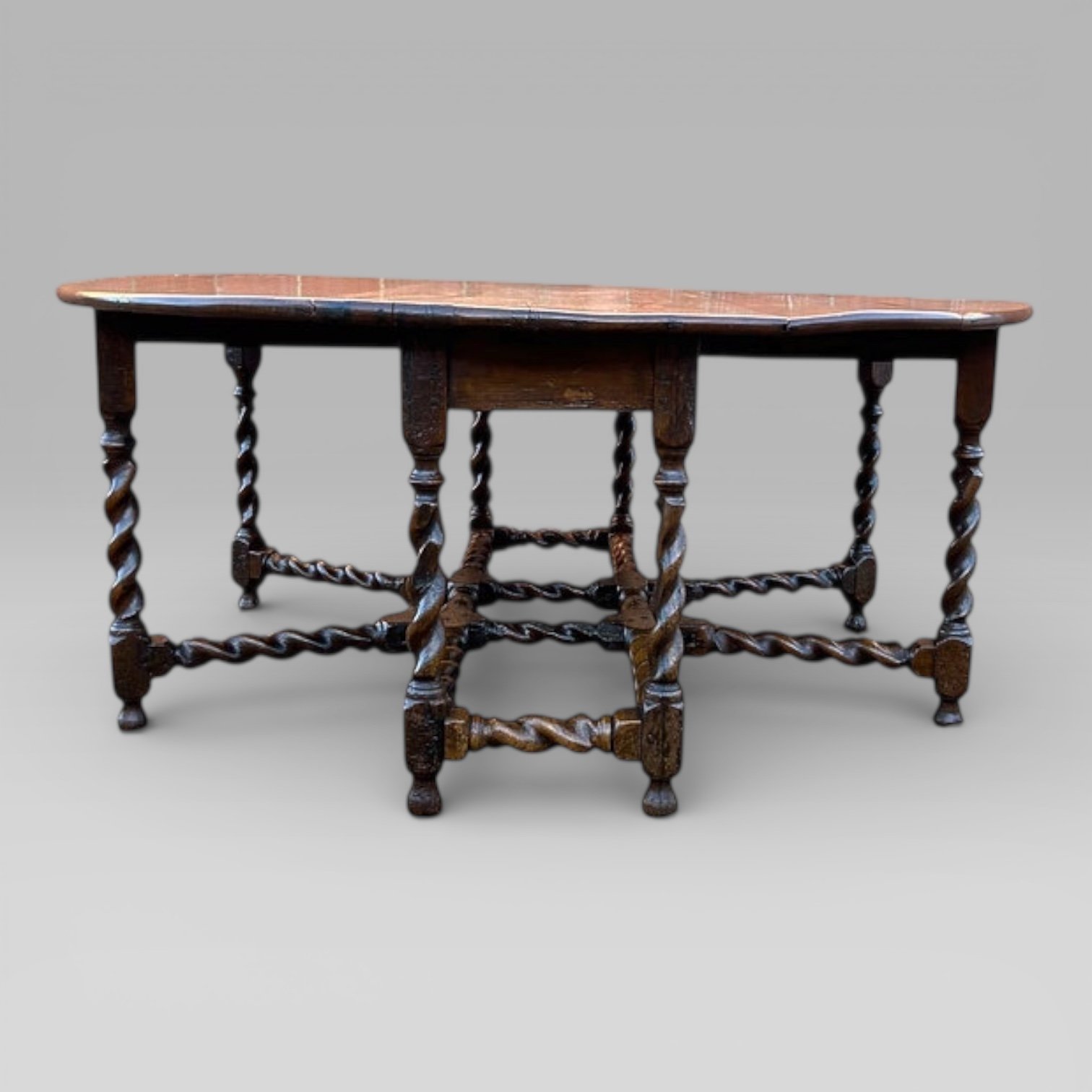 A 20th century oak double gateleg dining table, made in the 18th century style using predominantly 18th century timber with some later wood. The table is of oval form and stands on barley twist legs and supports, giving it a strong country house and farmhouse character.