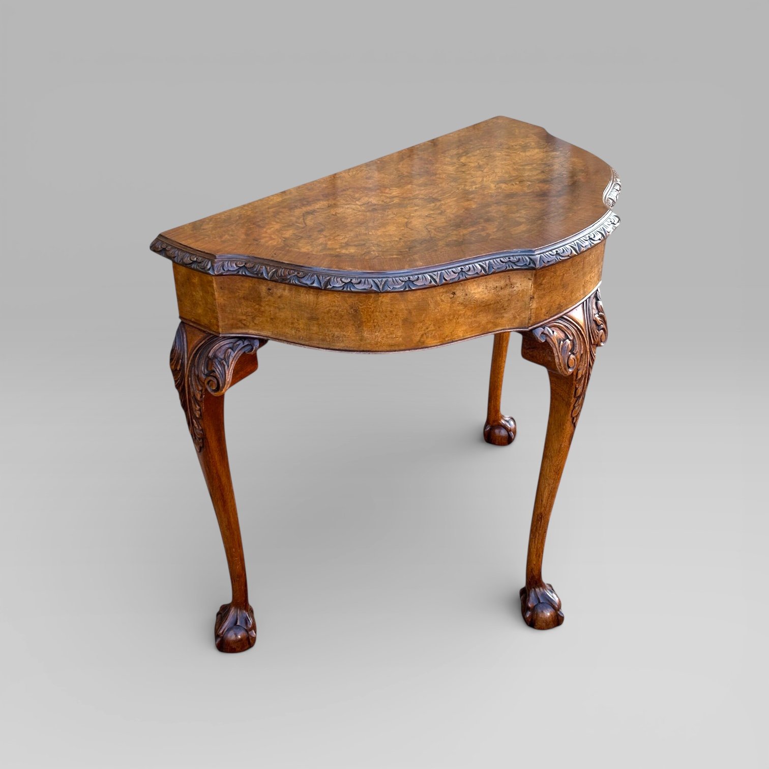 A mid 20th century, circa 1950s/ 1960s, Queen Anne Style Walnut Side Table by Maple & Co. A Demi lune shaped table, with a carved moulding table top edge, 3 carved top cabriole legs, each with ball and claw feet.