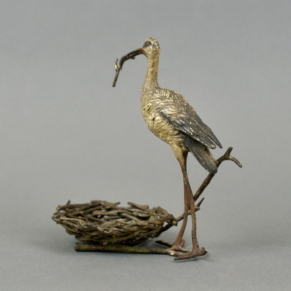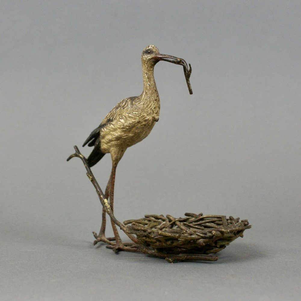 A 19thC Austrian cold painted bronze depicting a stork building a nest. Very well observed and in very good and original condition and bearing a stamp, ''Geschutzt'', under the tail feathers. Pronounced ''guess-shutst,'' the term is an abbreviation of gesetzlich geschutt, a German phrase that translates as ''legally protected'' or ''copyrighted.'' 150mm high, 145mm wide and 90mm deep. Austrian. Circa 1870.