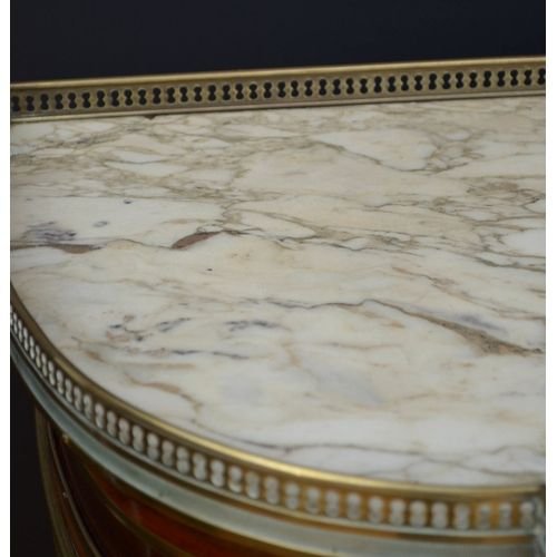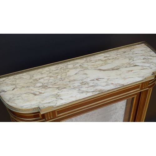 A Beautiful 19th Century Mahogany & Brass Mounted Display Cabinet. Having the original brass gallery and grey veined marble top, above a brass inlaid frieze and a single glazed door, fitted with original working lock and a key. Enclosing a newly relined interior with two bowed glass shelves, all flanked by reeded brass inlaid pilasters. Having bowed sides and raised on a moulded plinth base with turned brass decorated feet. In excellent condition. French Circa 1880