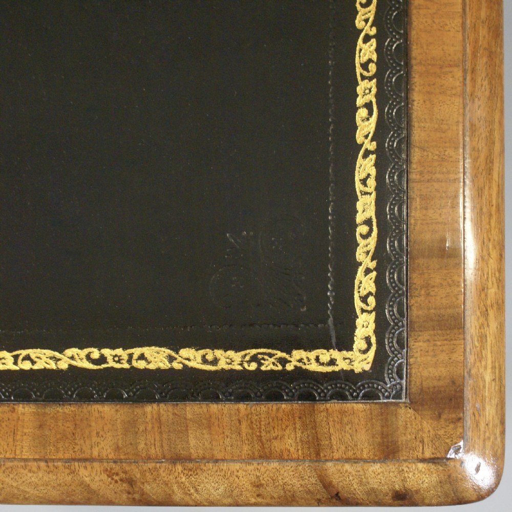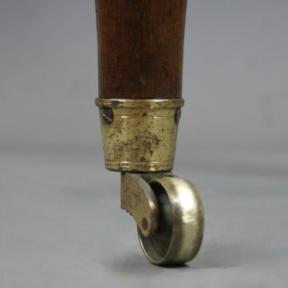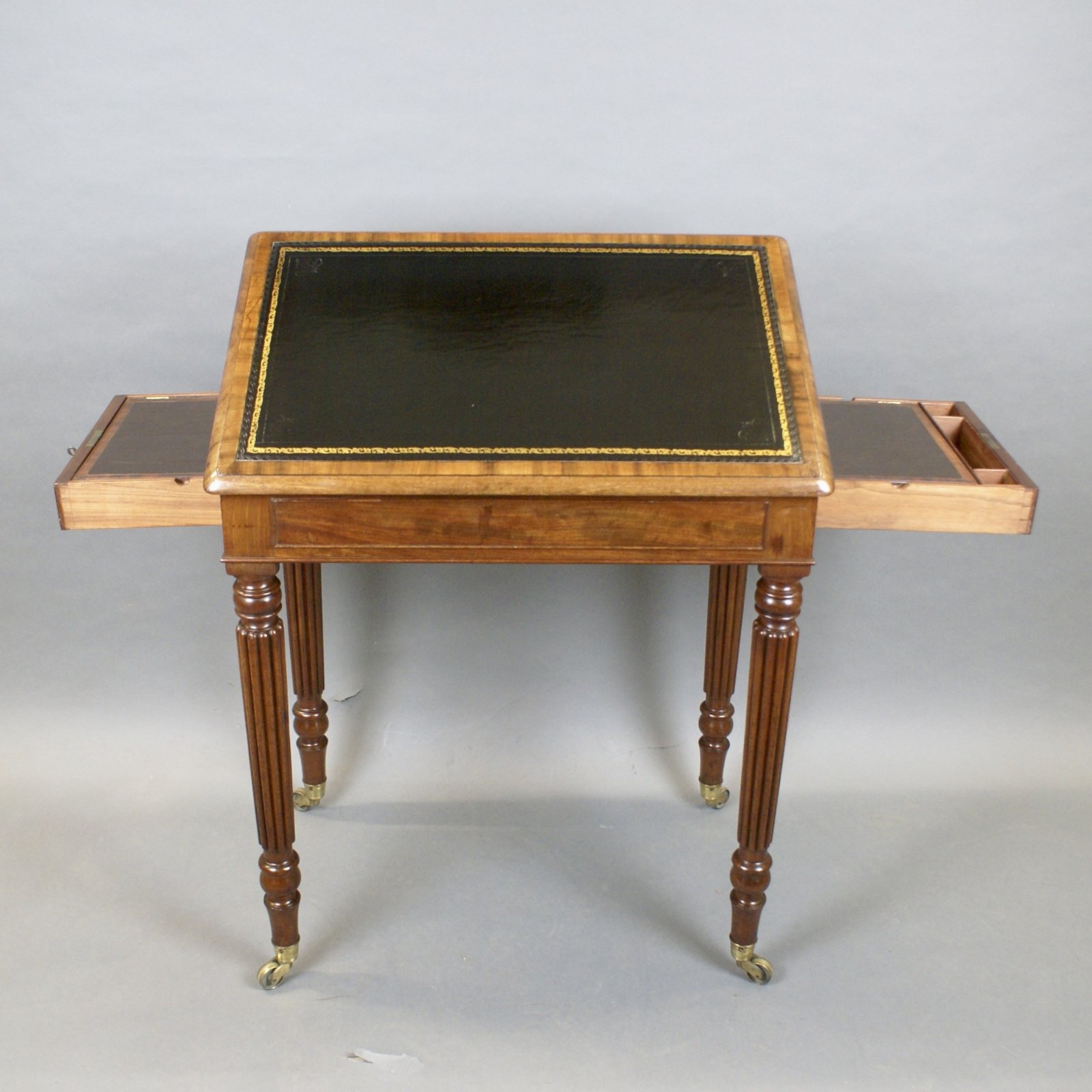 A Chamber writing table attributed to Gillows of Lancaster. Of fine quality, this small table bears all the hallmarks of Gillows including stamped patent castors, turned reeded legs, distinctive turned wooden knobs, two pin locks and of course the quality of timber and craftsmanship. With a drawer at either end, each with a hinged leather lined flap and an ink and pen tray in one drawer. The adjustable rising top has a thumb molded edge, cross-grain banding and inset leather writing surface. In very good and original condition and with a good colour. 760mm high, 710mm wide and 450mm deep. English. Circa 1825.