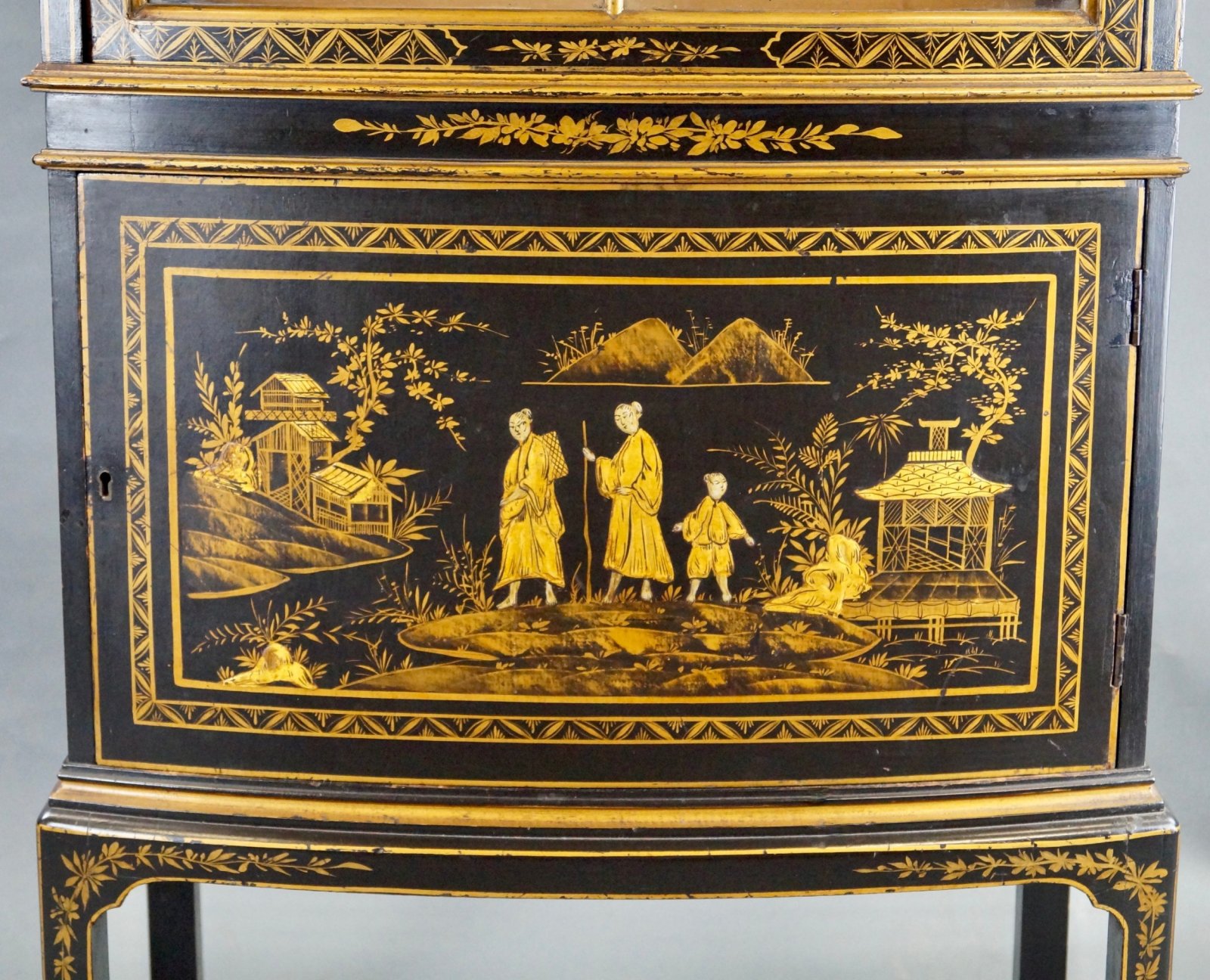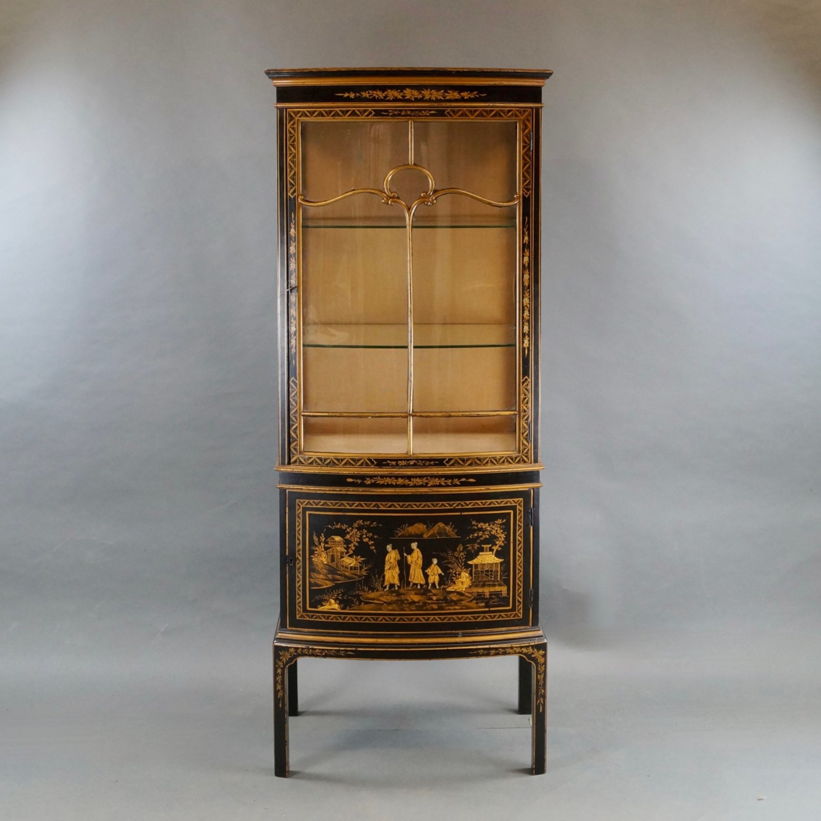 A decorative Chinoiserie bow-fronted vitrine. An elegant piece, in very good and original condition and beautifully decorated in the Chinese taste. 1520mm high, 610mm wide and 420mm deep. English. Circa 1920.