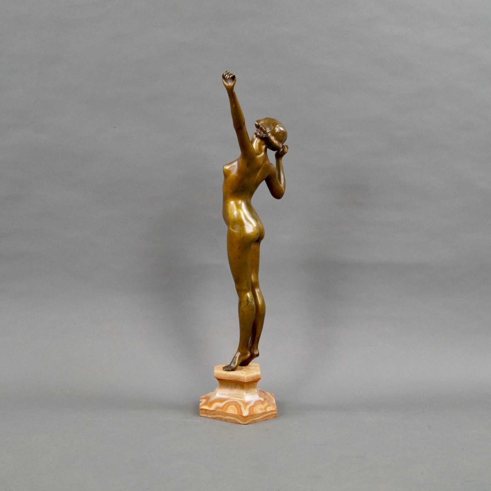 A fine Art Deco gilt bronze of a female nude, elegantly posed and raised on an Alicante Red marble base. In good and original condition. 570mm high, 200 mm wide and 150mm deep. French Circa 1930.