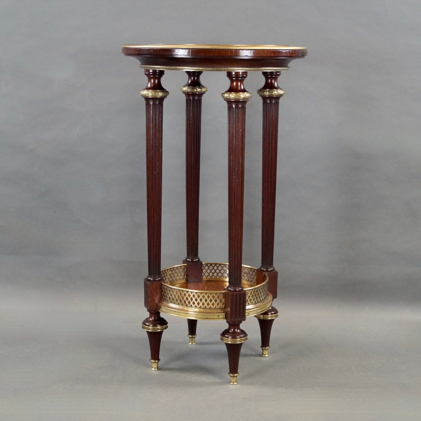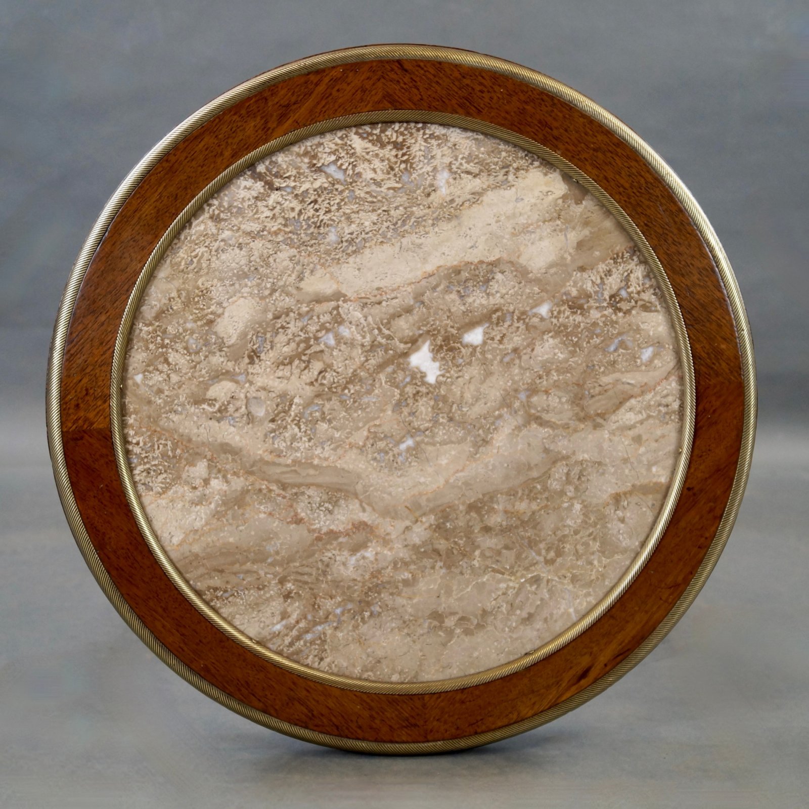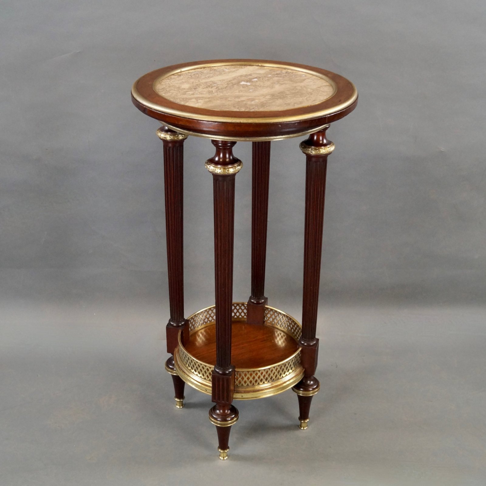 A fine French mahogany And Marble Table. Raised on turned and fluted legs with brass feet, ankles and collars and united by a brass galleried under-tier. The top with brass moldings and a polished Travertine center. In very good and original condition. 760mm high and 420mm diameter. French. Circa 1900.
