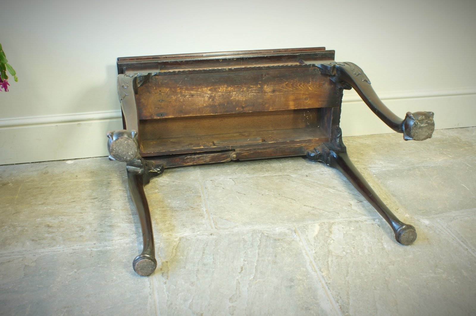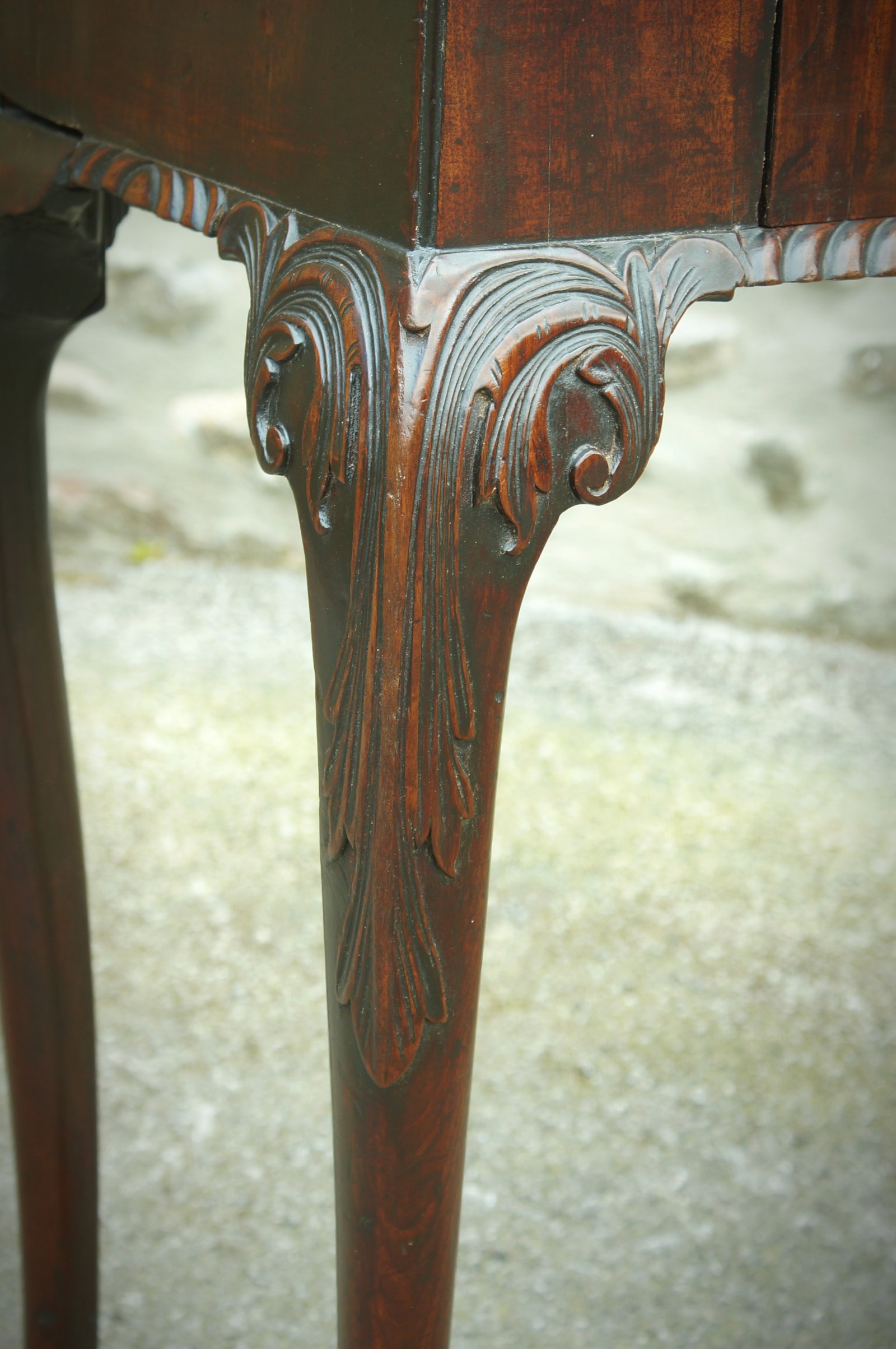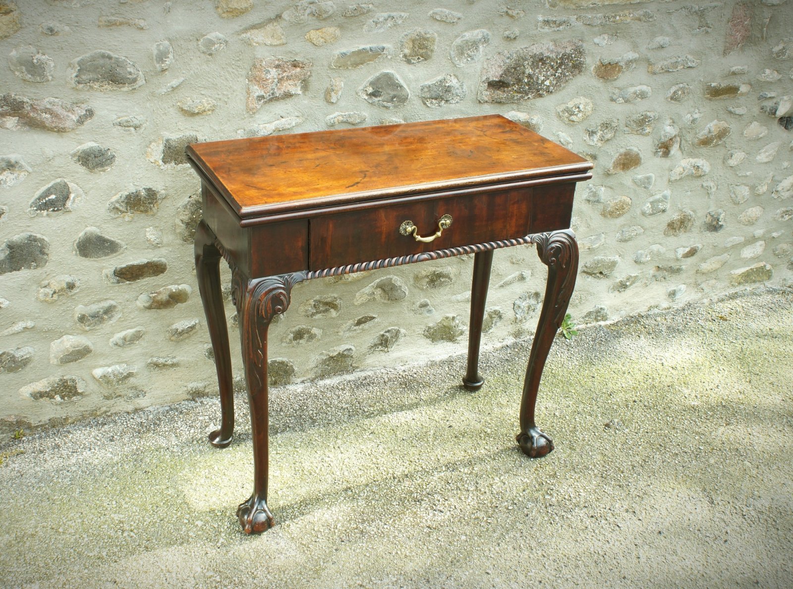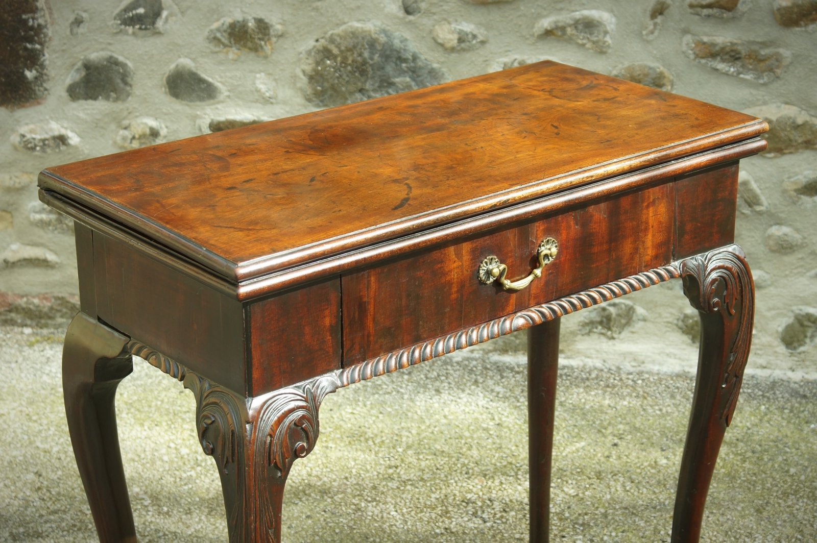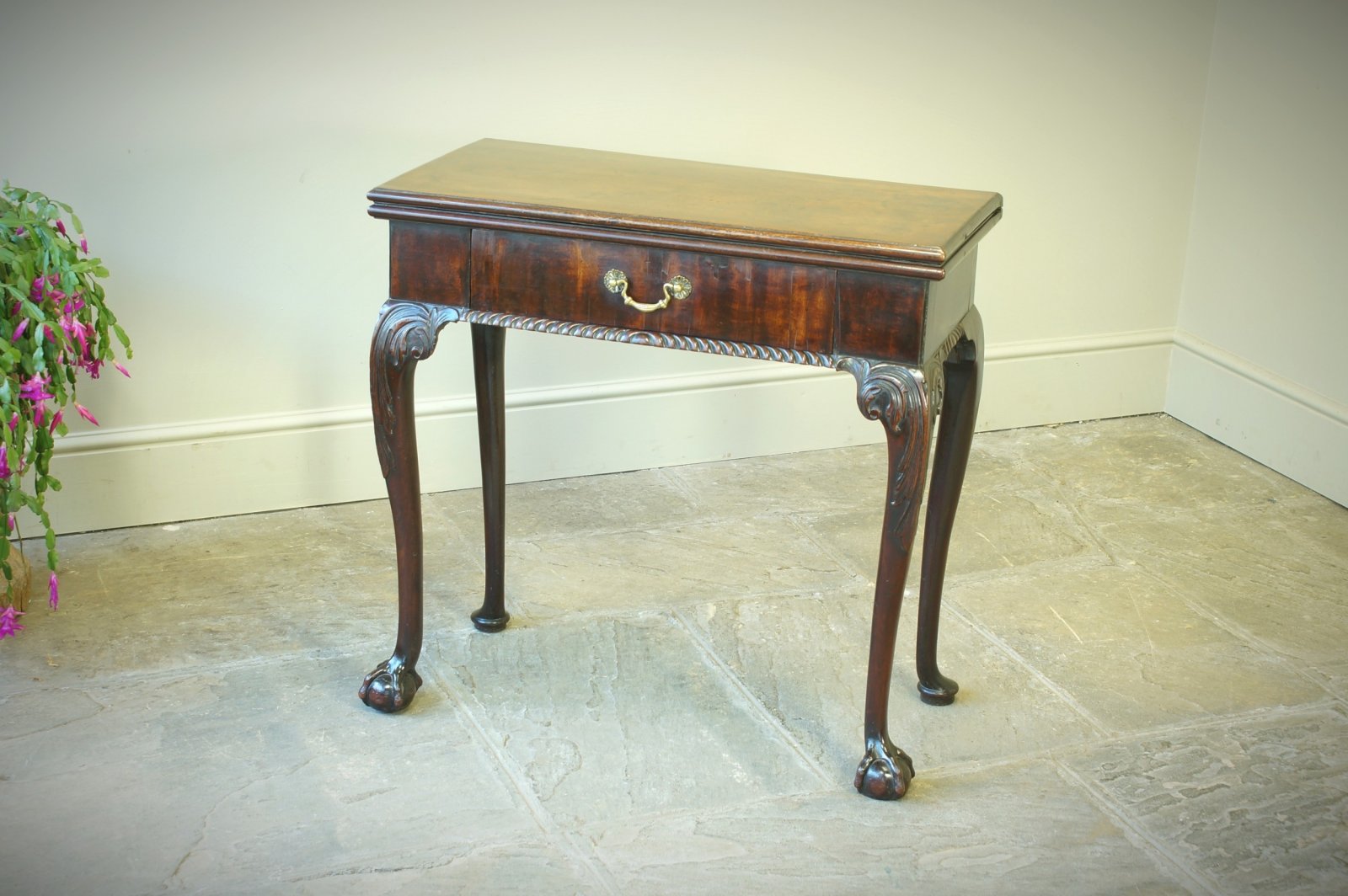A lovely quality Cuban mahogany card table with counter holders and olive green baize. Its shapely cabriole legs feature foliate carved knees and ball and claw feet at the front. A single drawer with an original brass handle sits above the well-carved frieze. The rear cabriole legs have pad feet, one of which has a hinged gate action that supports the fold-over top when opened. It''s in excellent original condition, of a good colour and of a superb small size.