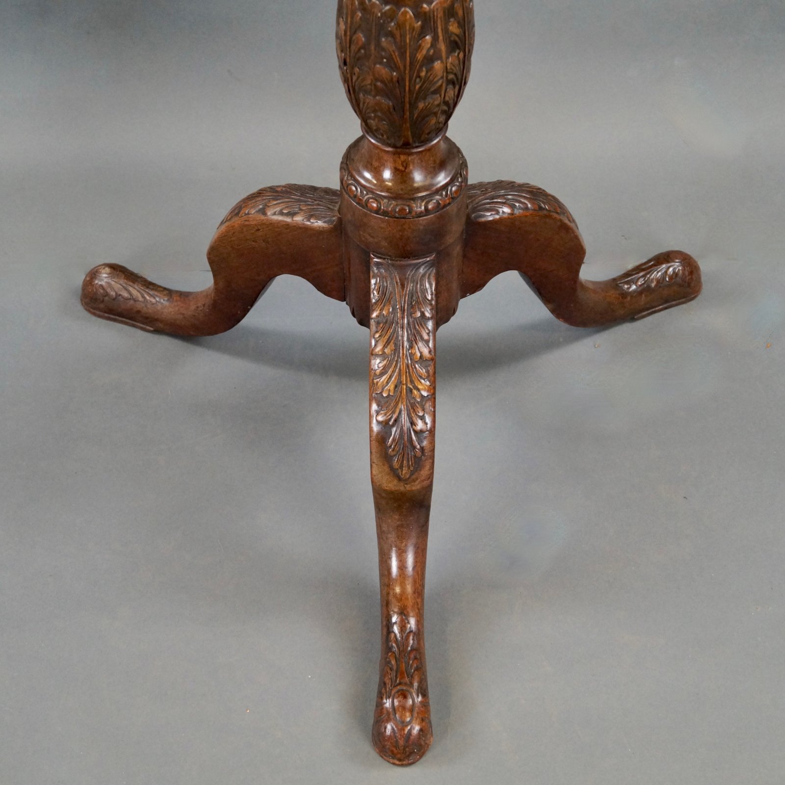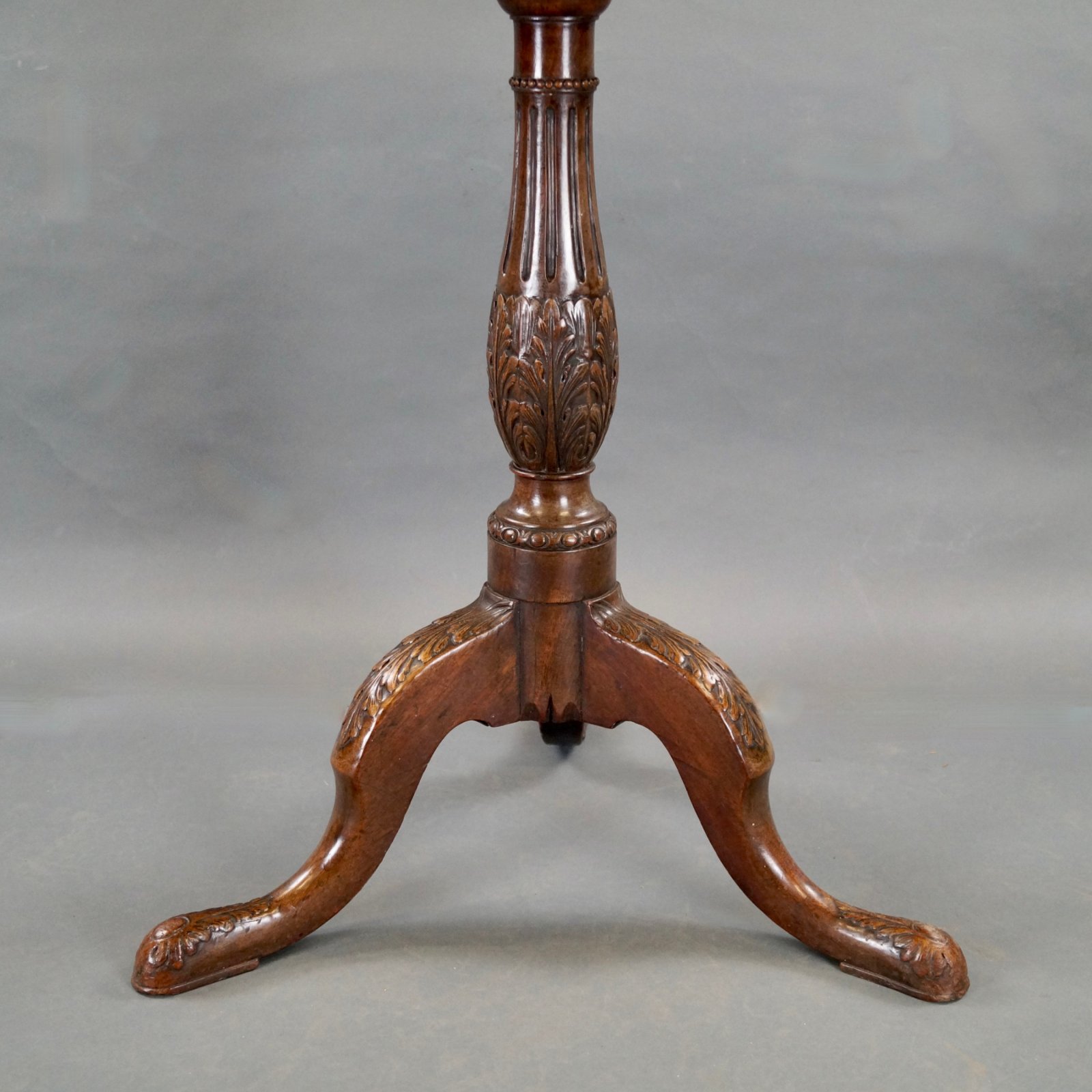A fine George III Mahogany Carved Tripod Table. With an unusual one piece dish top with carved edge, supported by a tripod base with a shaped, fluted and acanthus leaf carved column raised on cabriole legs with acanthus leaf carved knees and toes. In very good and original condition. 700mm high and 600mm diameter. English. Circa 1780.