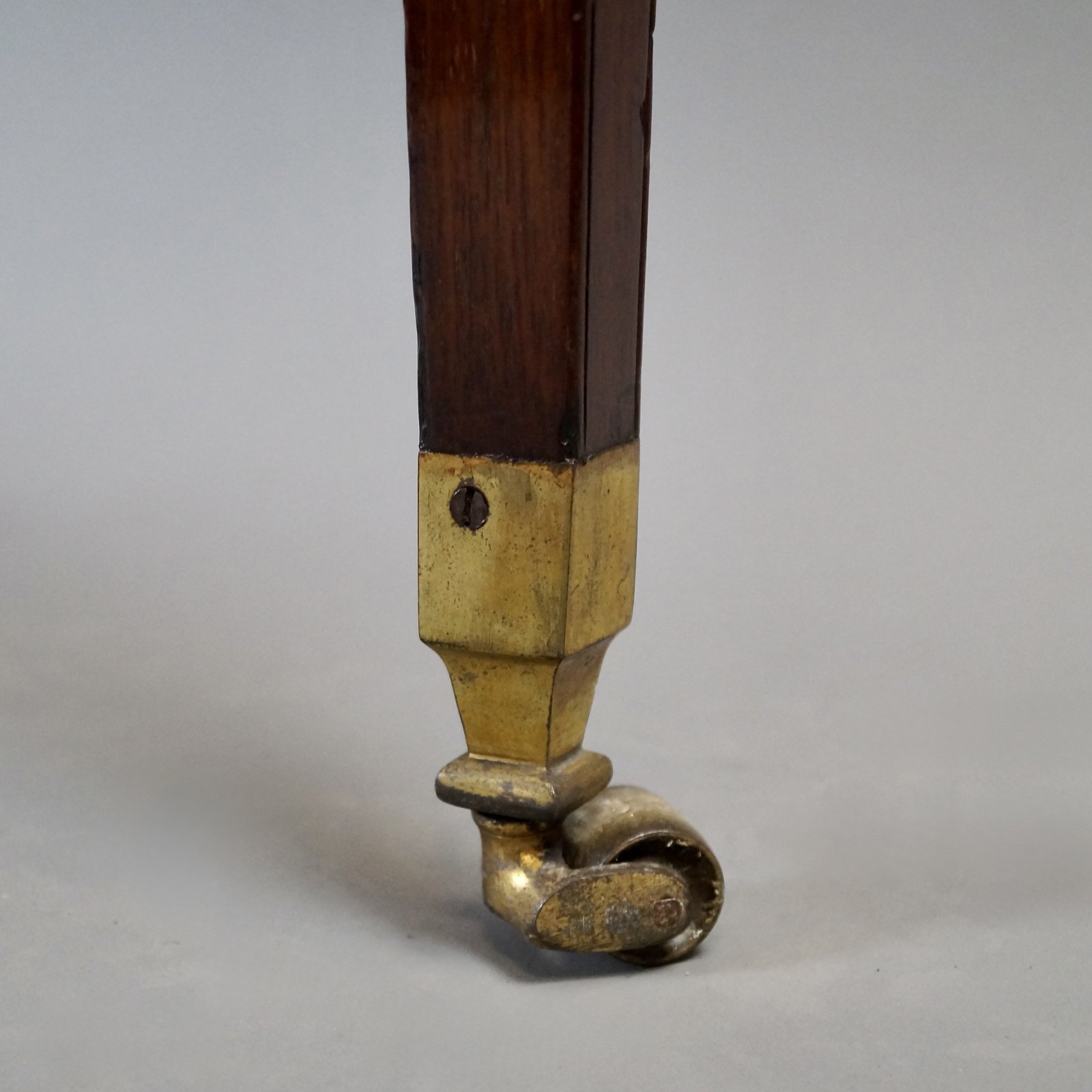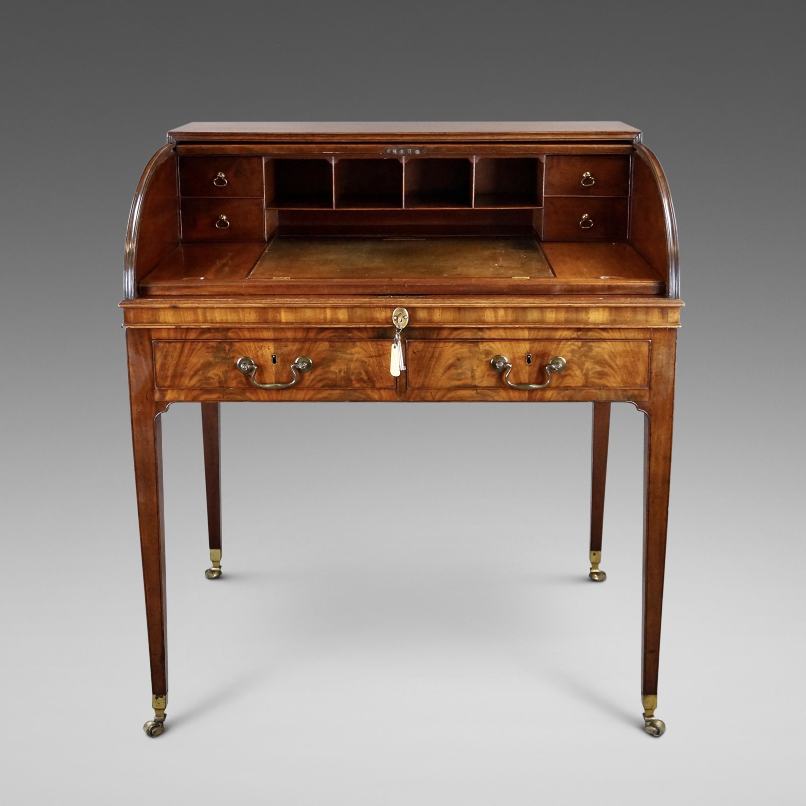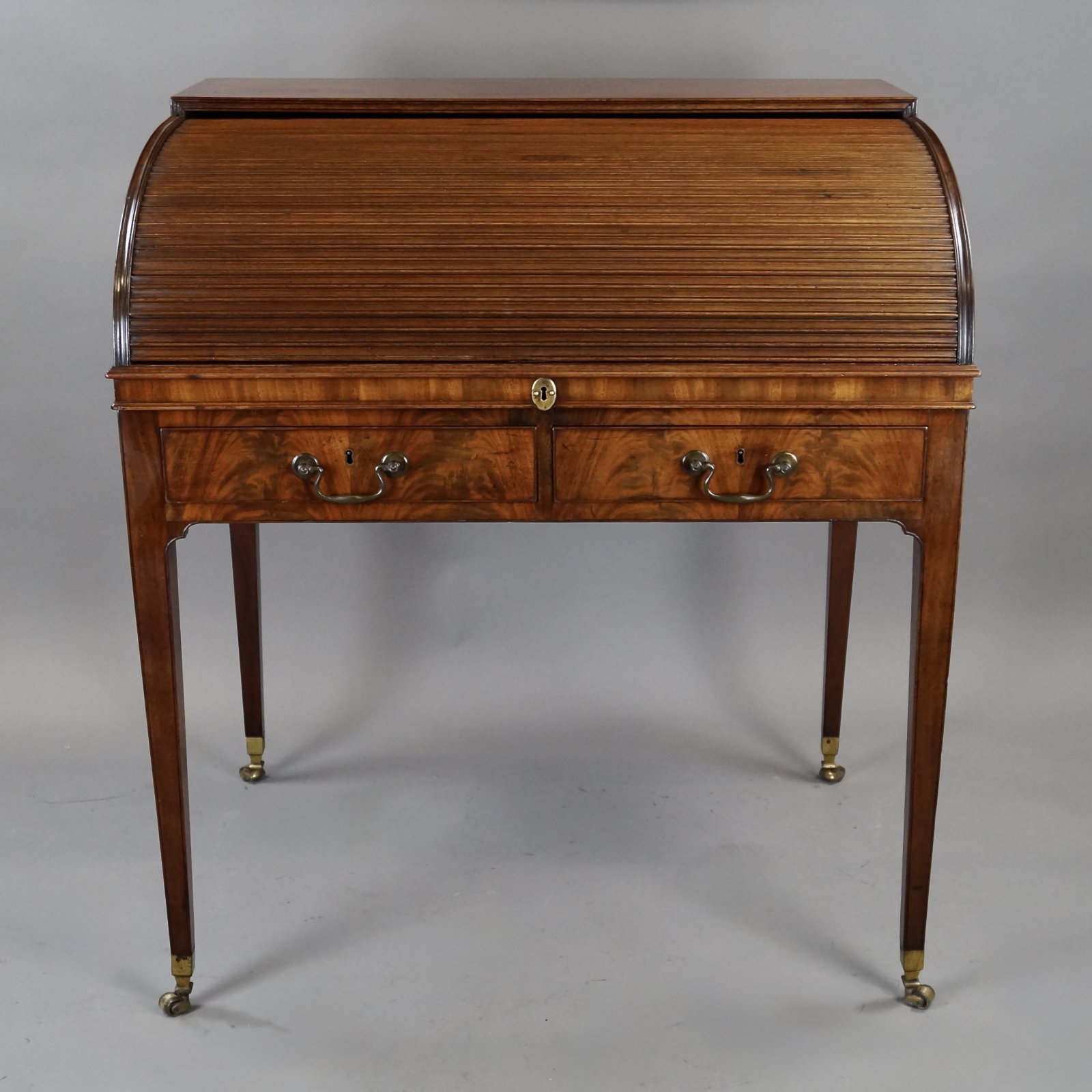 See shipping detailsA very attractive George III flame mahogany roll top desk. Raised on square tapered legs with original shaped brass castors and at the top, re-entrant corners. The frieze consists of two drawers to the front and to either side one drawer and one dummy, all with original swan neck handles and working locks. The tambour top rolls opens to reveal an interior of pigeon holes and drawers with a slide out desk and rising leather writing surface. In excellent and original condition and with an excellent colour and waxed patina. 1000mm high, 890mm wide and 640mm deep. English. Circa 1790.
