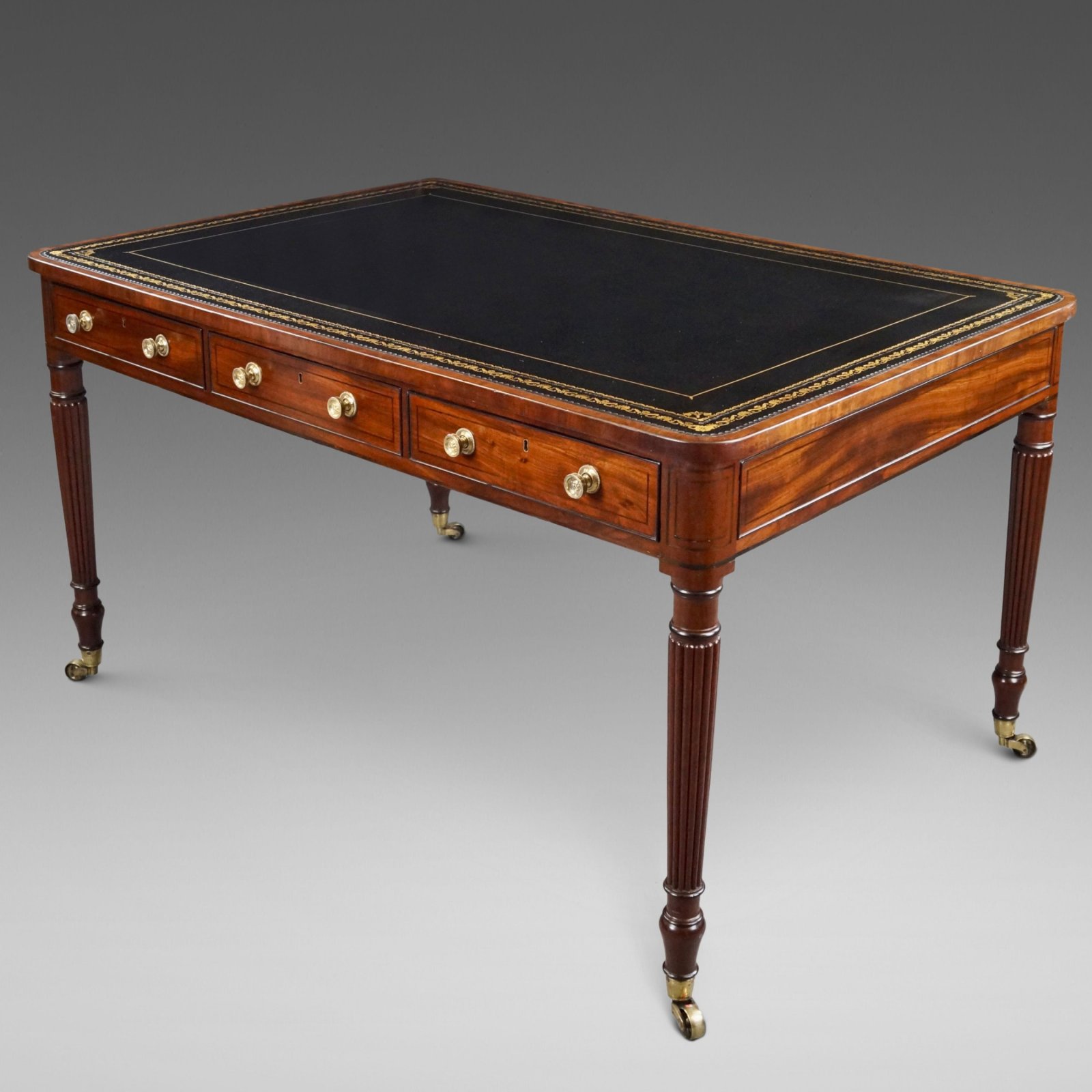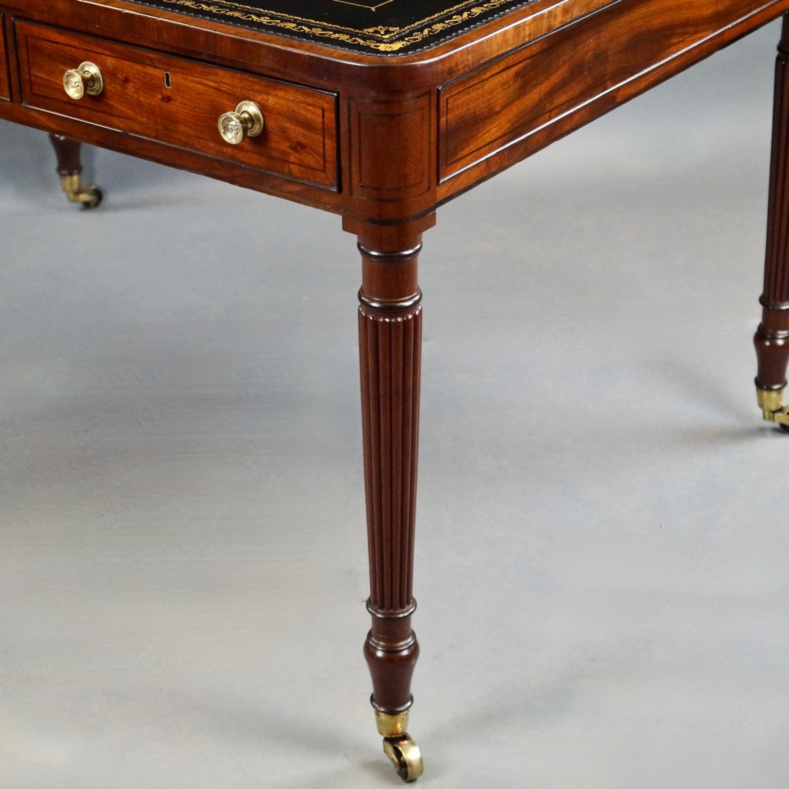A fine George III mahogany partners writing table. Of superior quality and manufacture this table stands on fine turned and reeded legs with ebonised highlights and original brass castors and with three cedar lined drawers to either side, all inlaid with ebony stringing and retaining their original locks and lion''s mask knob handles. The top has a cross-banded edge and an inset leather writing surface which is gilt and blind tooled. In very good and original condition. 760mm high, 1370mm wide and 960mm deep. English. Circa 1810.