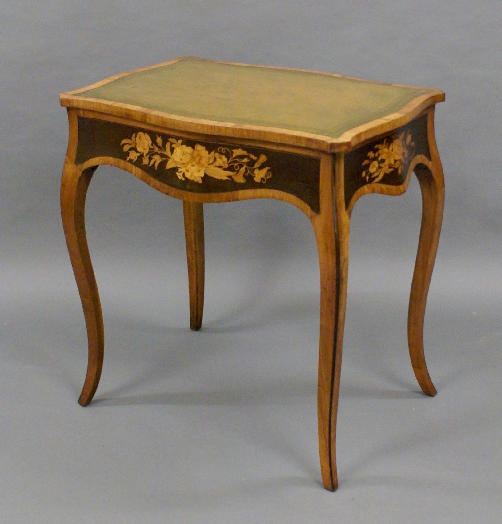 A most attractive small, single drawer, marquetry inlaid writhing table. Raised on elegant cabriole legs, the table is serpentine shape and marquetry inlaid on all sides and has a banded top with an inset leather writing surface. In very good and original condition. 730mm high, 710mm wide and 510mm deep. English. Circa 1860.