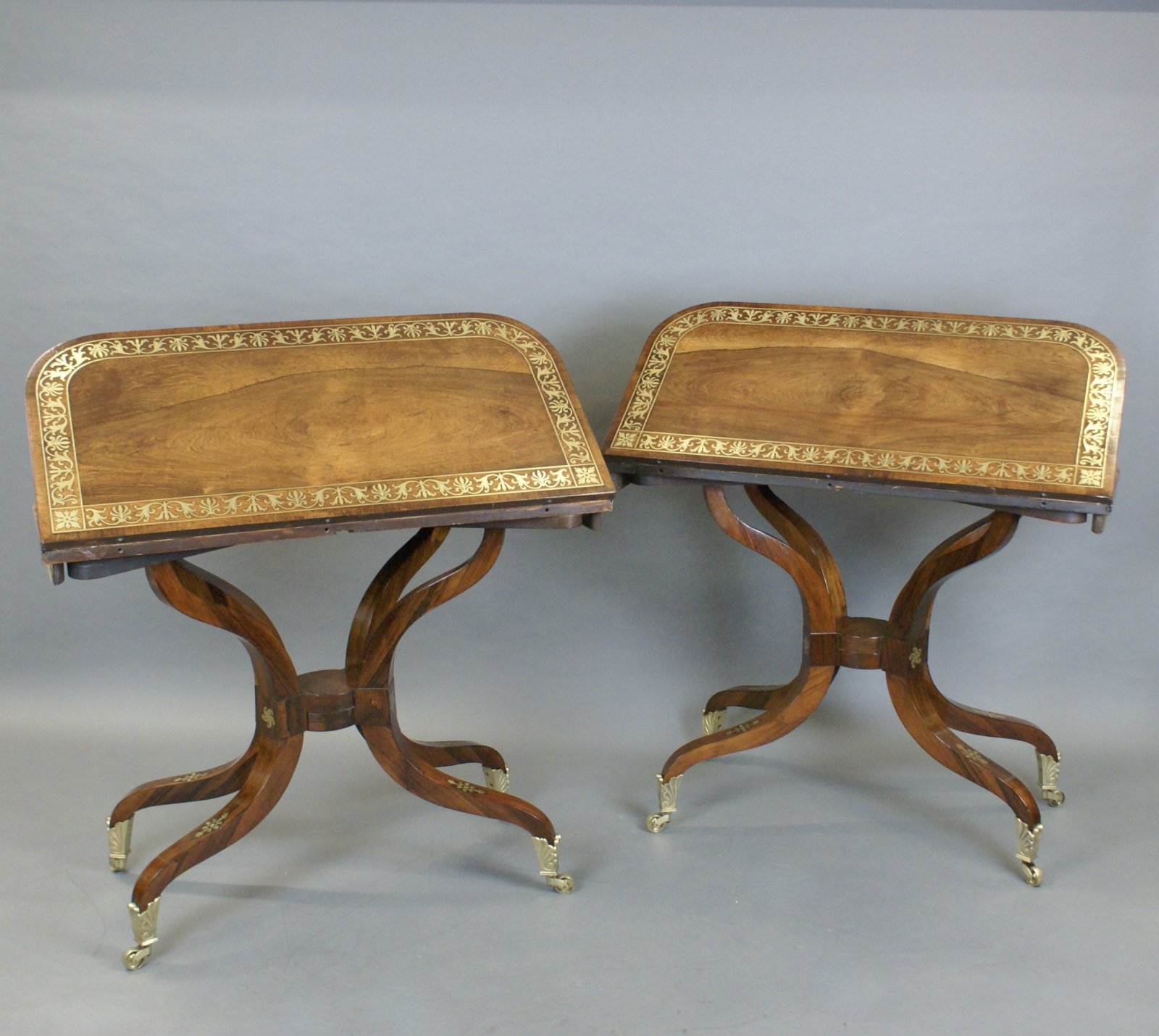 A fine pair Regency rosewood card tables attributed to George Oakley, the baize lined, rounded rectangular fold over top with crossbanding and frieze with brass molding on sabre supports joined by a central circular boss which performs a scissor-action spread to stabilise, over down swept serpentine legs with brass star and fleur-de-lis detailing and terminating in cast brass acanthus capped castors, 750mm High, 900mm wide and 440mm deep. English. Circa 1820