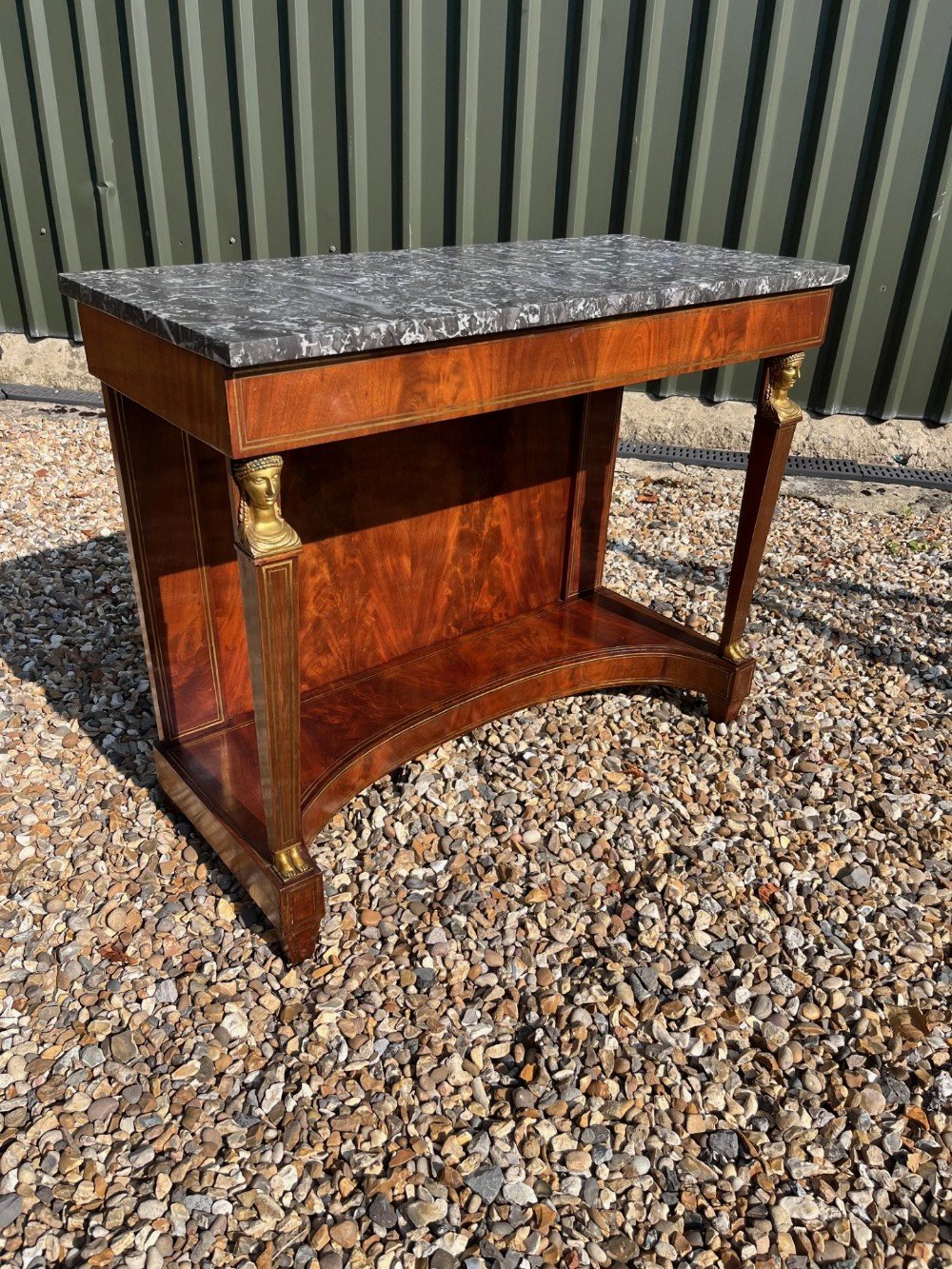 A French Empire Period mahogany console table. The rectangular grey fossilised marble top above a flame veneered frieze with brass inlaid detail. Raised on tapering supports with Egyptian Female ormolu Caryatids and further brass inlaid detail throughout. Having a flamed mahogany back panel and concave base. French circa 1820. In beautiful condition