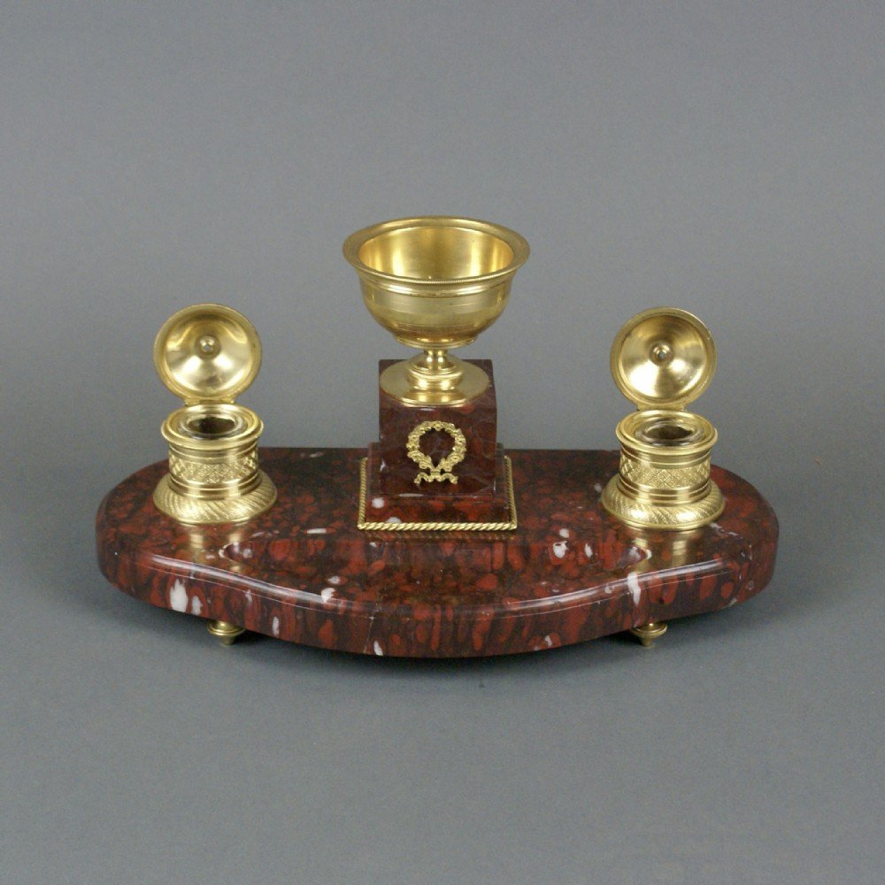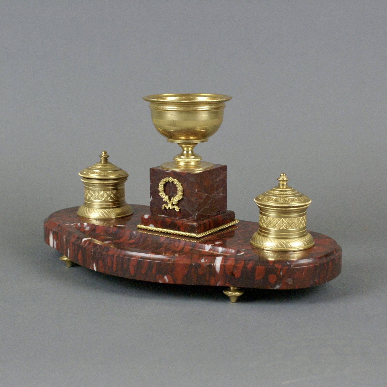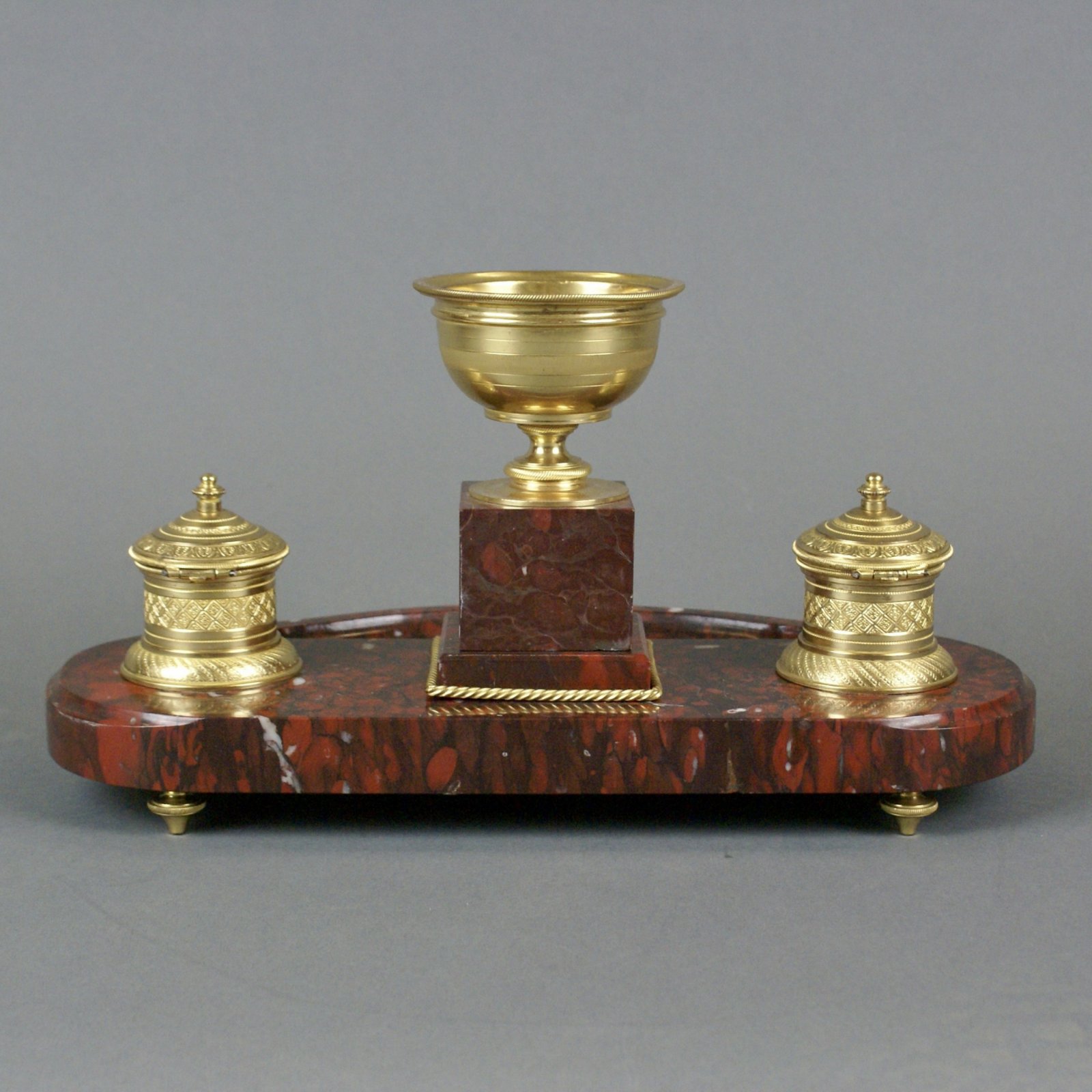 A French marble and ormolu Ink Stand, beautiful quality and in very good condition. 190mm high, 360mm wide and 180mm deep. French. Circa 1920.