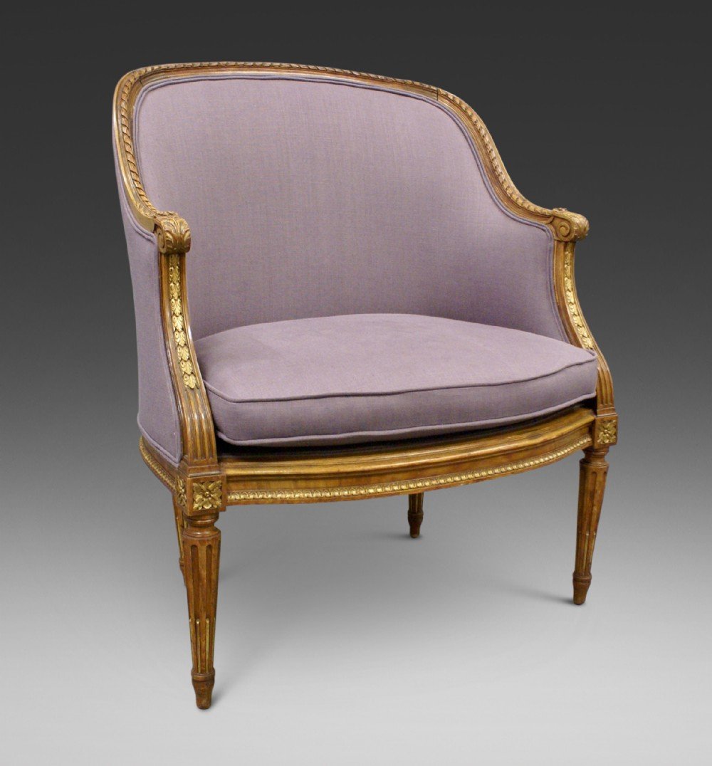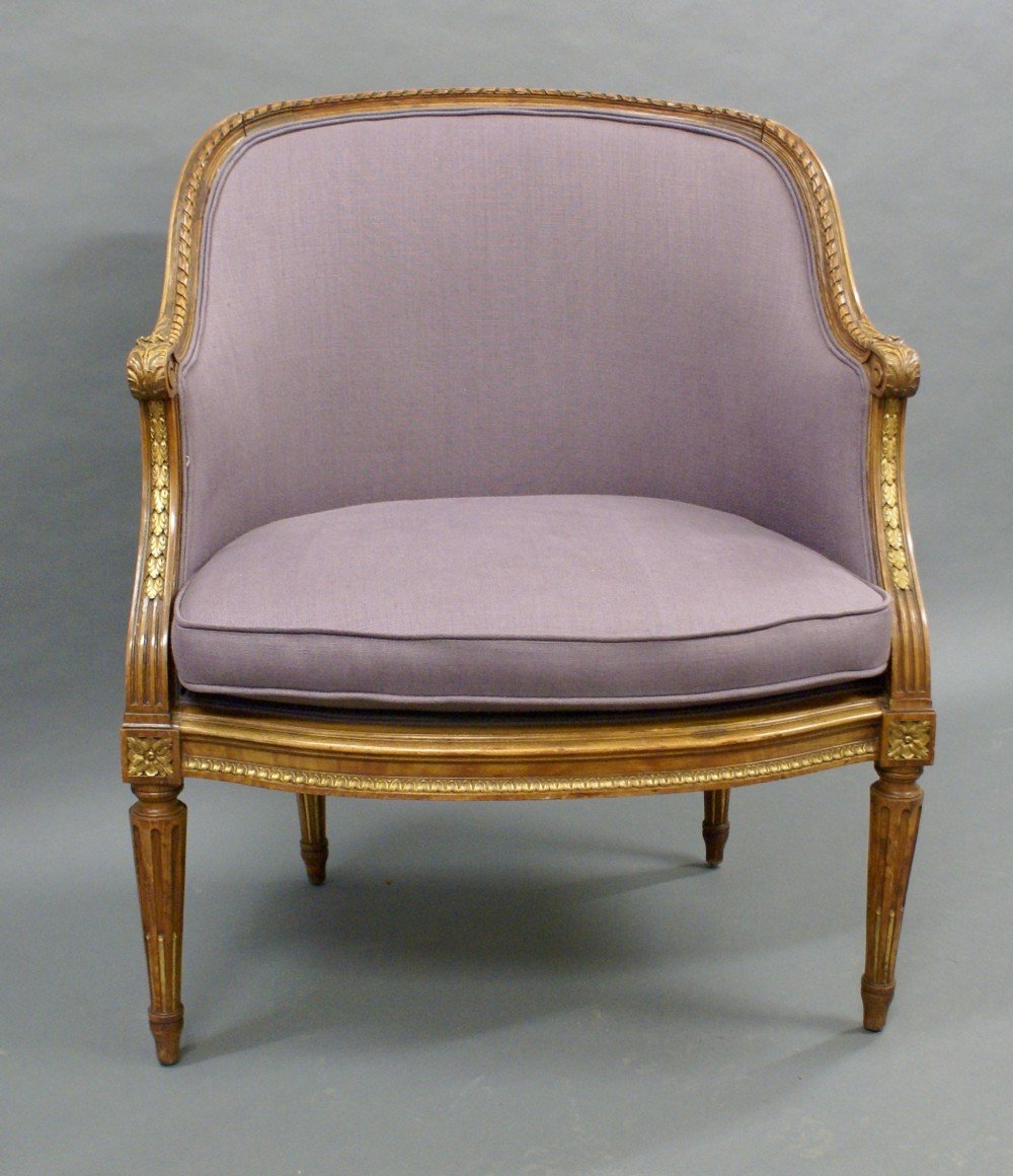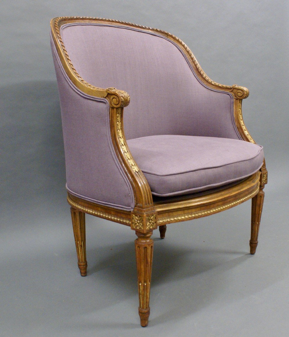 A French walnut arm chair on turned and stop fluted legs and with carved moldings and patera which have original gilt high-lighting. The chair has just been re-upholstered. 960mm high, 750mm wide, 640mm deep and 470mm seat height. French. Circe 1870.