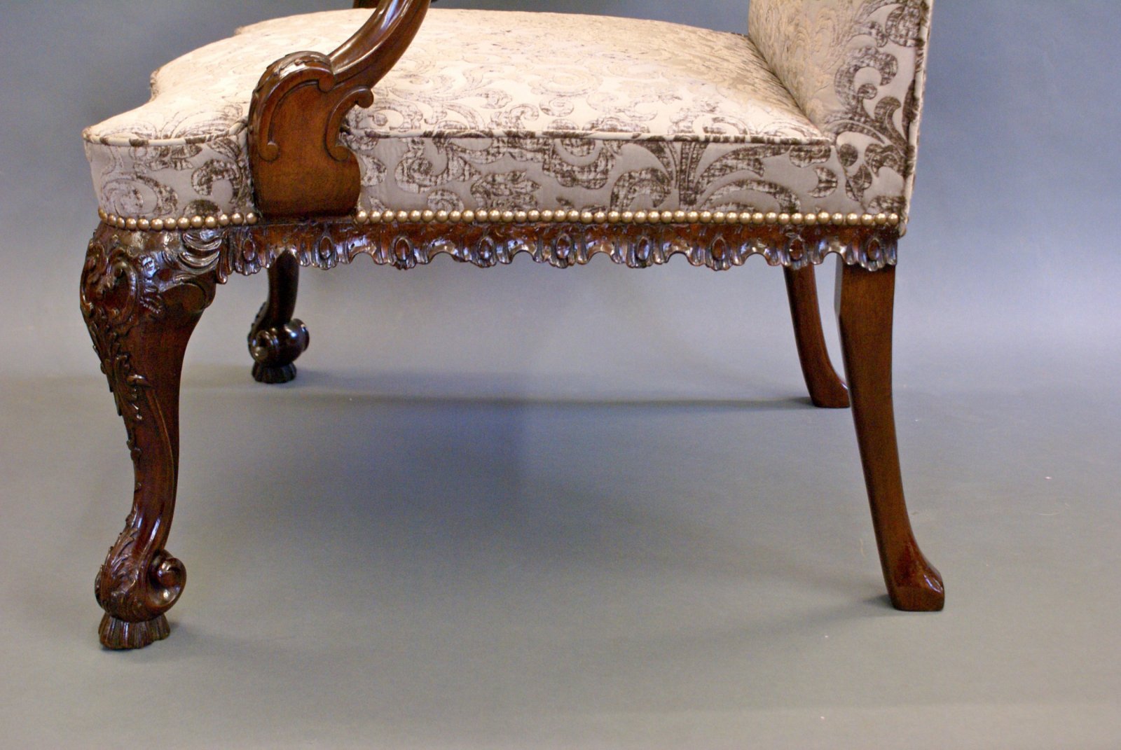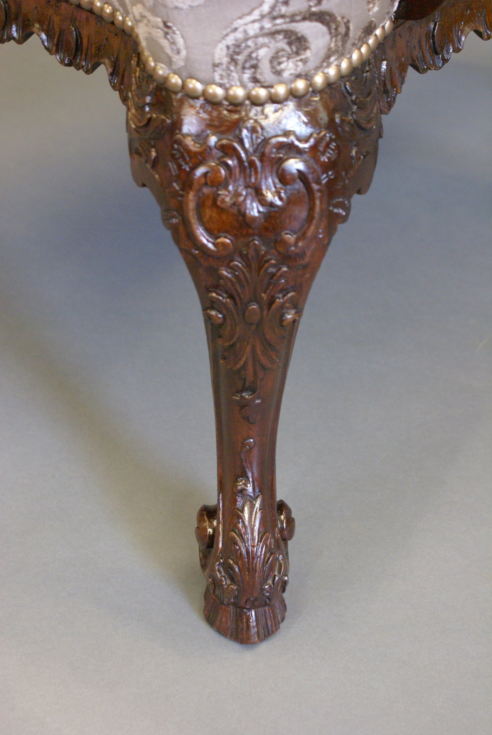 A George II style Mahogany Gainsborough/Library arm chair with the downswept arms with foliate carving, carved apron, cabriole legs carved with cabochon and acanthus and carved scroll toes. The chair has recently been beautifully re-upholstered. 1020mm high, 750mm wide, 790mm deep and 450mm seat height. Circa 1880