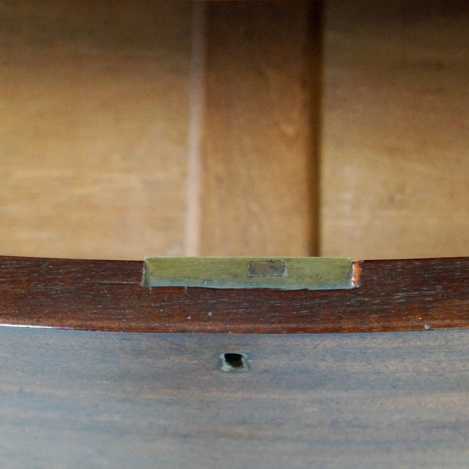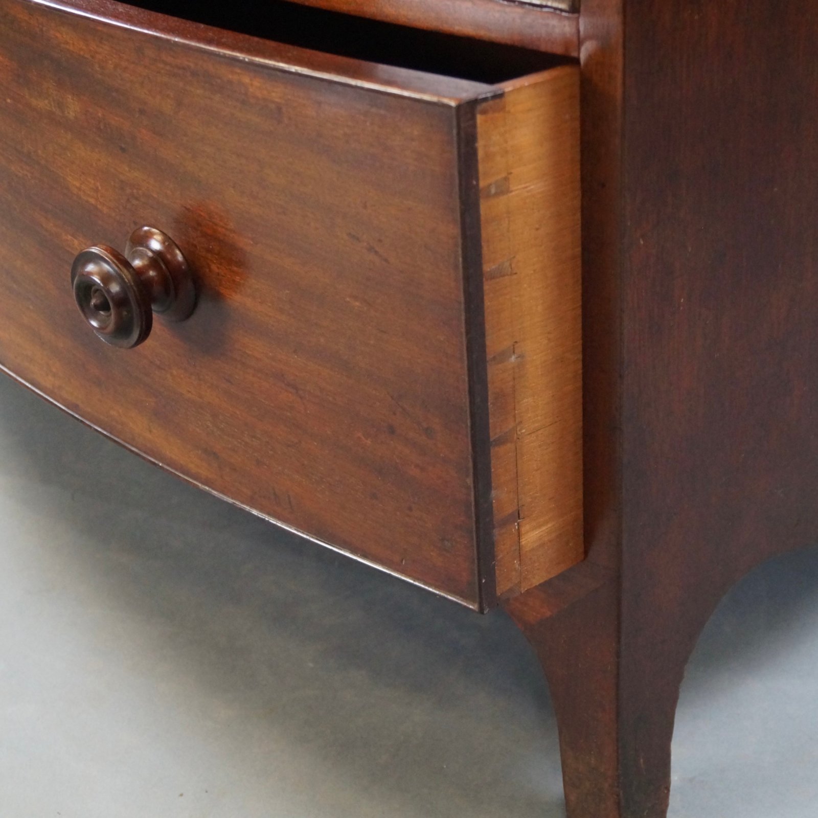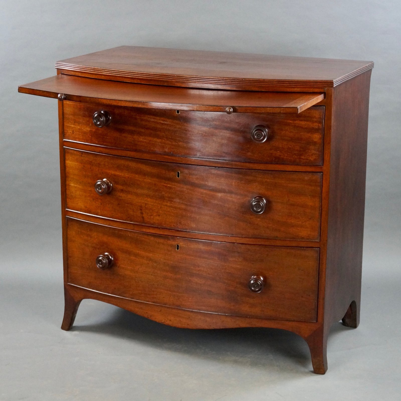 A George III bow-fronted chest. Raised on splay feet with a shaped apron and above three long mahogany lined drawers with original locks and turned wooden knobs and a brushing slide and the top with a reeded edge. In very good and original condition with a fine patina and waxed finish. 920mm high, 920mm wide and 550mm deep. English. Circa 1820.