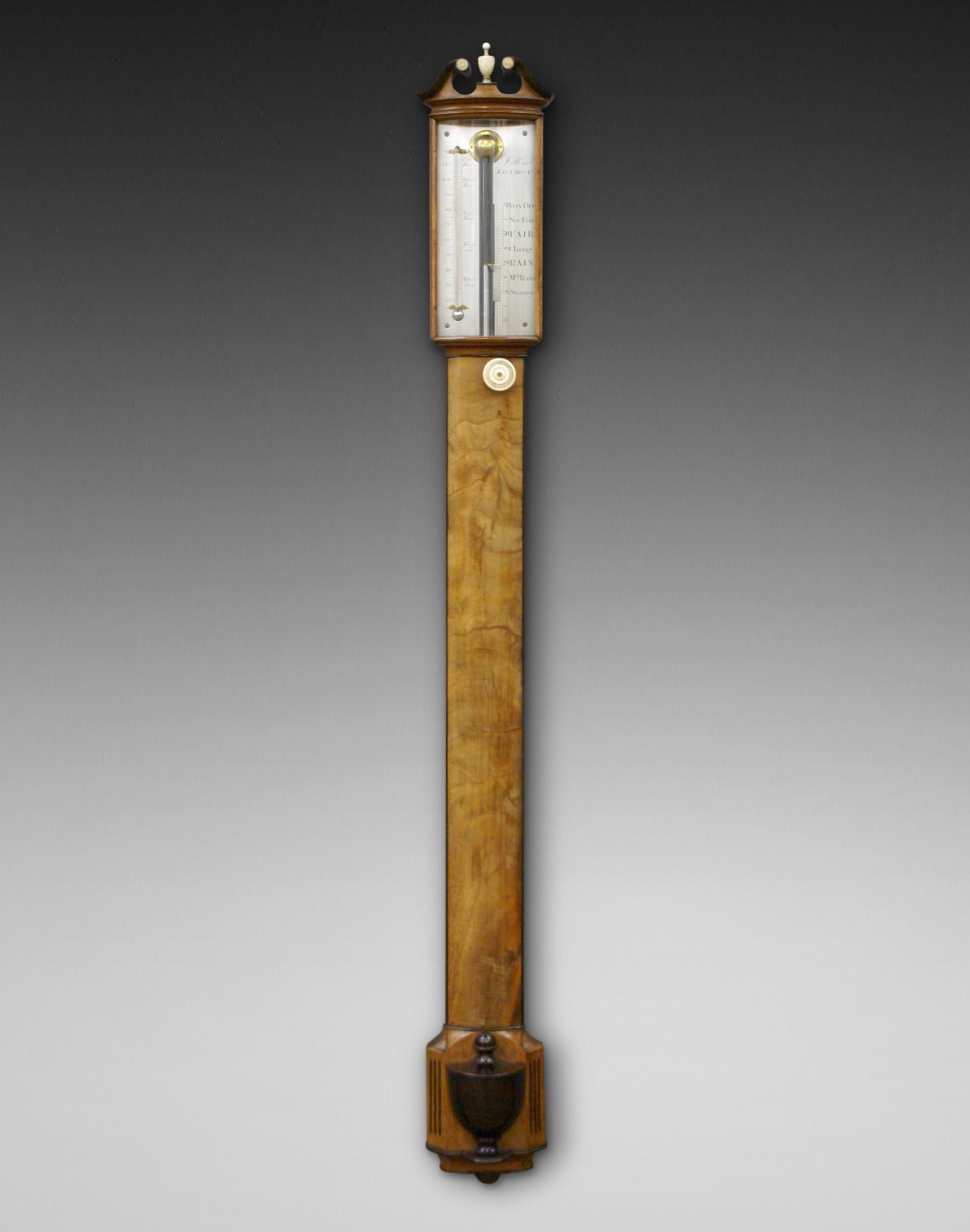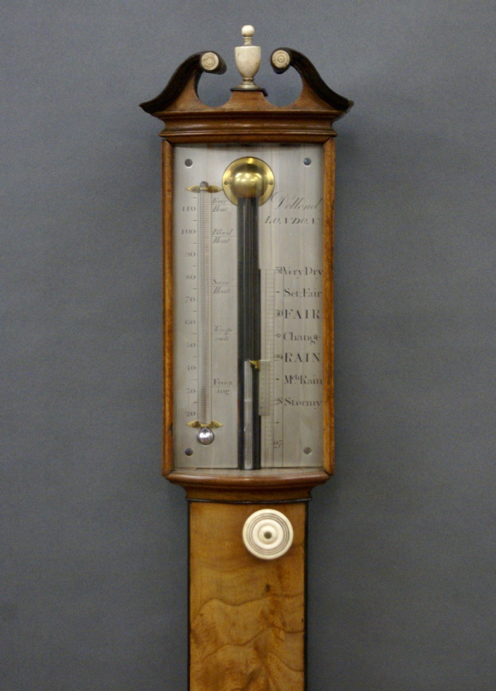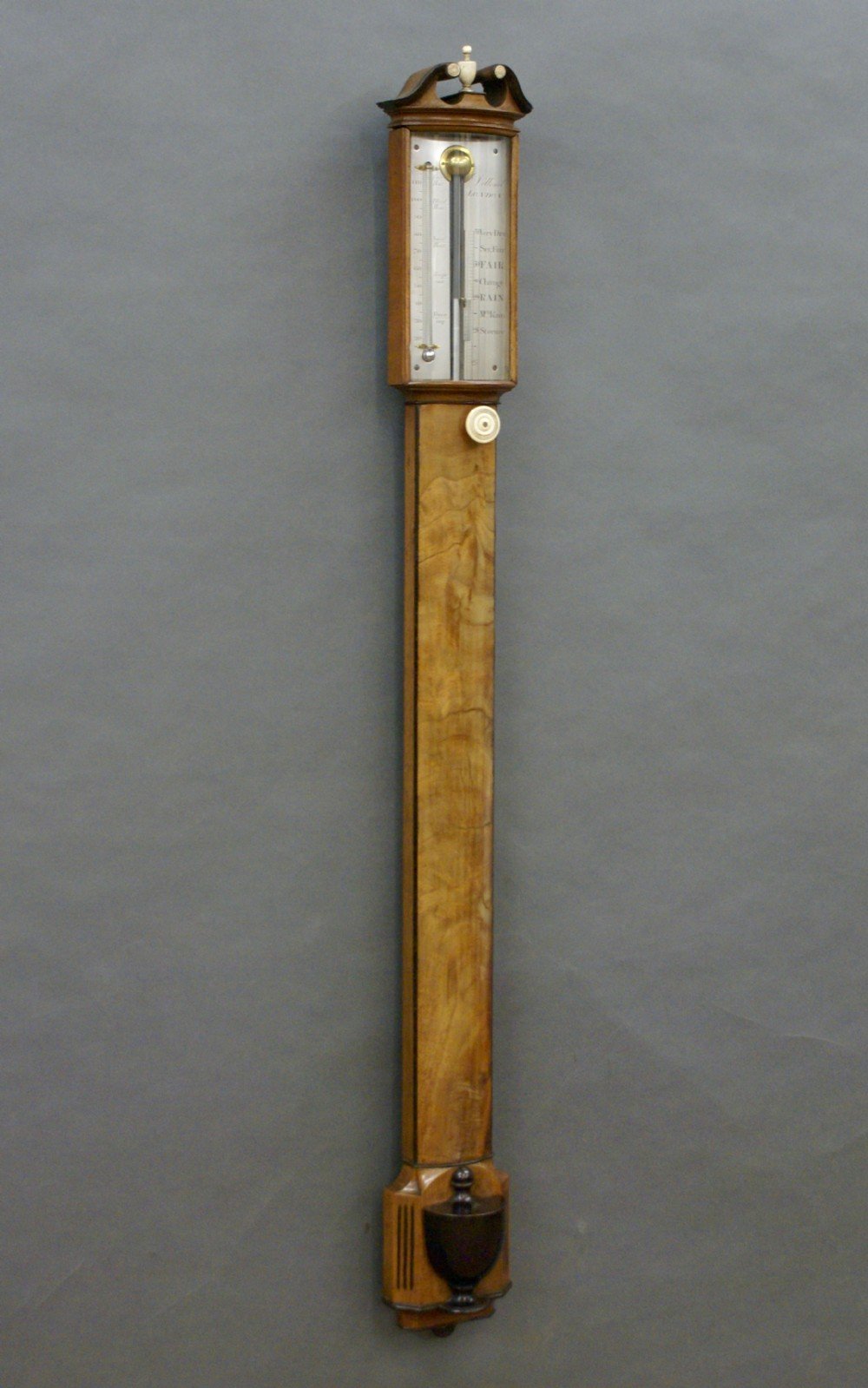 A George III mahogany and ivory mounted stick barometer by Peter Dolland, the top with a swan neck pediment with central Neoclassical urn finial, above a bow fronted glass section with silvered metal register plate, to contain a thermometer and vernier indicators for the barometer with mercury tube, signed Dolland London, the flame mahogany trunk with ivory adjustment knob, the base with ebonised urn form cistern cover flanked by canted corners, 1030mm high, 120mm wide and 70mm deep. Circa 1810.