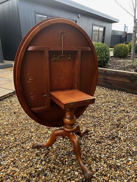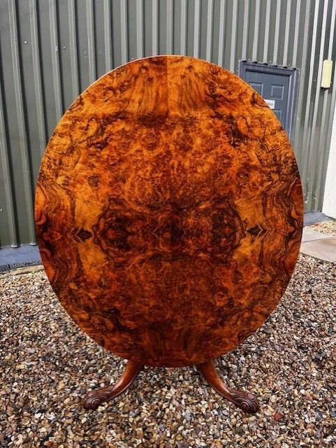 A Gillows Of Lancaster Victorian Period Burr Walnut Breakfast Table. The oval top veneered in beautifully figured and book matched burr walnut. The top can also be tilted. Raised on a turned walnut column with elegant cabriole supports with carved ''dolphin'' feet and inset brass castors. Stamped Gillows to the block. English circa 1850-1860. In superb condition