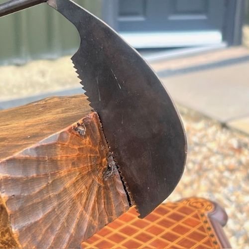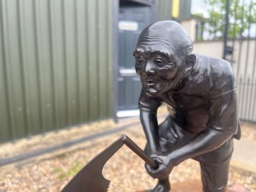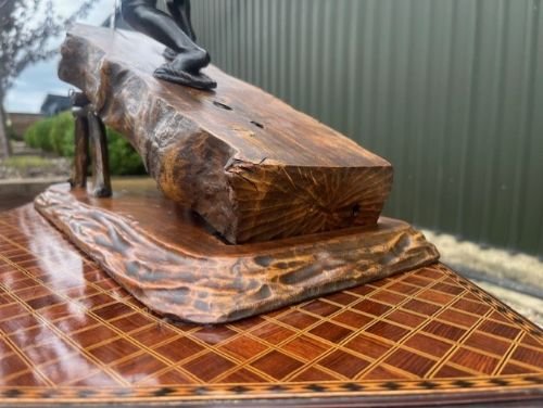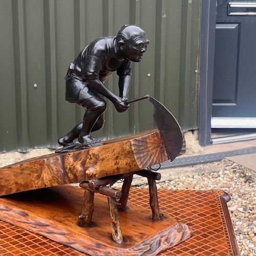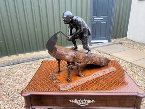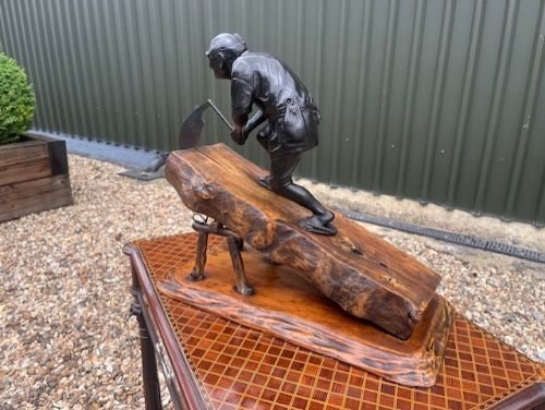 A Japanese Meiji Period bronze Okimono depicting a gentleman cutting wood. Raised on a naturalistic carved wood base. Signed. Circa 1880-1900