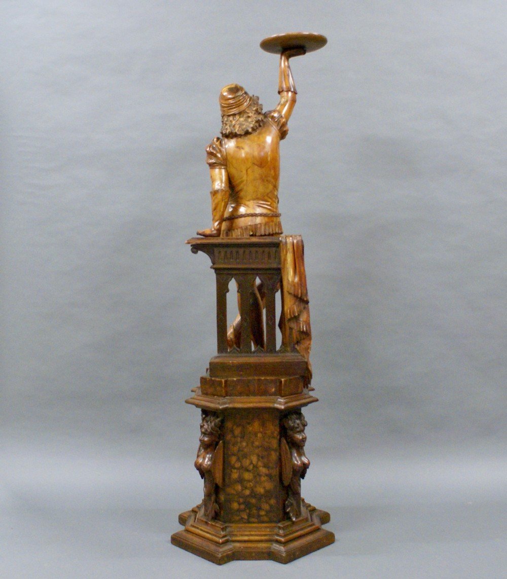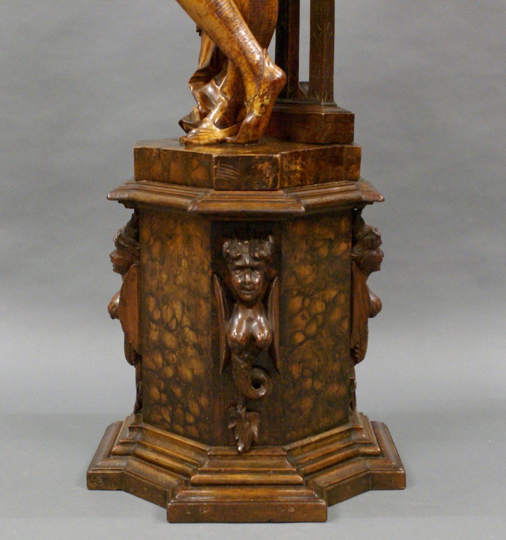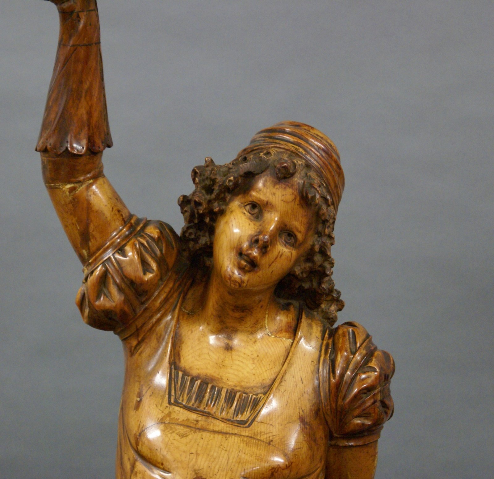 A large beautifully carved figure of a young woman. Depicted leaning against a railing with a shawl draped over, she has a relaxed and friendly pose and is dressed in a smock and stockings with a purse attached by a platted leather belt on her hip, she also has wavy hair and a cloth hat. The whole stands on its original carved plinth base and has a very good colour and patina. 1510mm high, 490mm wide and 490mm deep. Mid European. Circa 1860.