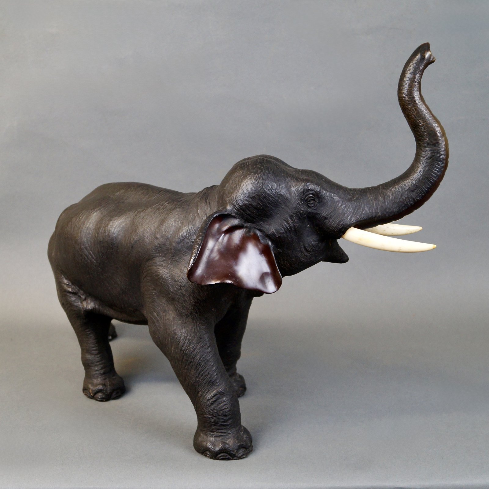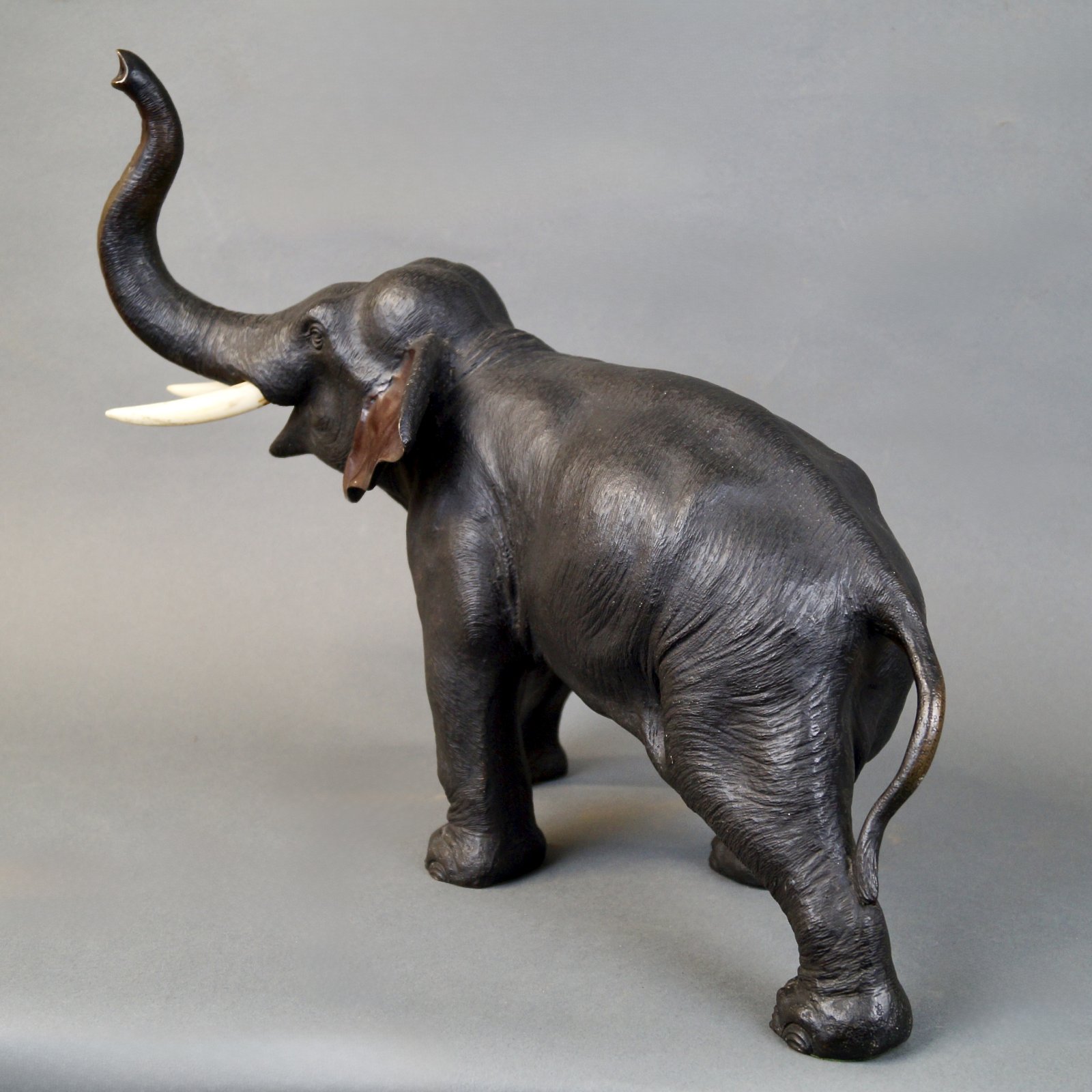 A Large Bronze Meiji Period Elephant okimono. Beautifully sculptured with fine detail and with Ivory tusks (APHA registered) This bronze elephant is of larger than usual size and measures 15" (380mm) high, 18" (460mm) wide and 8" (200mm) deep. In very good condition with dark patination. Japanese. Circa 1880.