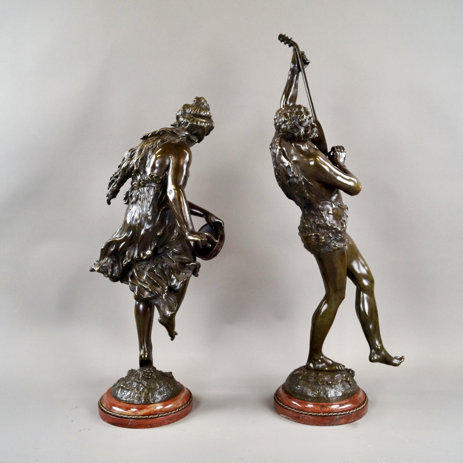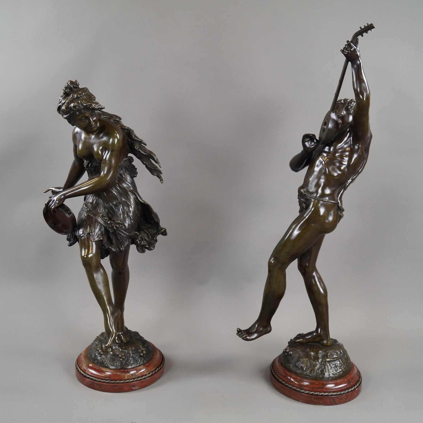 The male figure playing a mandolin, the female figure dancing and holding a tambourine, both raised on circular naturalistic bases cast with grapes and vine leaves, signed ROUSSEAU, greenish patination, raised on circular brèche rouge marble plinths. 830mm high, 330mm wide and 310mm deep. Belgium. Circa 1910.