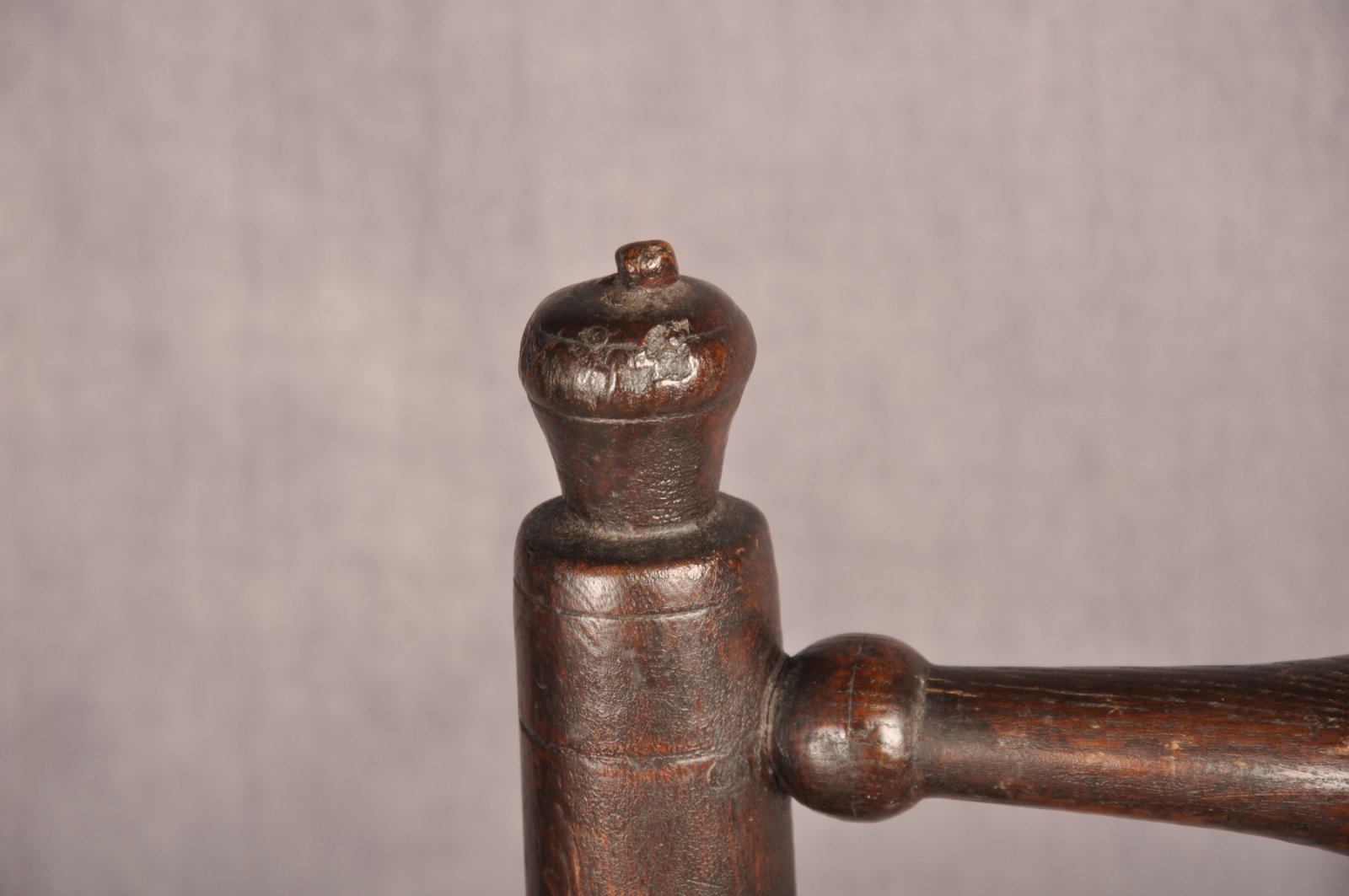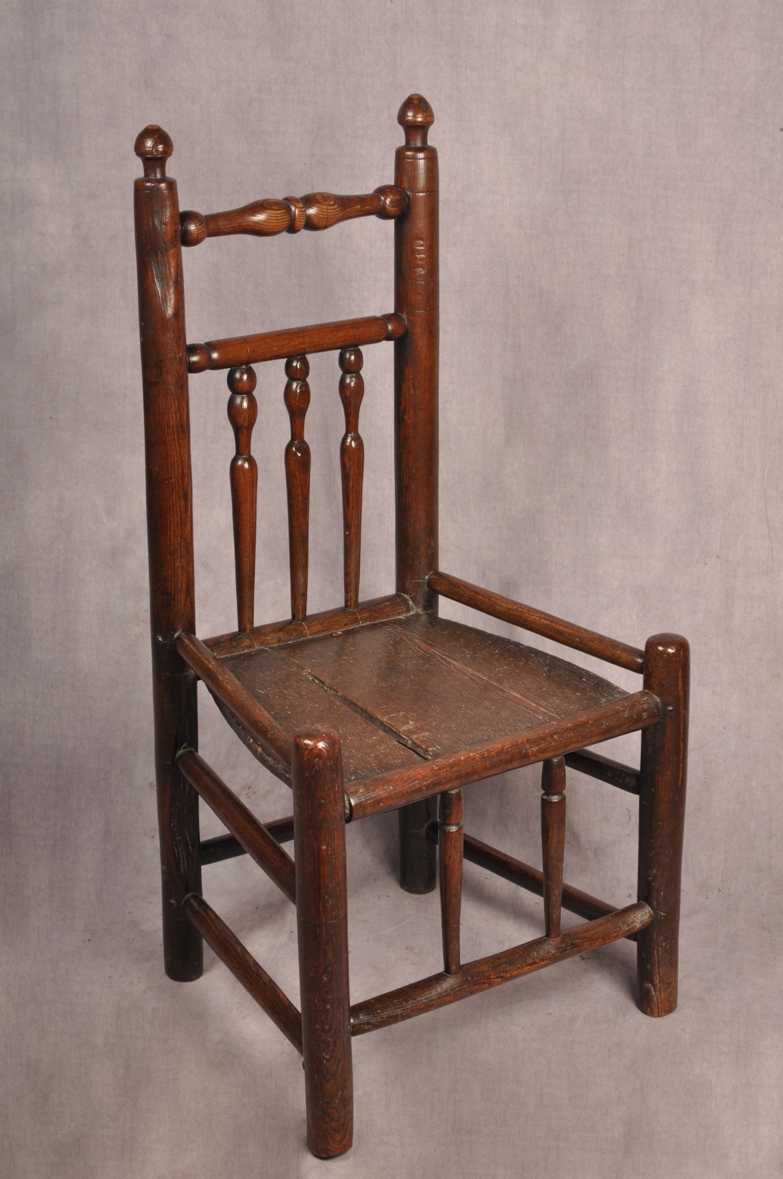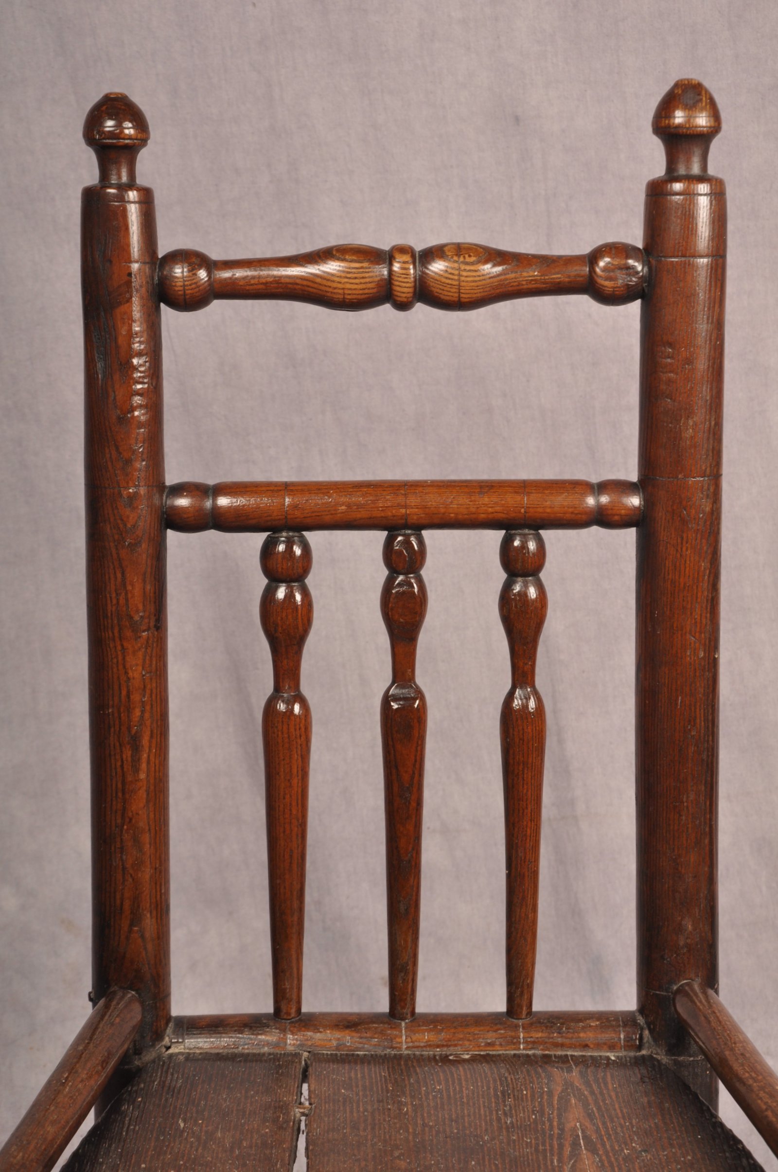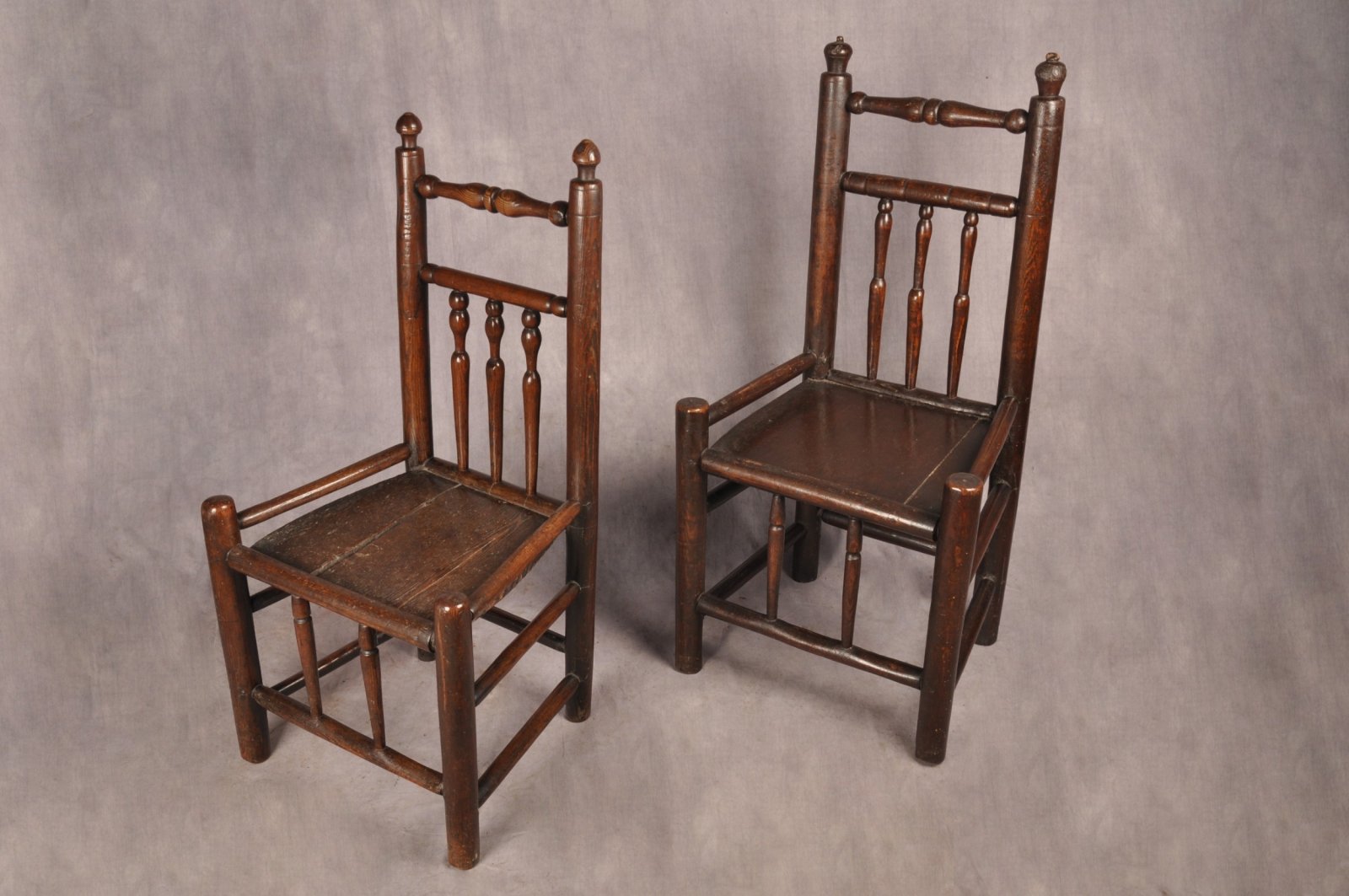 A near pair of rare 17th Century Ash Turners Chairs of wonderful colour with highly burnished surface. The smaller of the two is in perfect original condition and the other with repairs to the back legs and a small amount added to the front feet. Both Chairs are in good solid order.